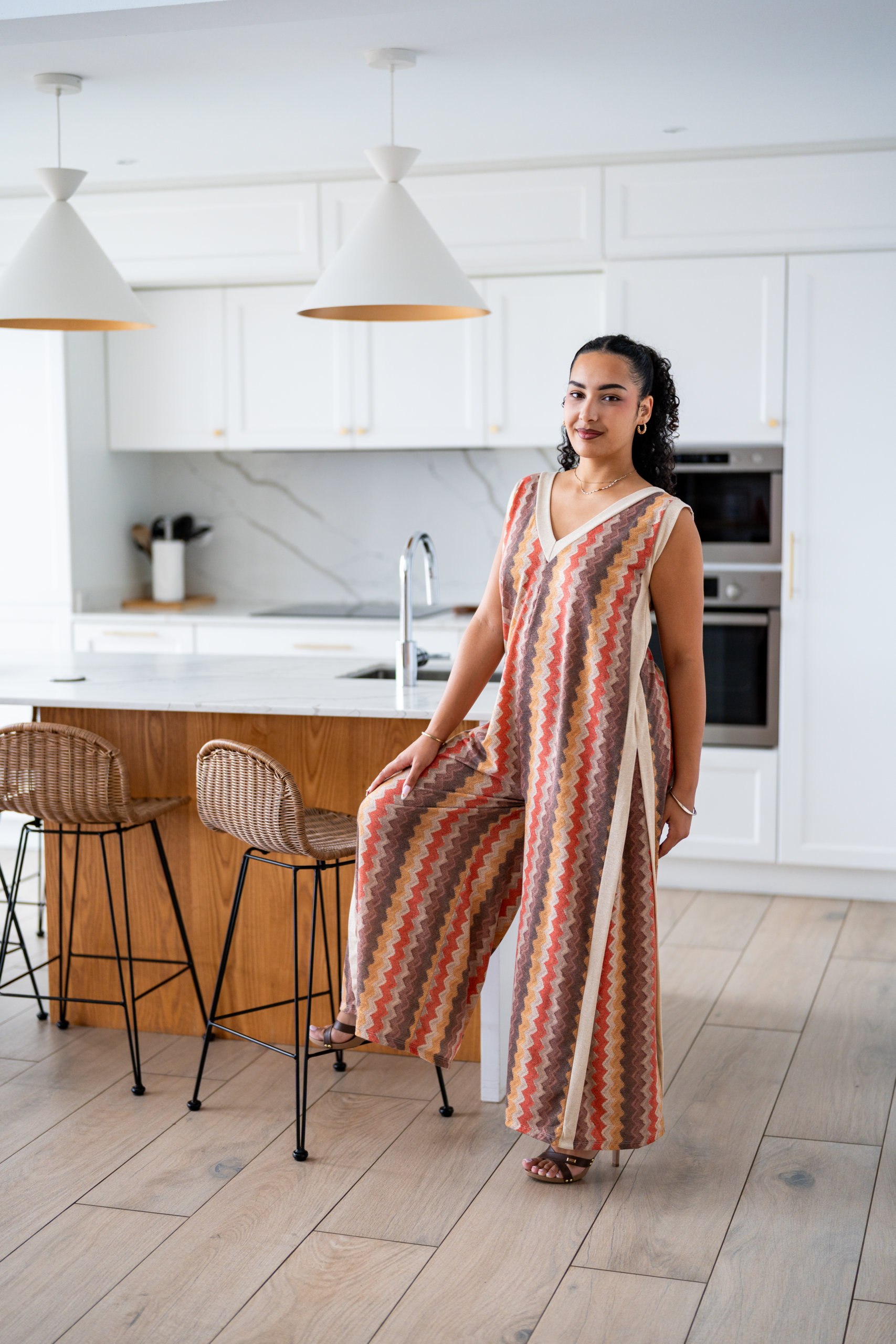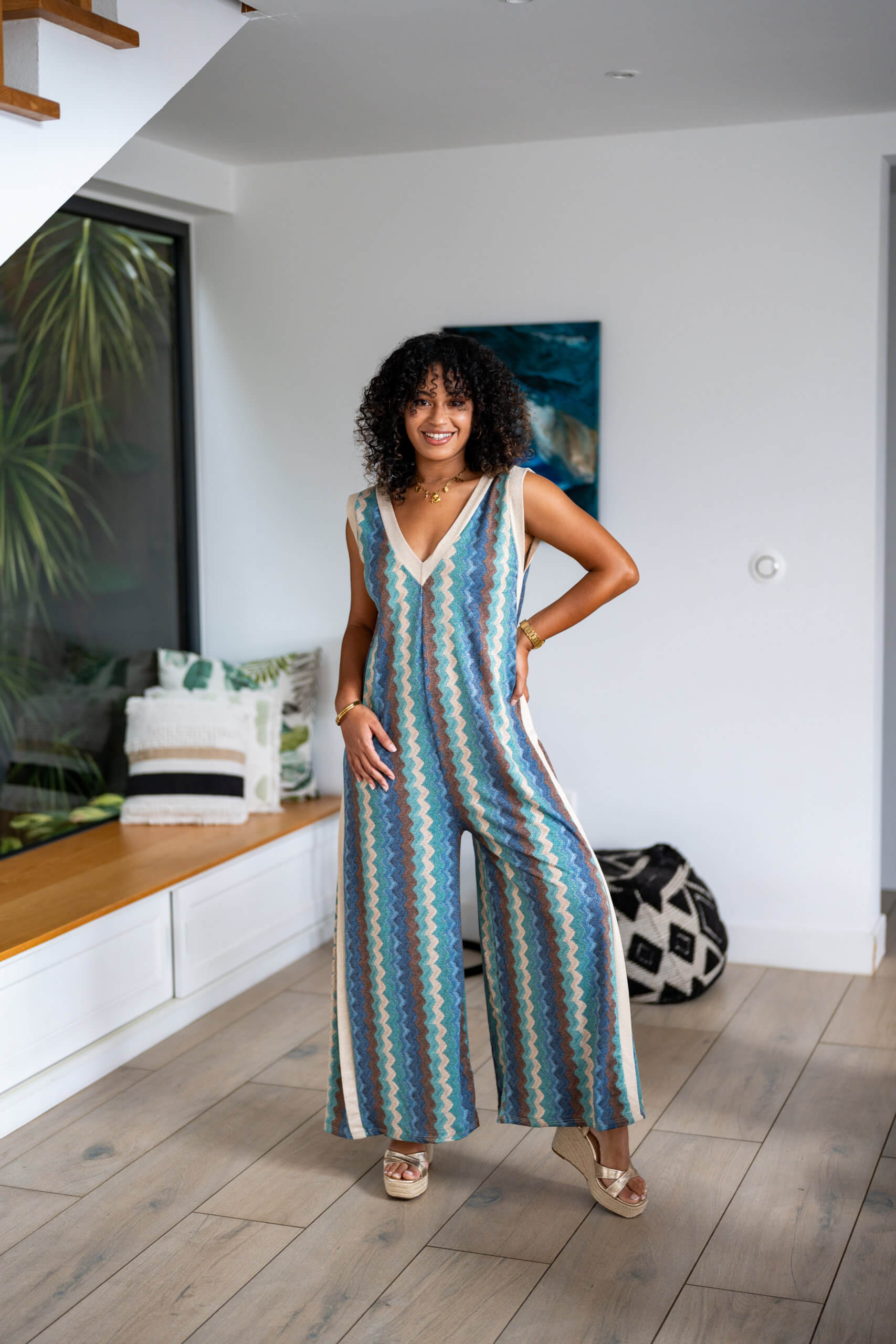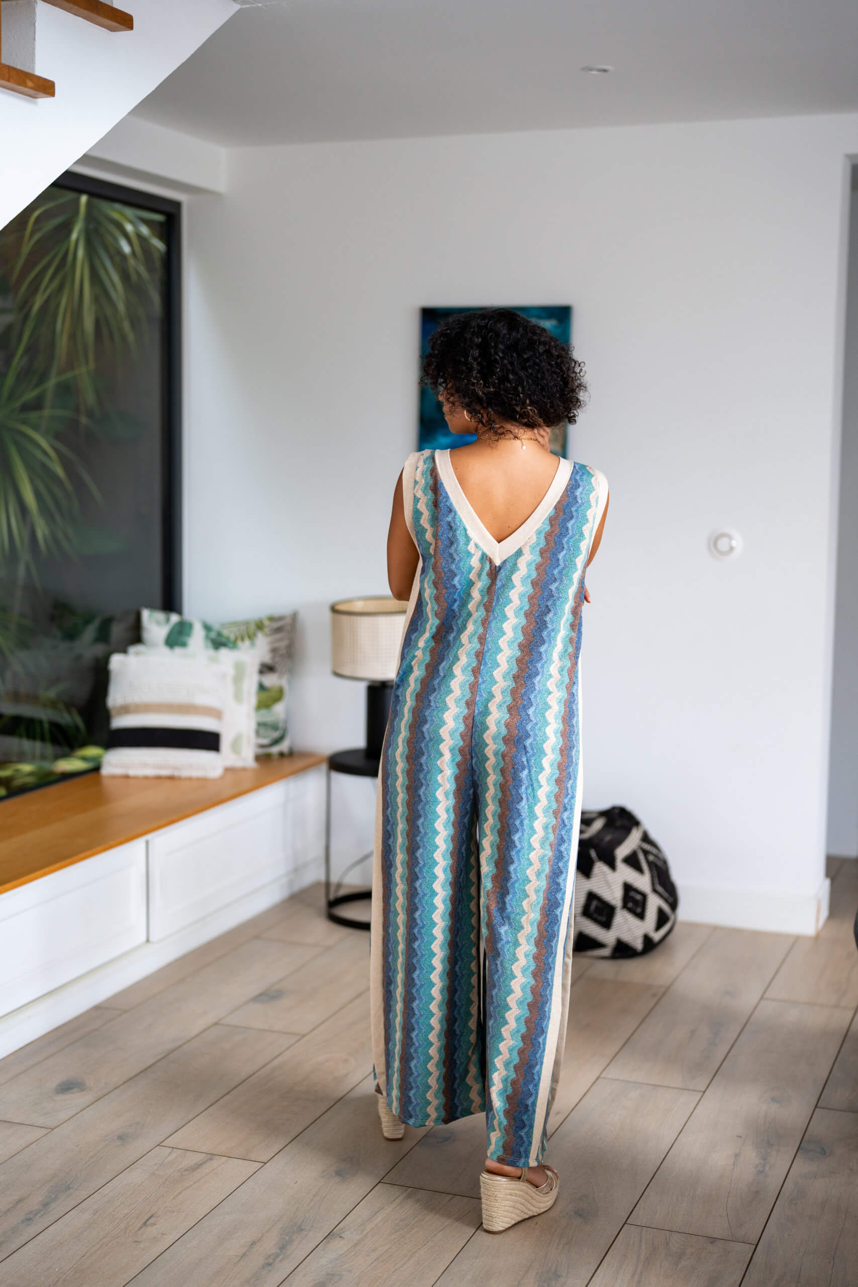 Combinaison longue sans manches avec un style bas large, dans son imprimé brillant et avec son liserai au niveau de son col en V.
