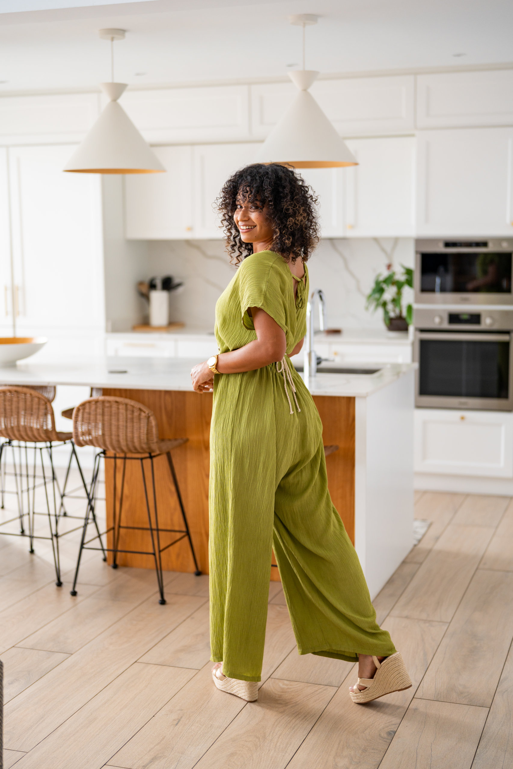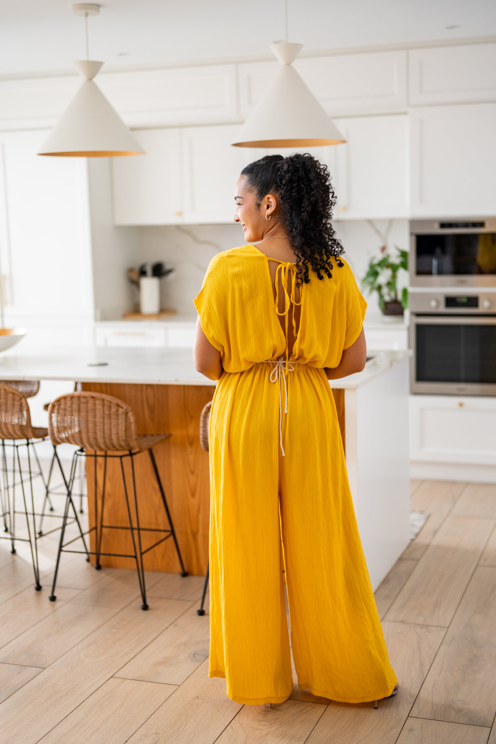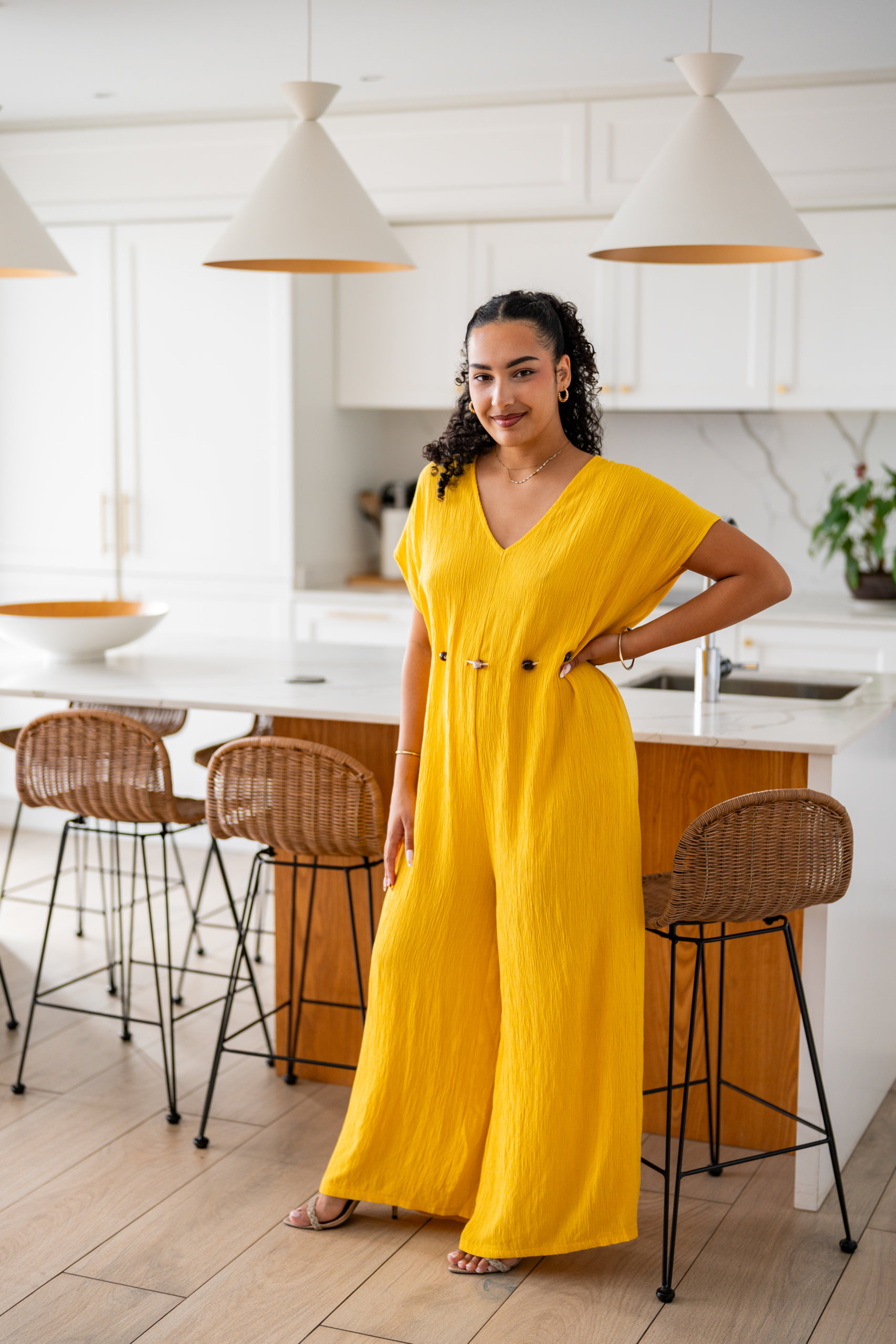 Combinaison longue à manches courtes dans un style bas largue. Elle a une attache au dos en plus de sa ceinture bijoux en corde.
