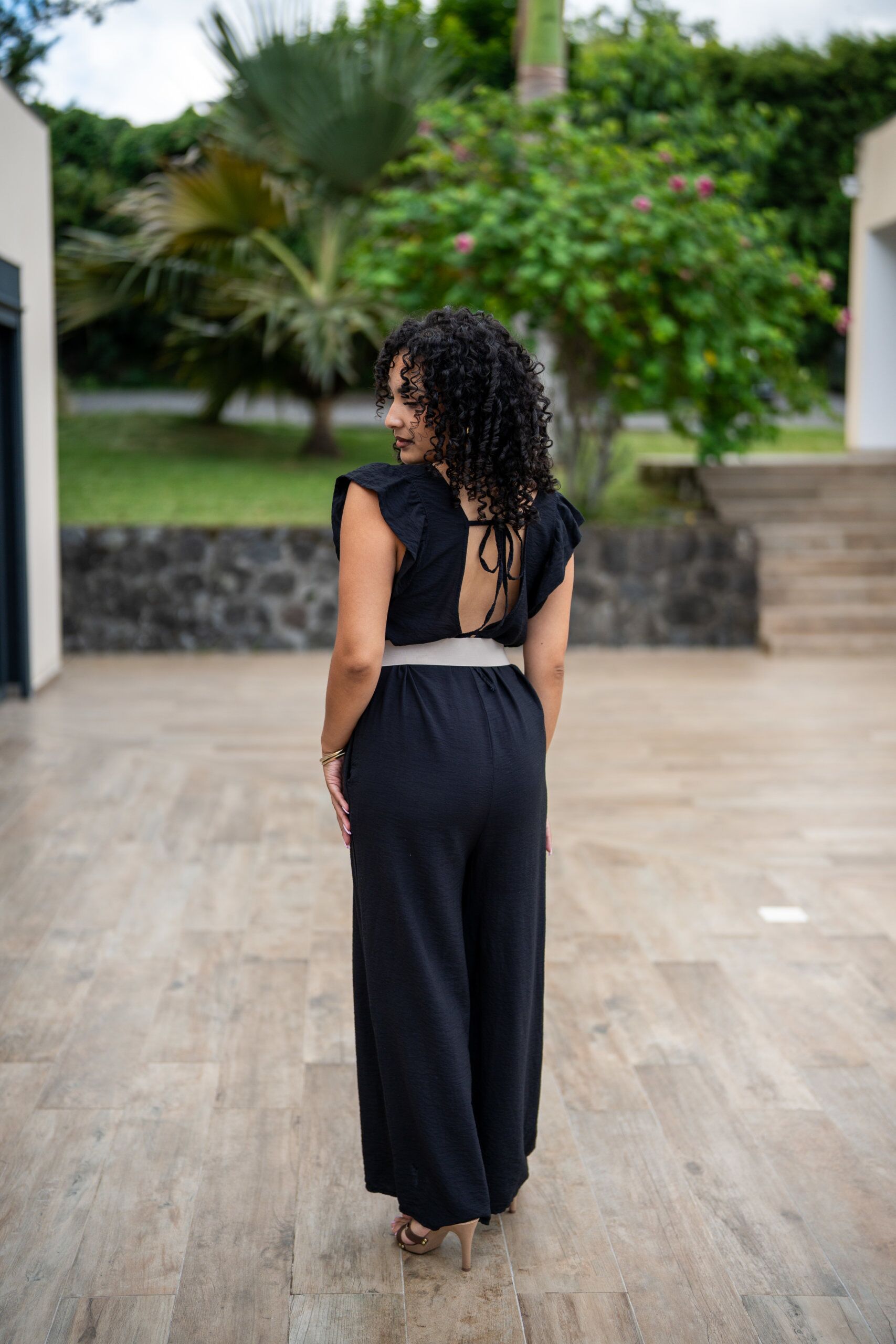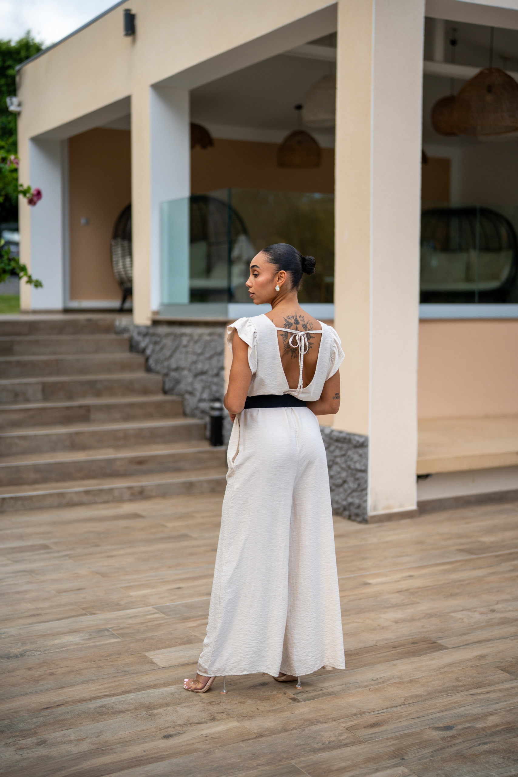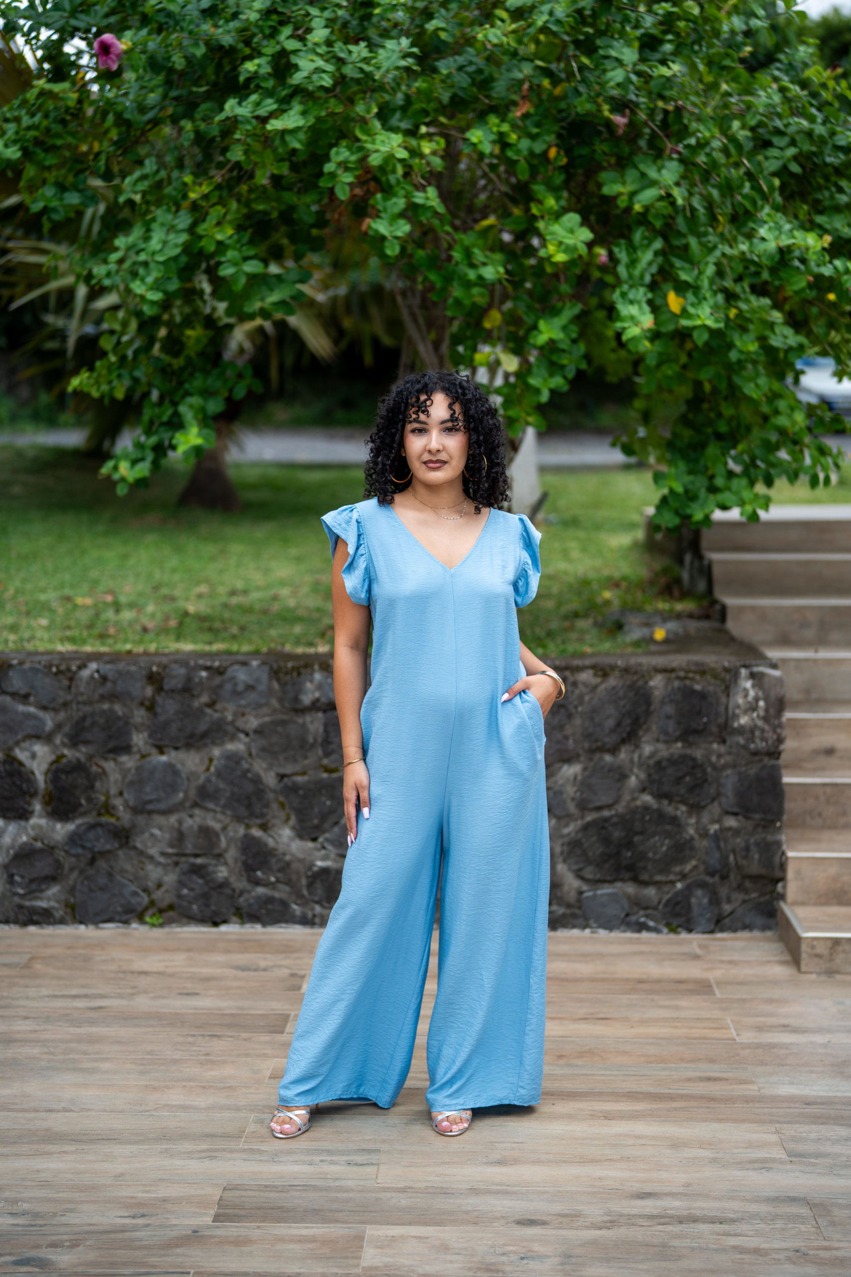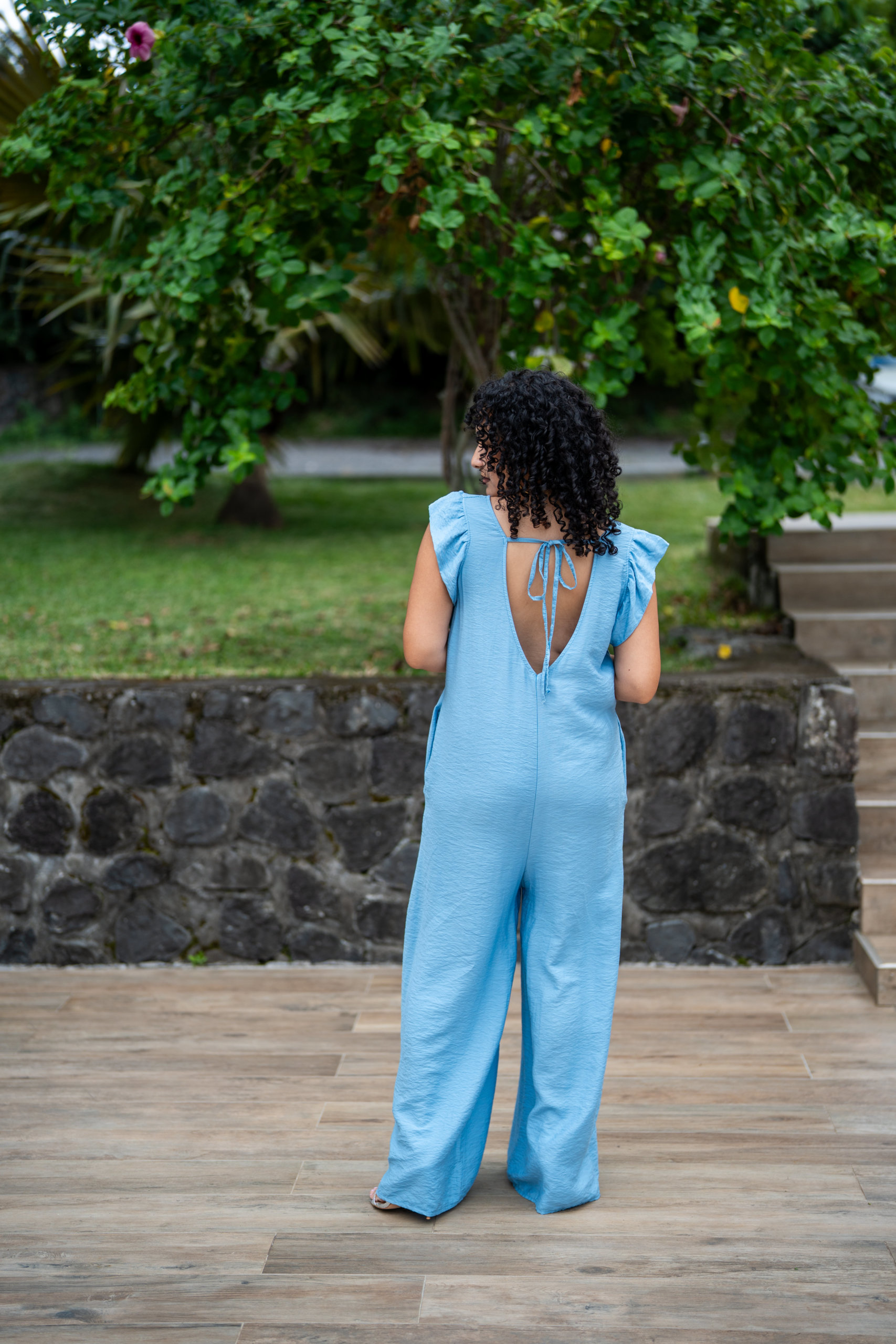 Combinaison pantalon unie avec ses manches courtes. volantes et son noeud au dos.