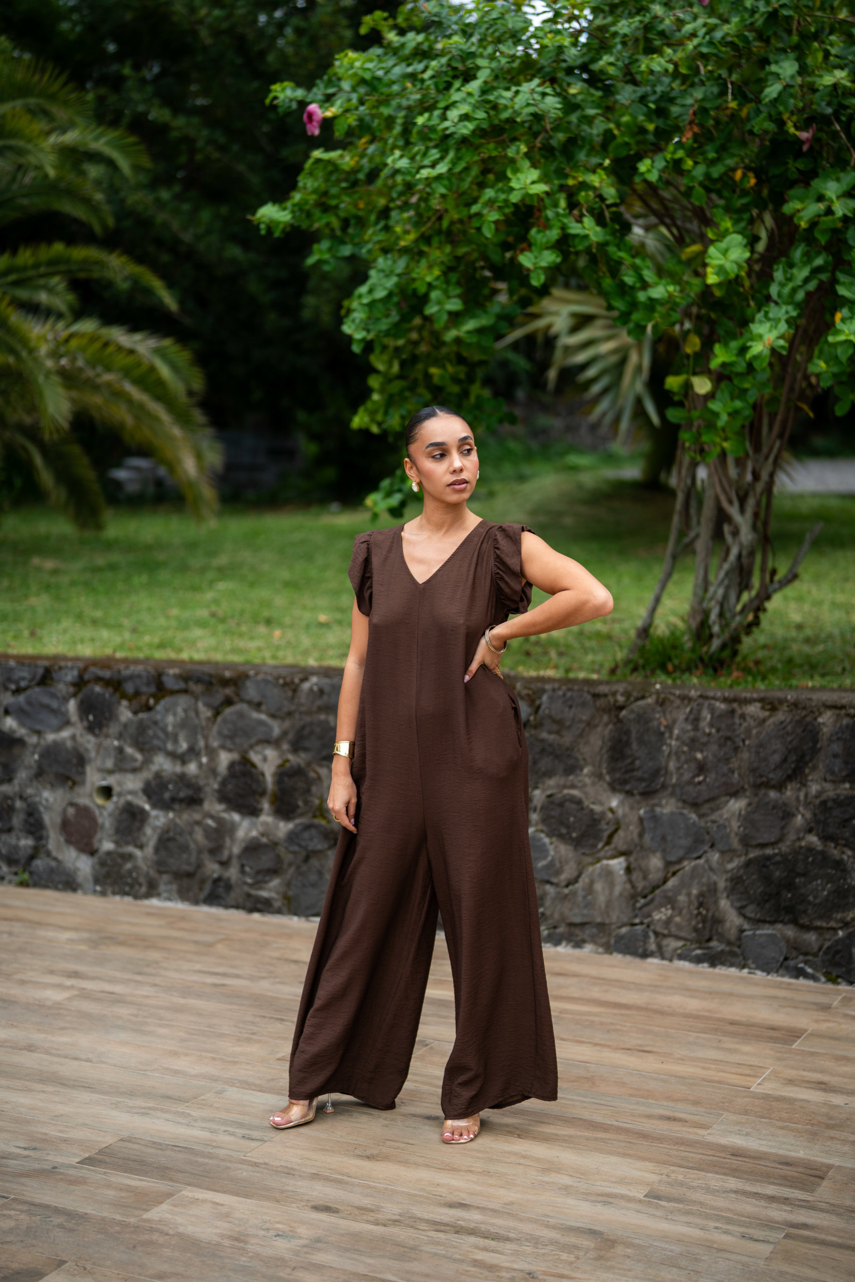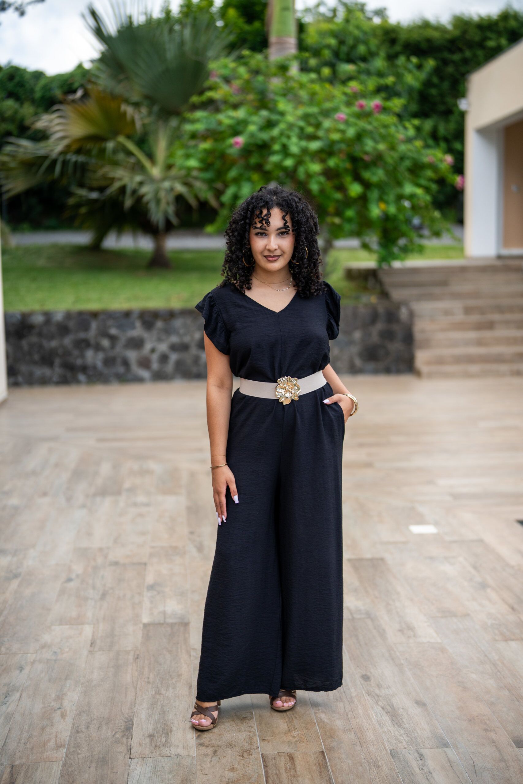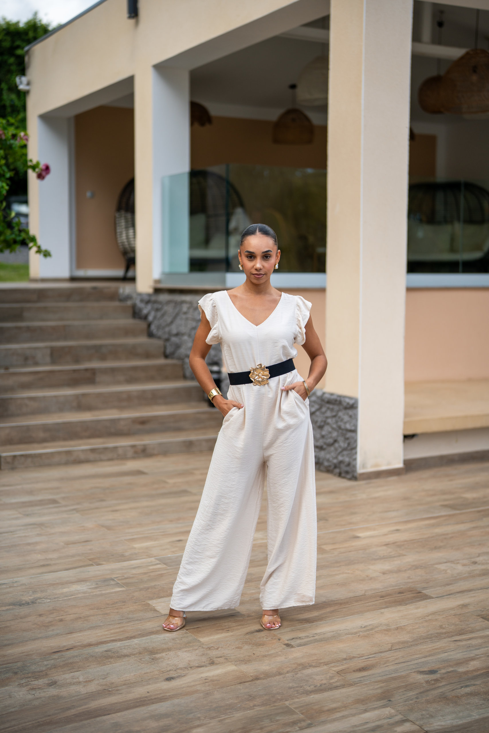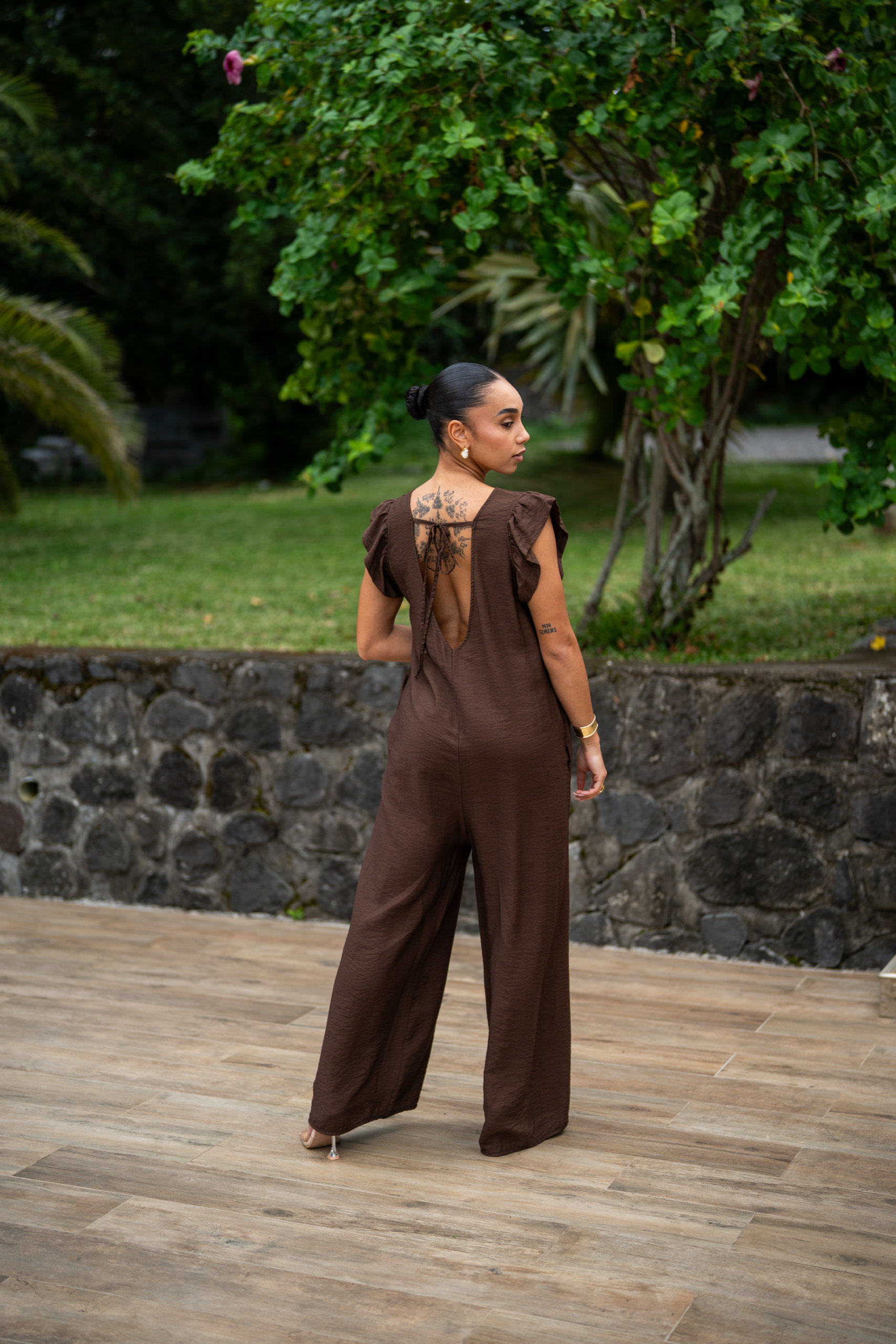 Combinaison pantalon unie avec ses manches courtes. volantes et son noeud au dos.