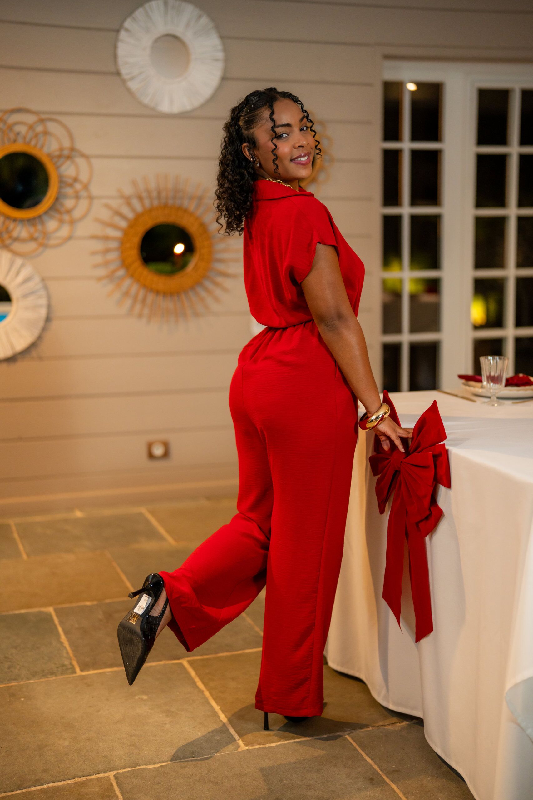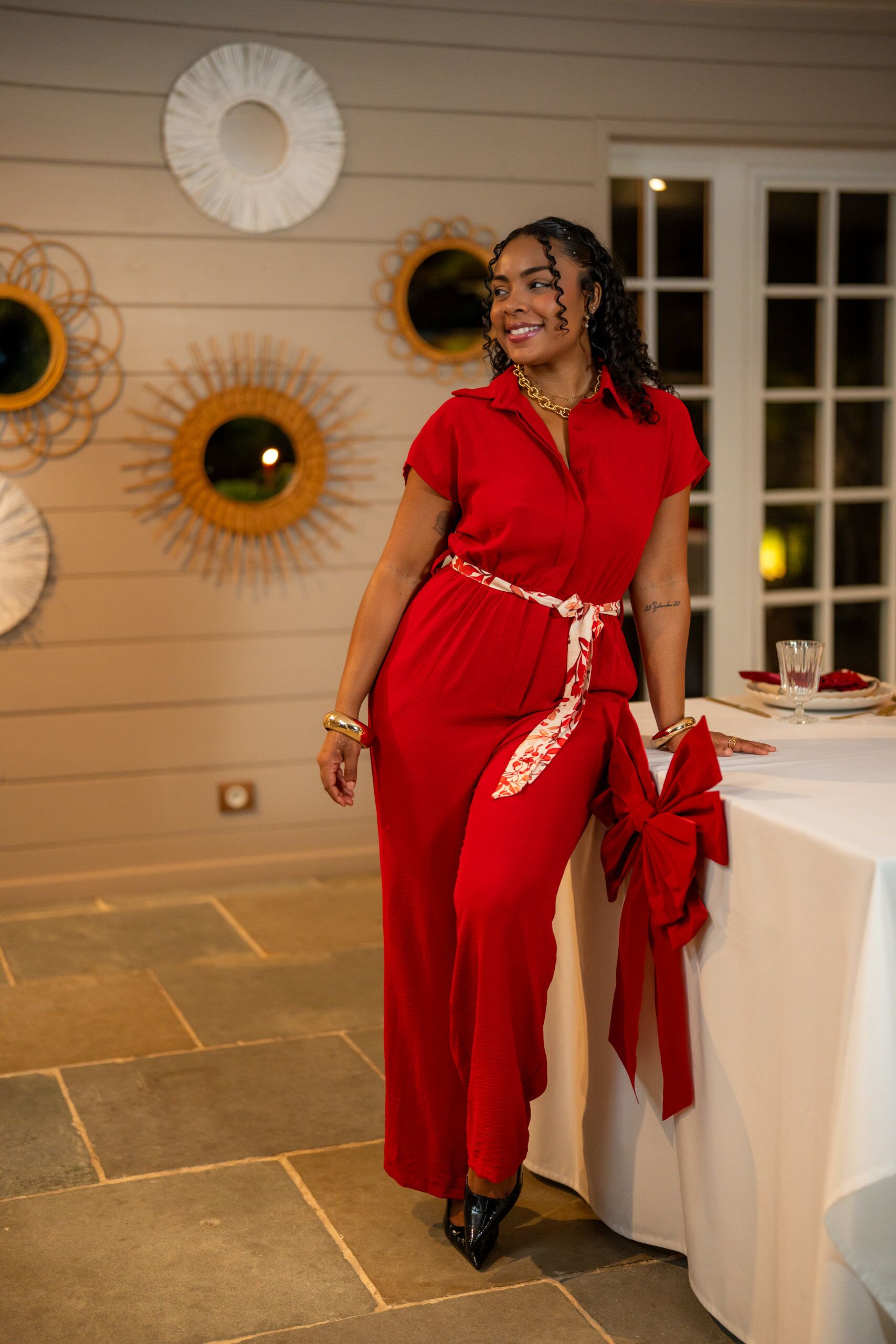 Combinaison pantalon à manches courtes, avec son col en chemisier et ses poches. Elle est fournit avec sa ceinture.