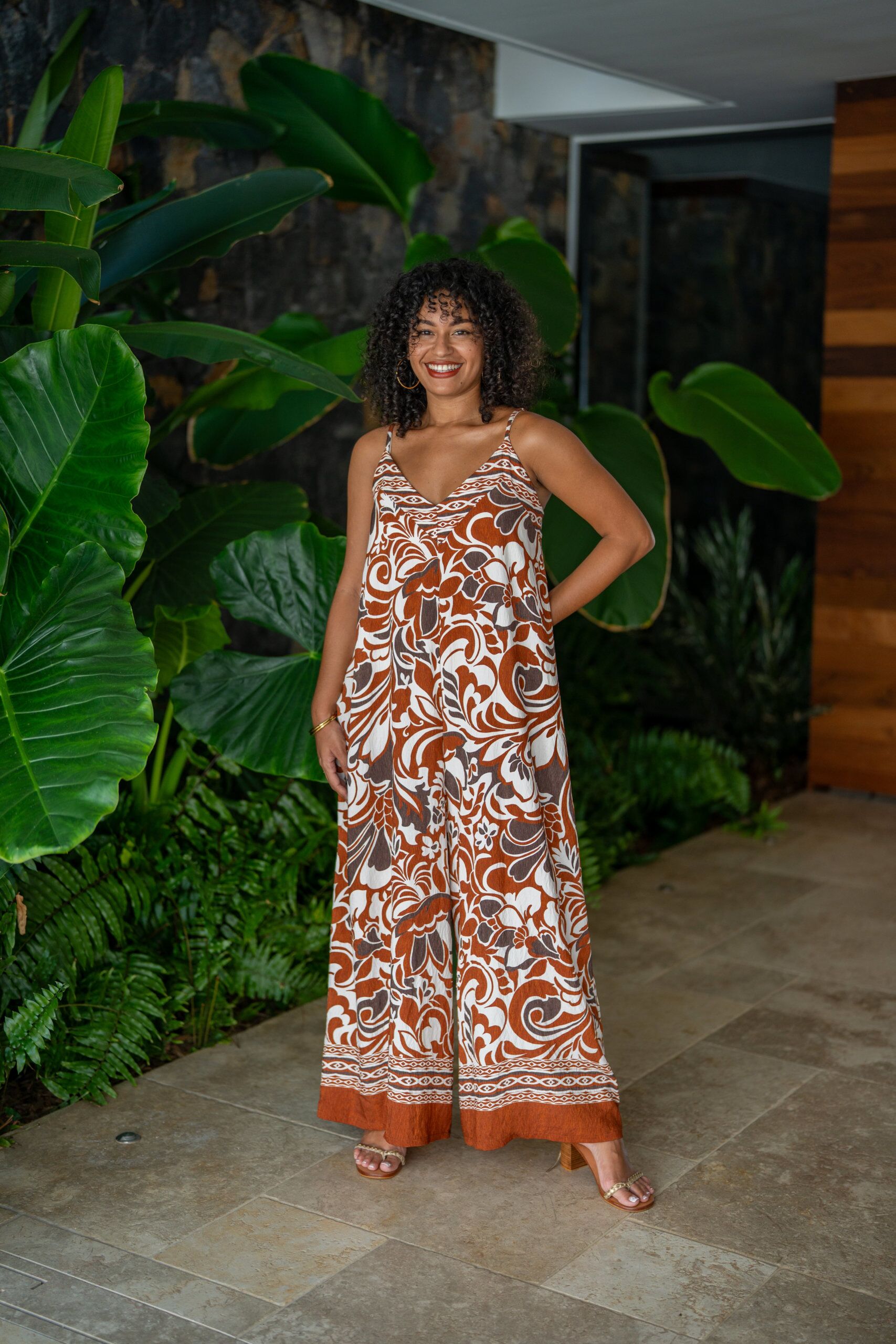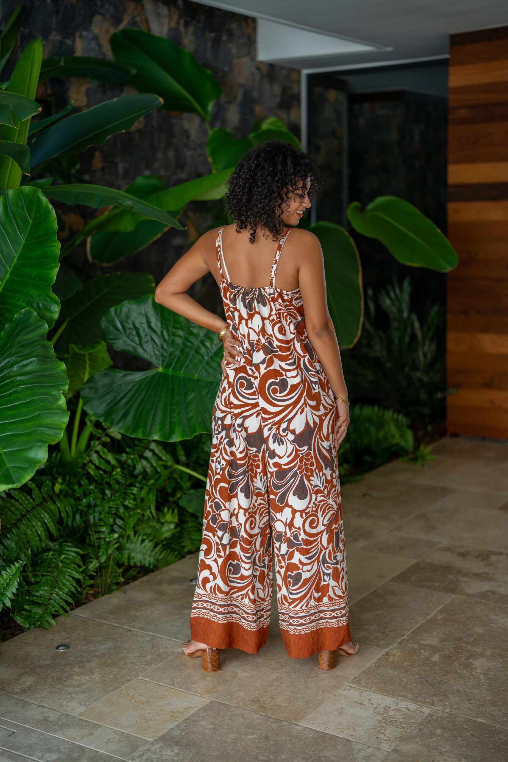 Combinaison pantalon imprimée, à bretelles, élastiquée au dos.