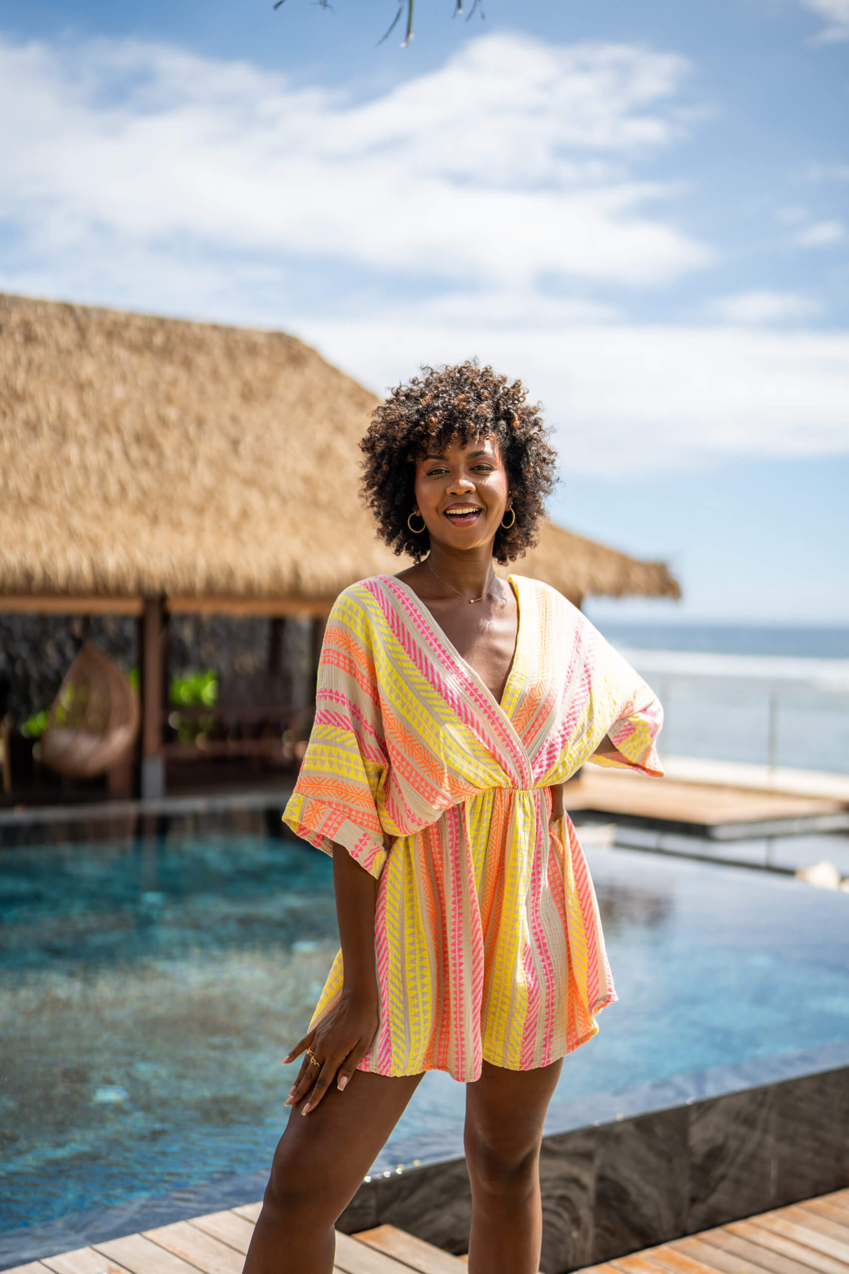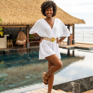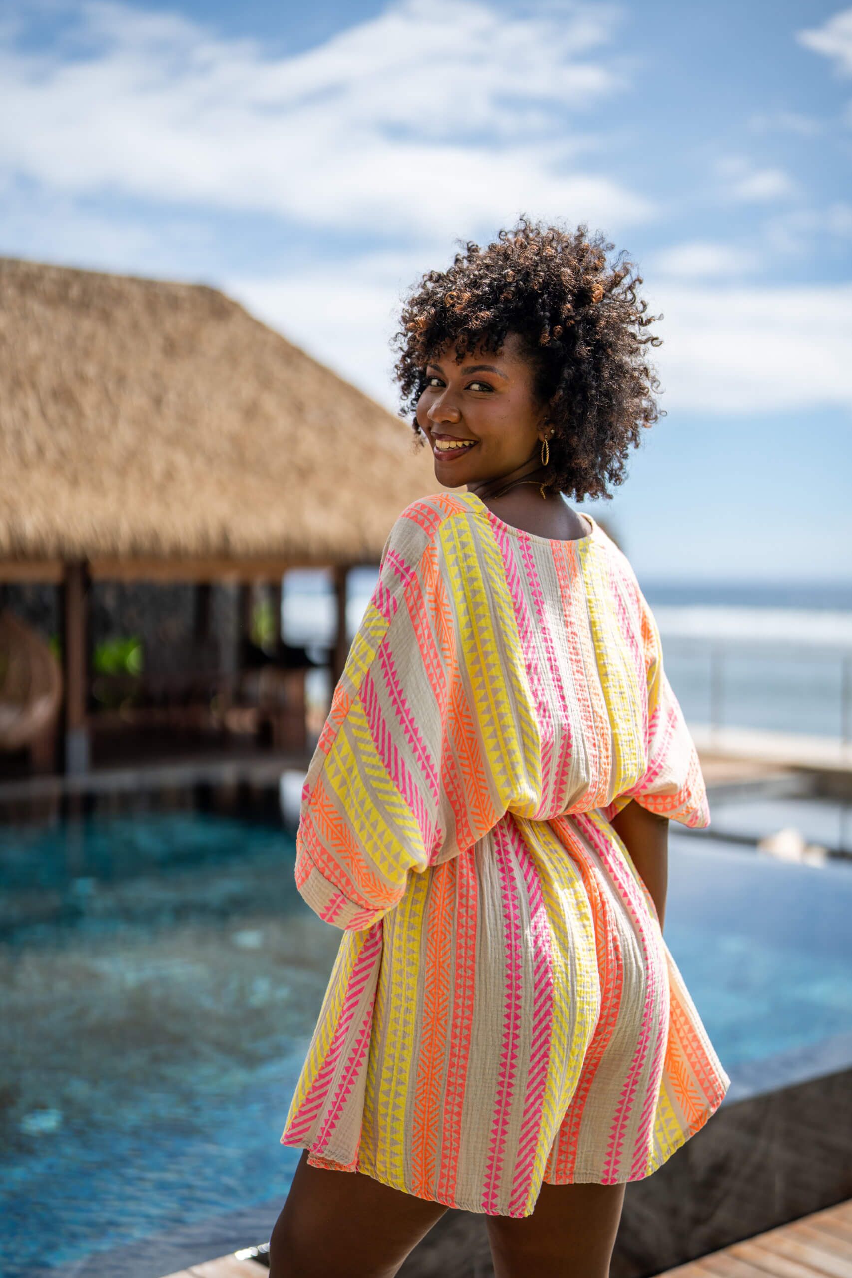 Combinaison short imprimée “collection aztèque”, élastiquée à la taille avec son col en V et ses manches mi longue. Dans une matière en gaze de coton, elle est agréable et légère à porter.