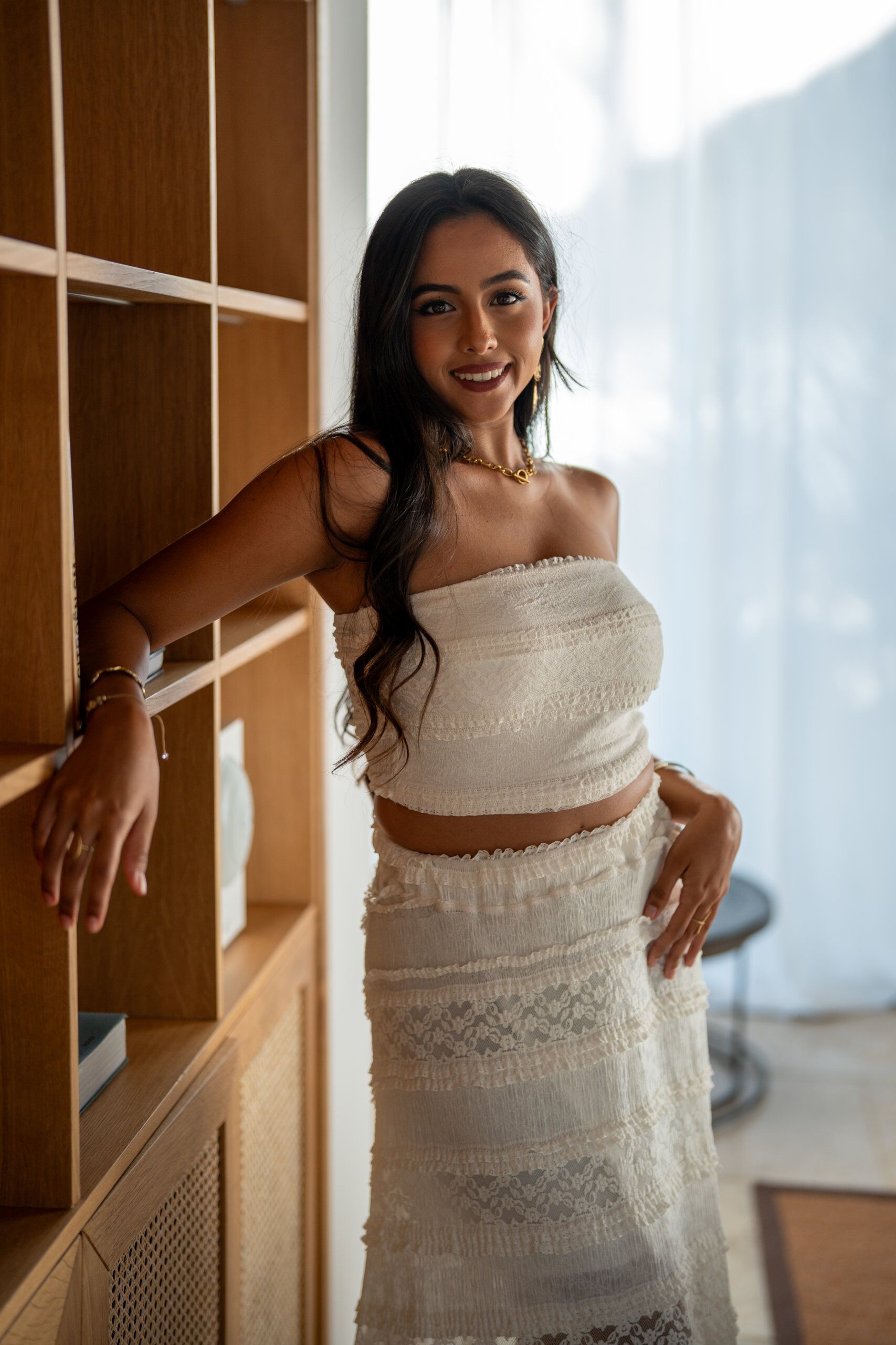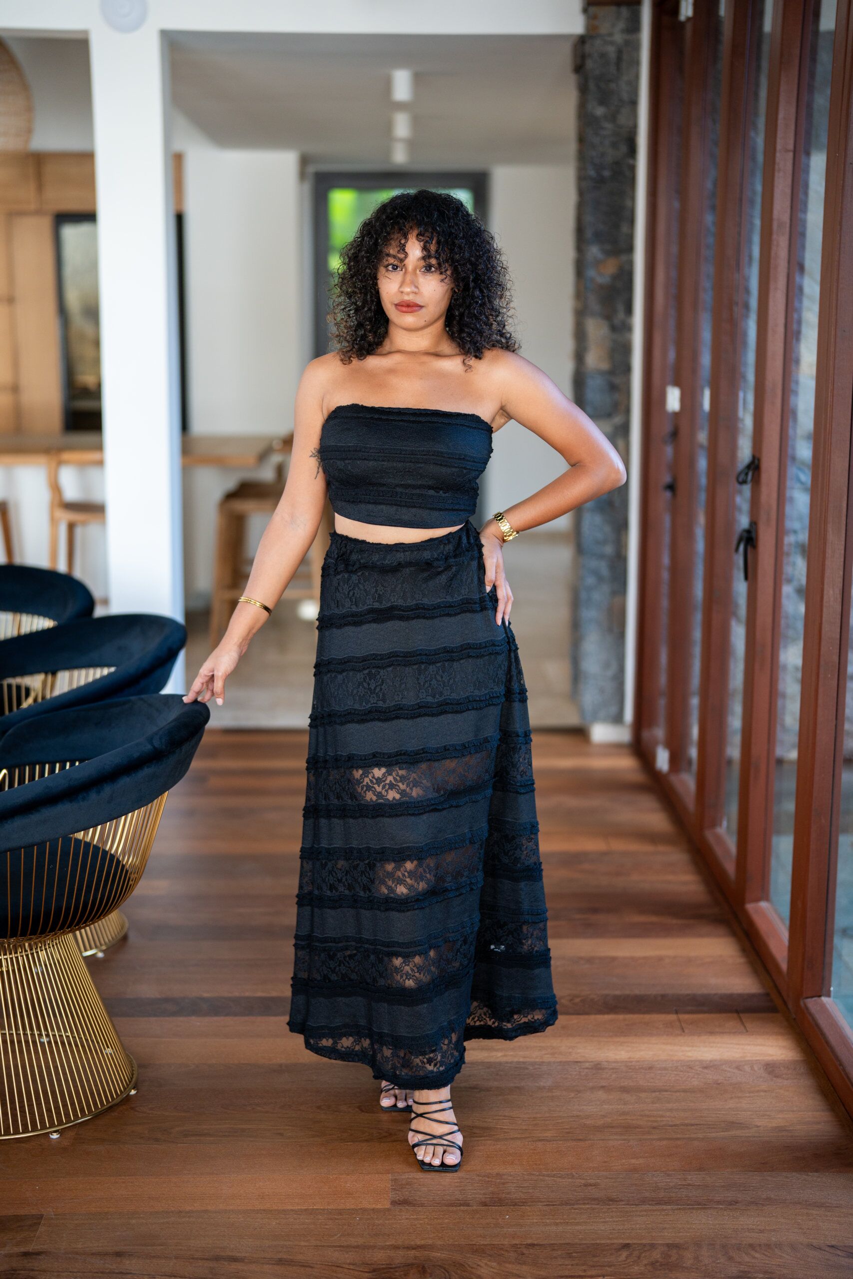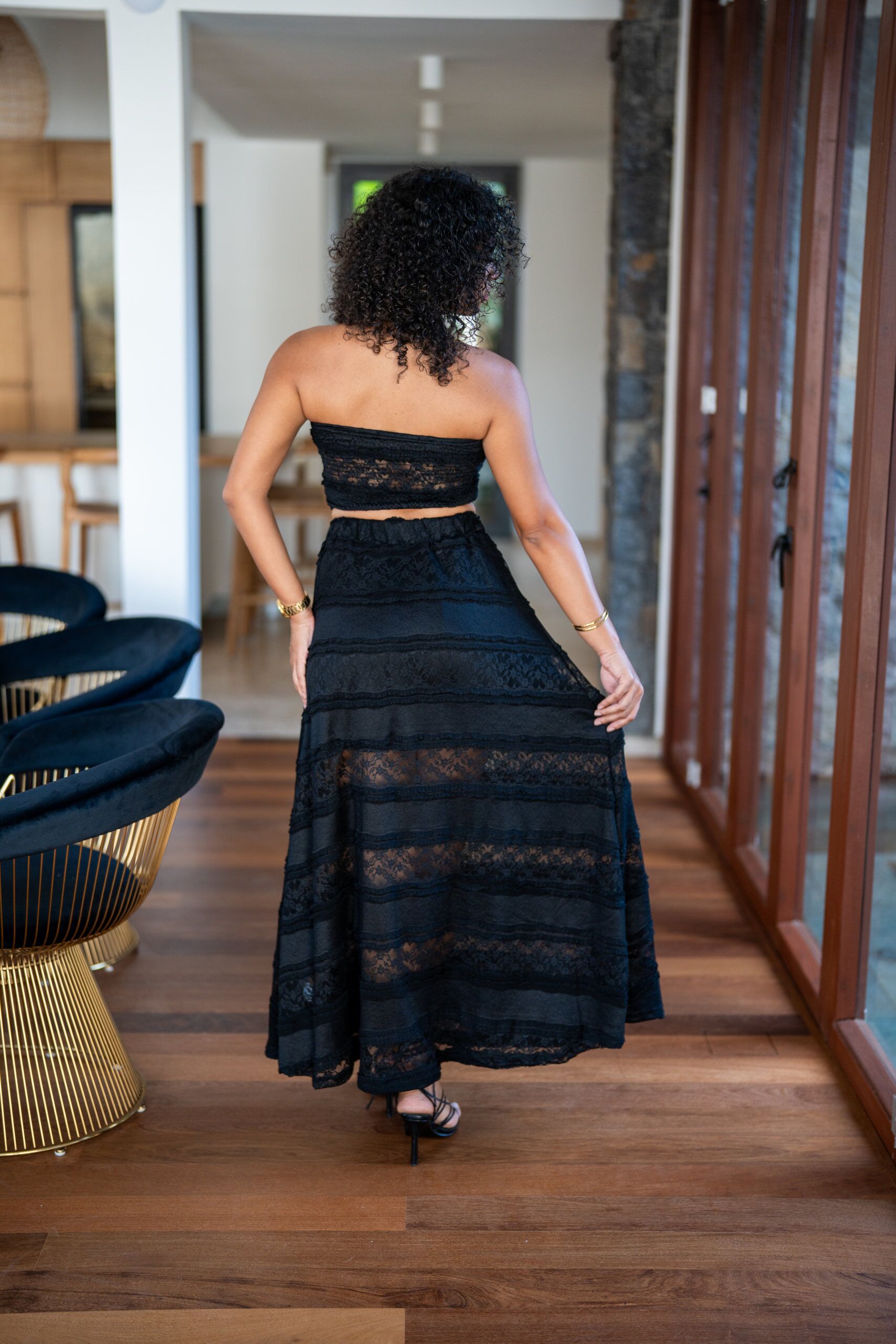 Ensemble jupe en dentelle, avec son haut bustier doublé et sa jupe longue fluide doublée d’un jupon court.
