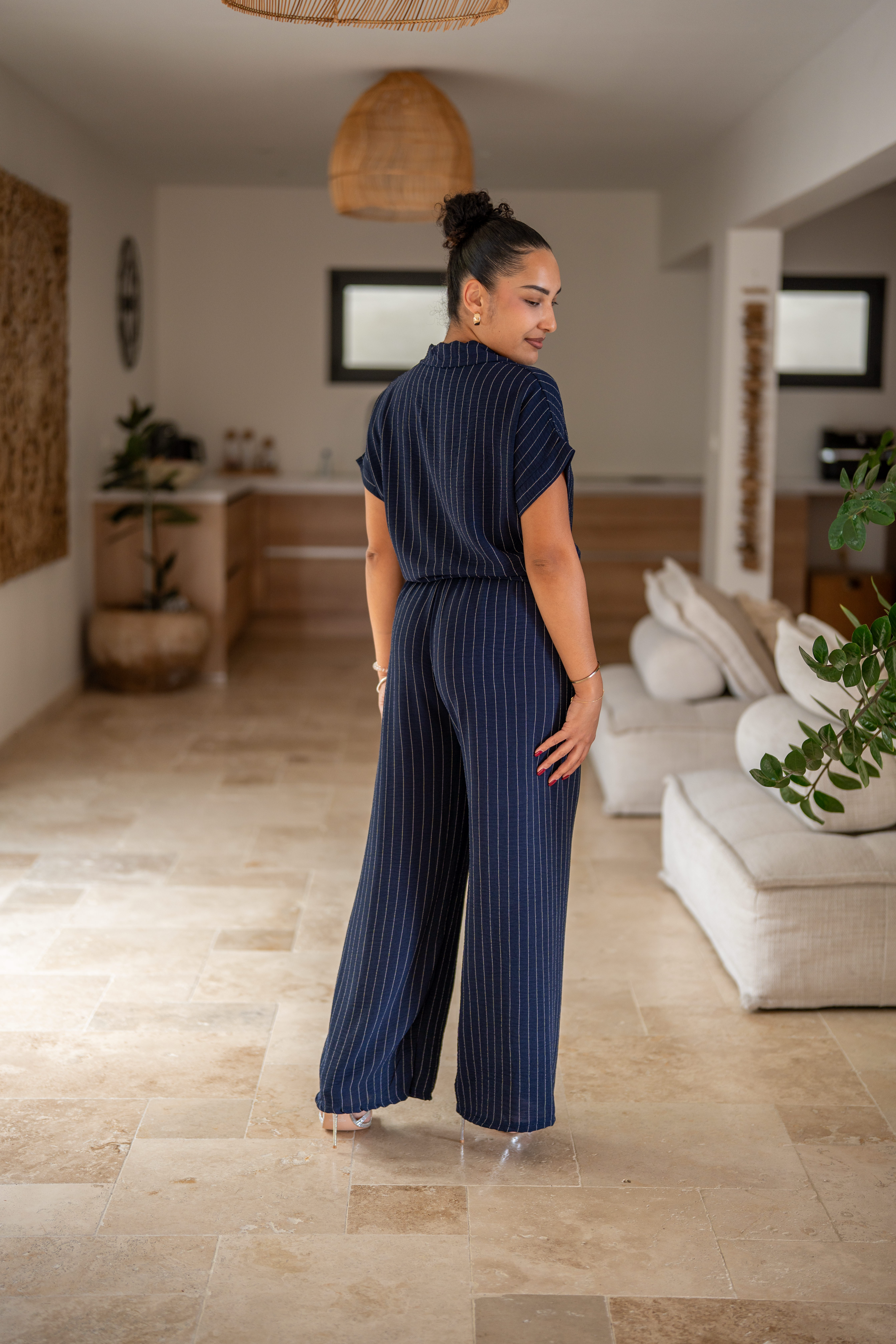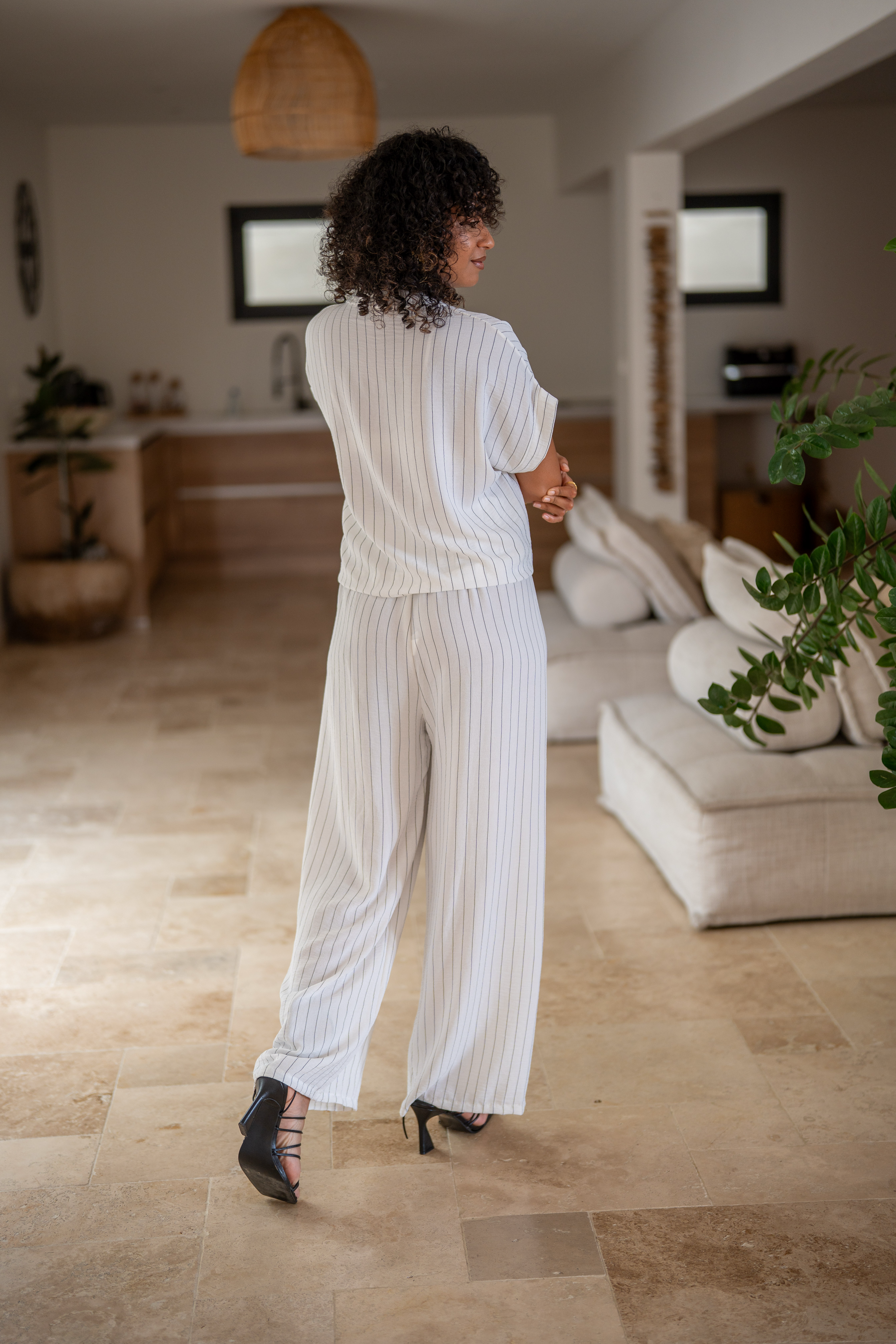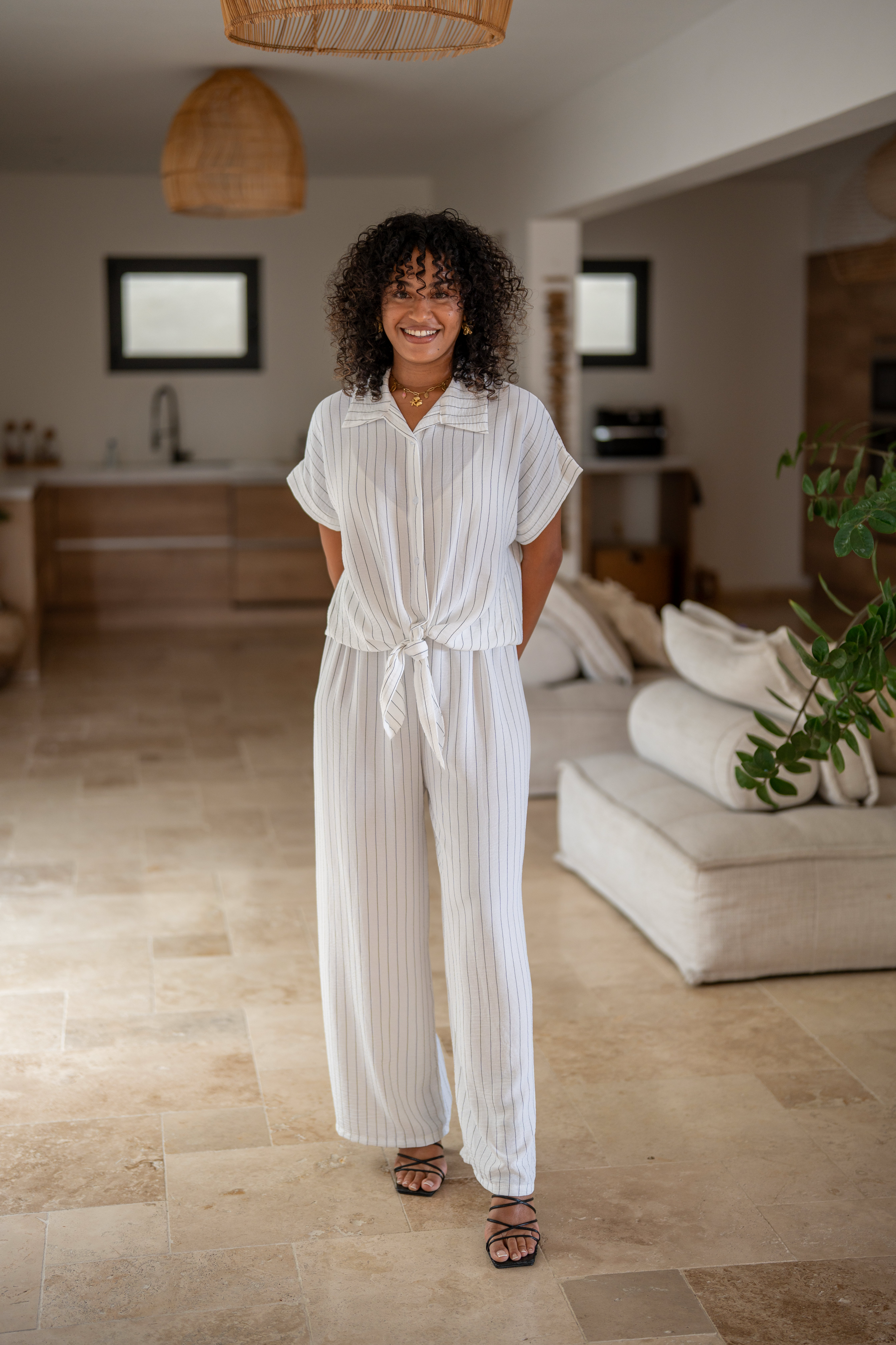 Ensemble pantalon à rayures, avec son chemisier et son pantalon réglables.