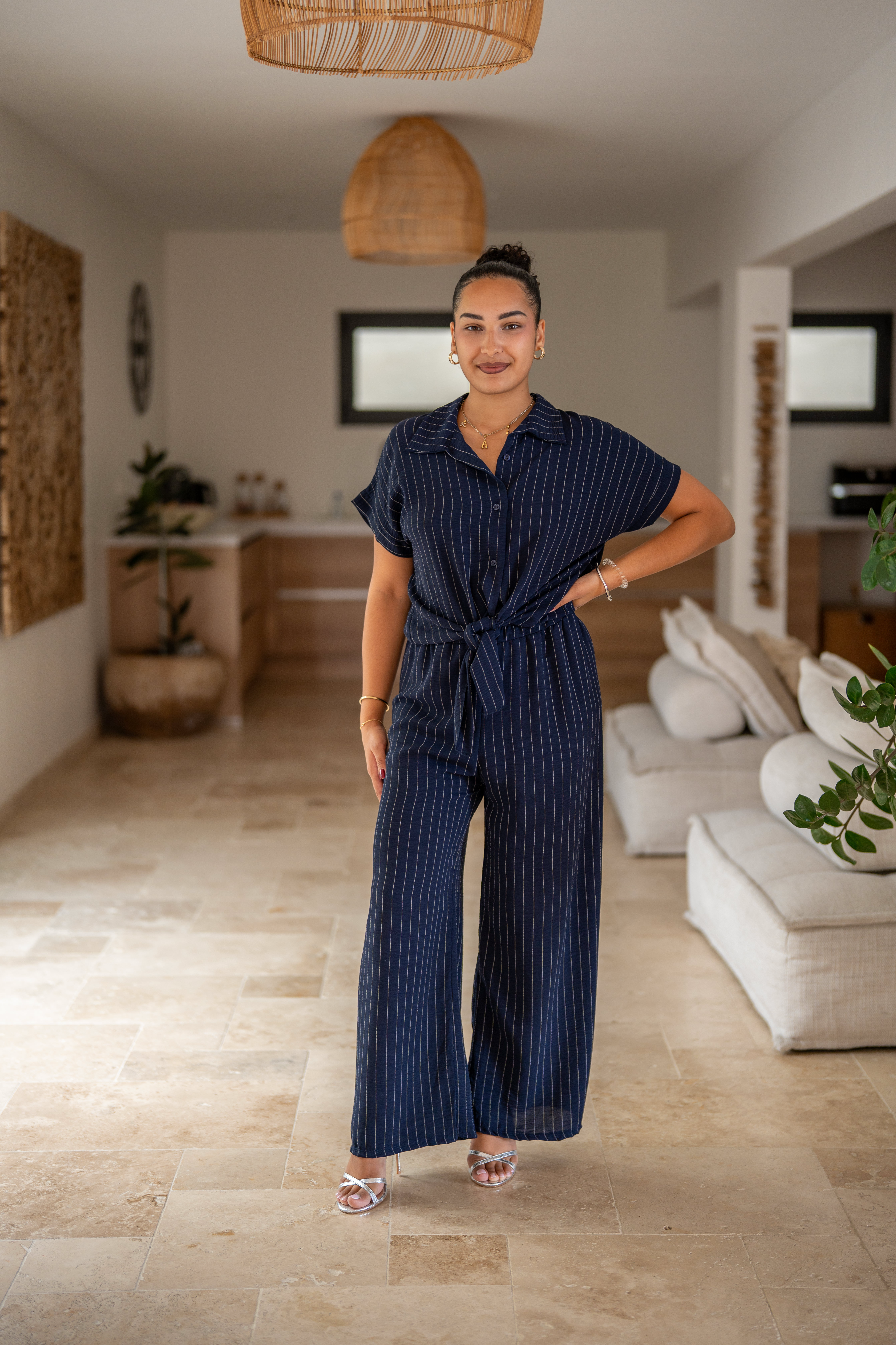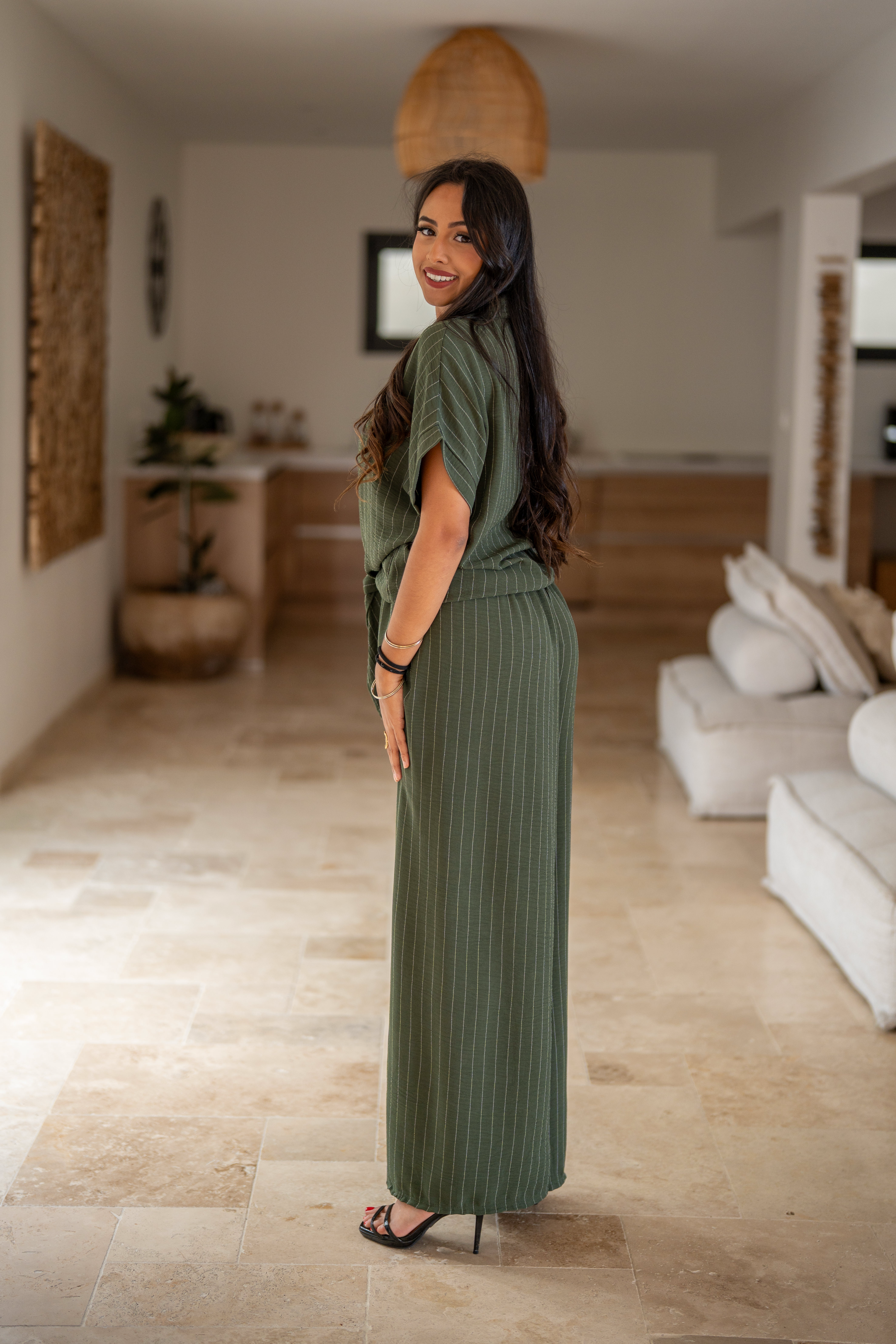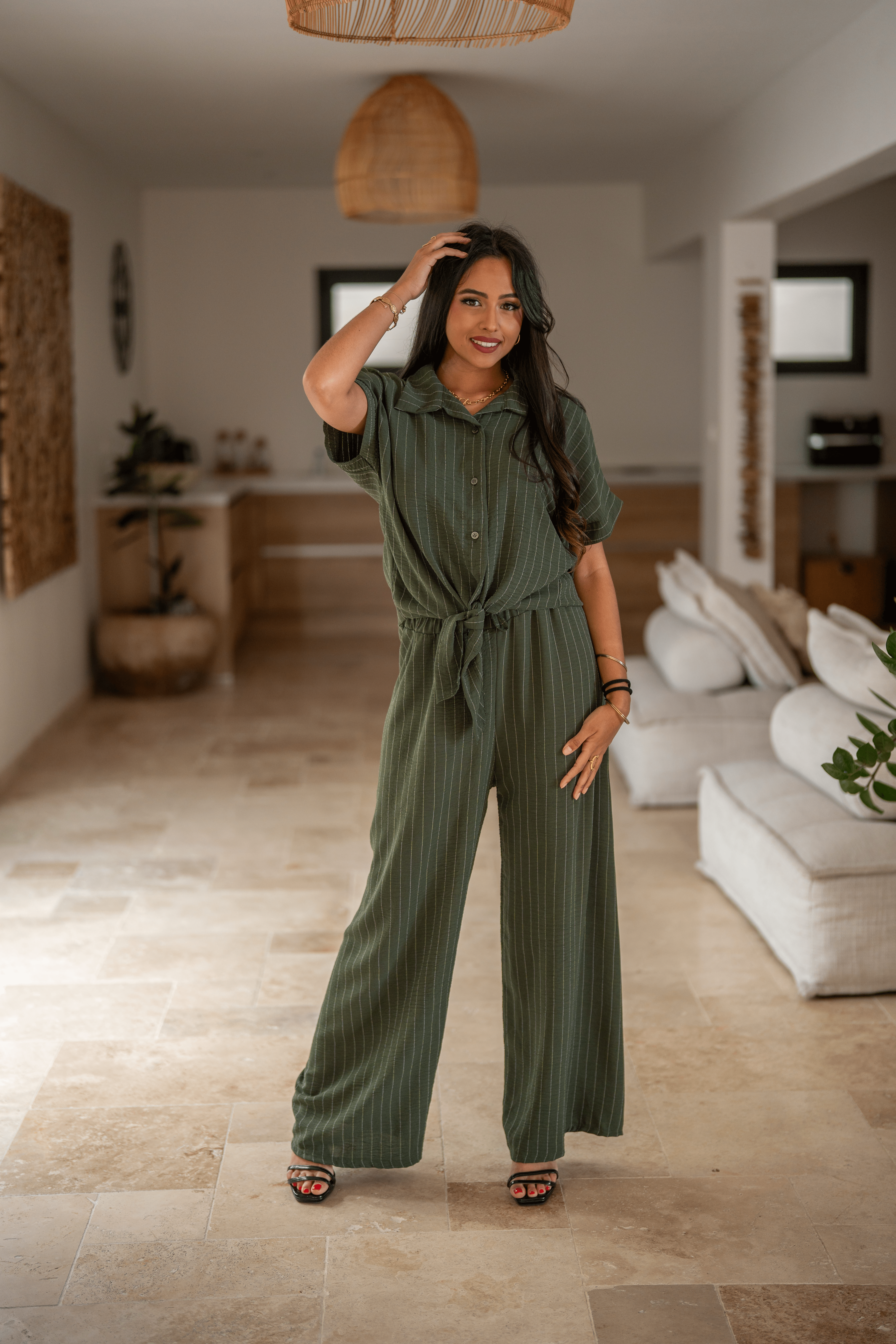 Ensemble pantalon à rayures, avec son chemisier et son pantalon réglables.