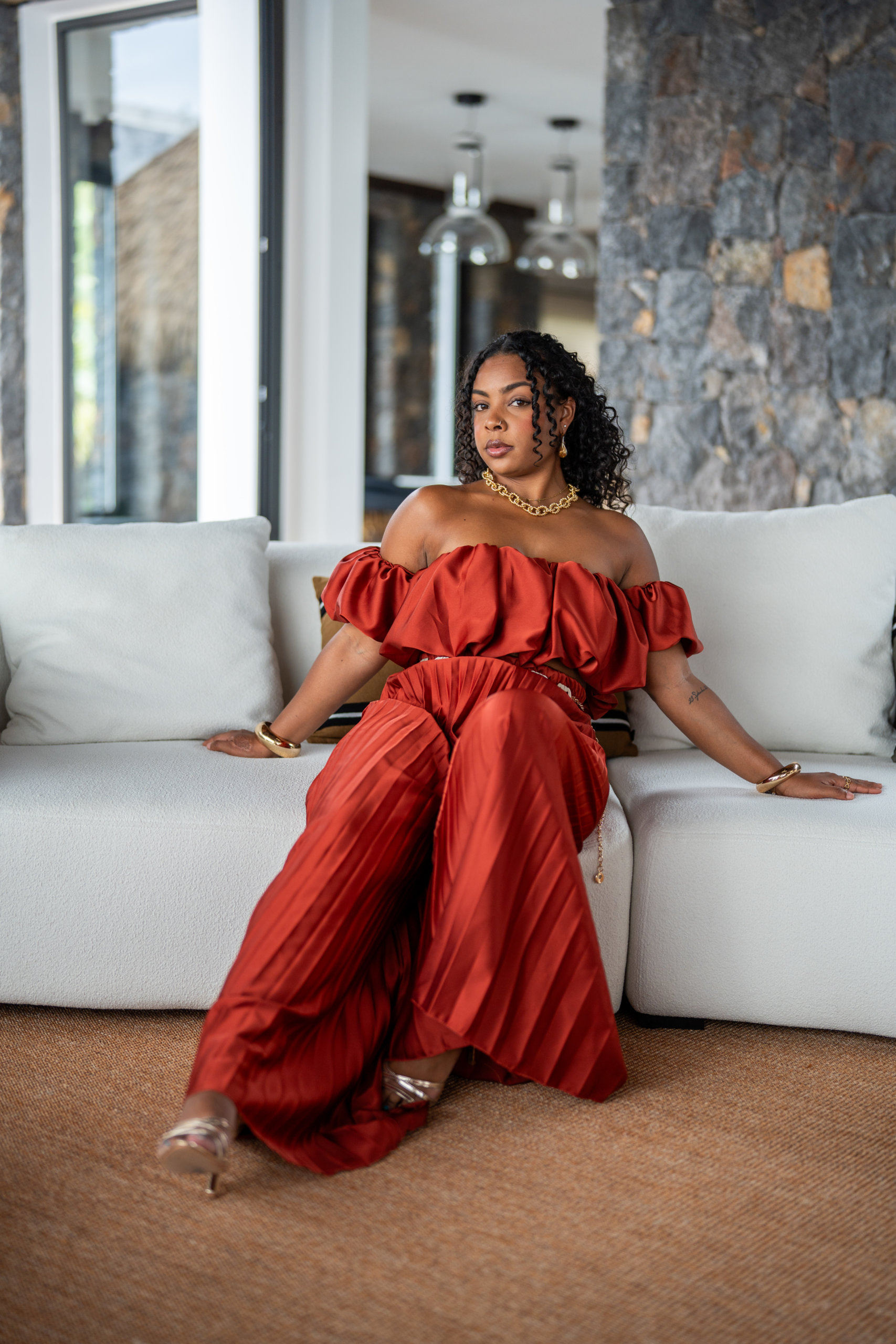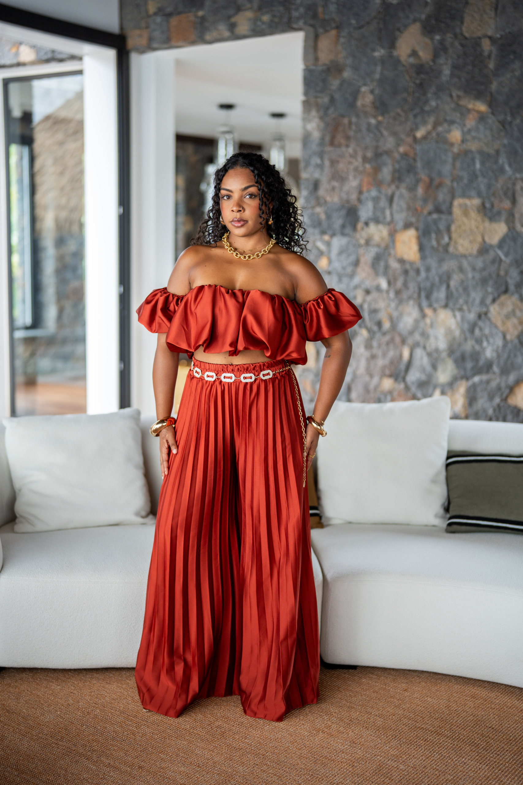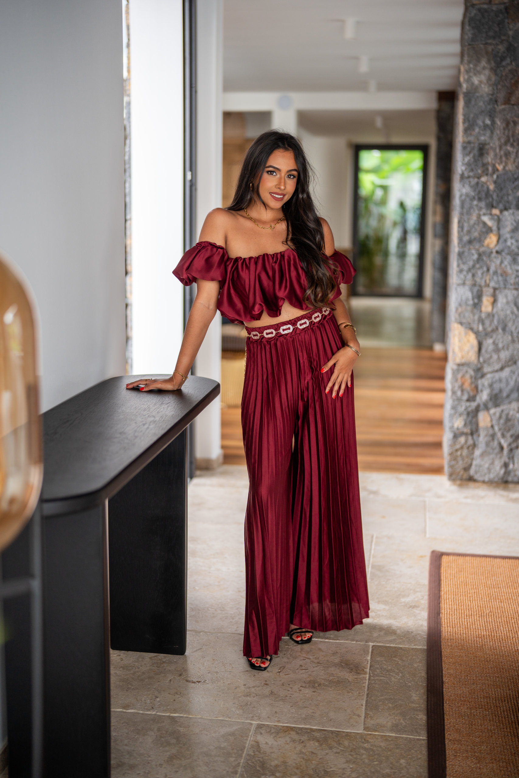 Ensemble pantalon satiné avec son crop top effet volant et son pantalon plissé.