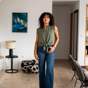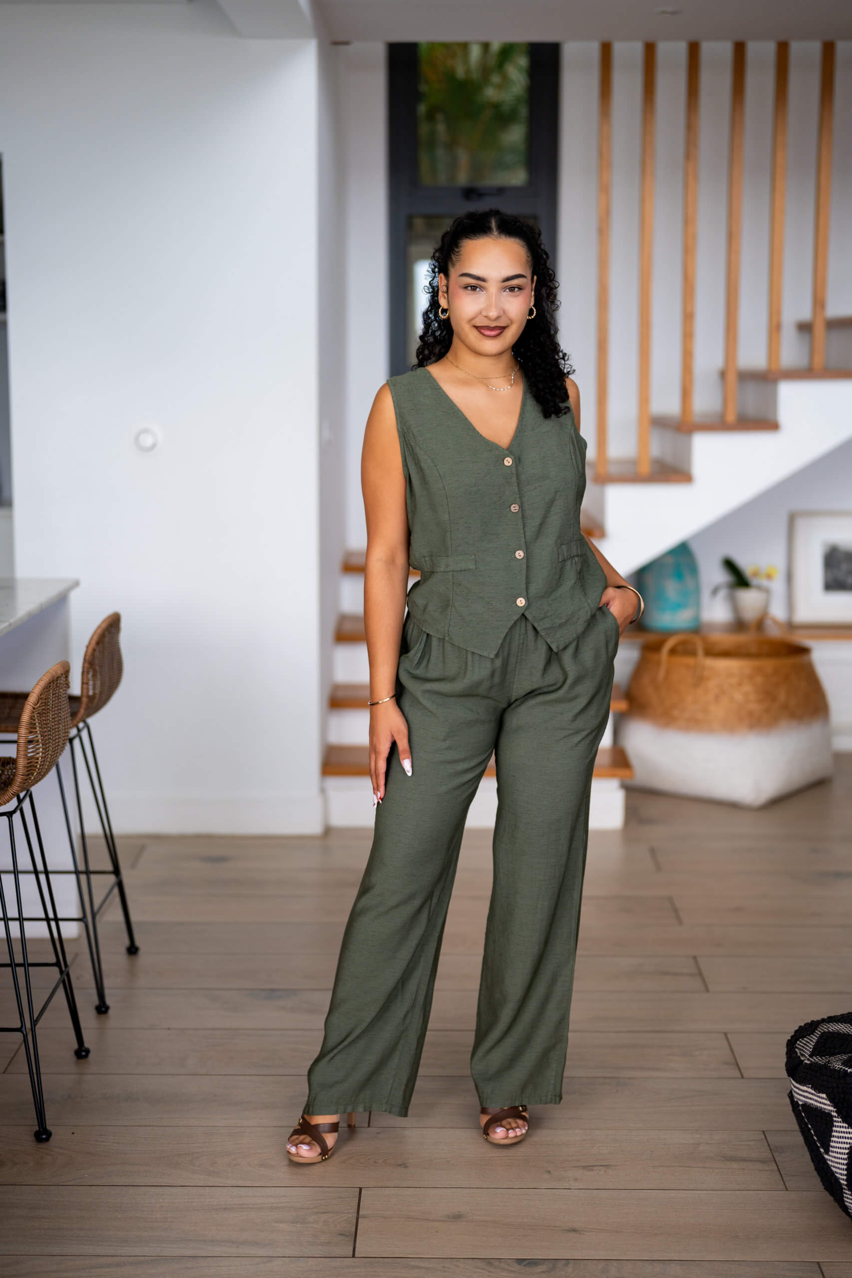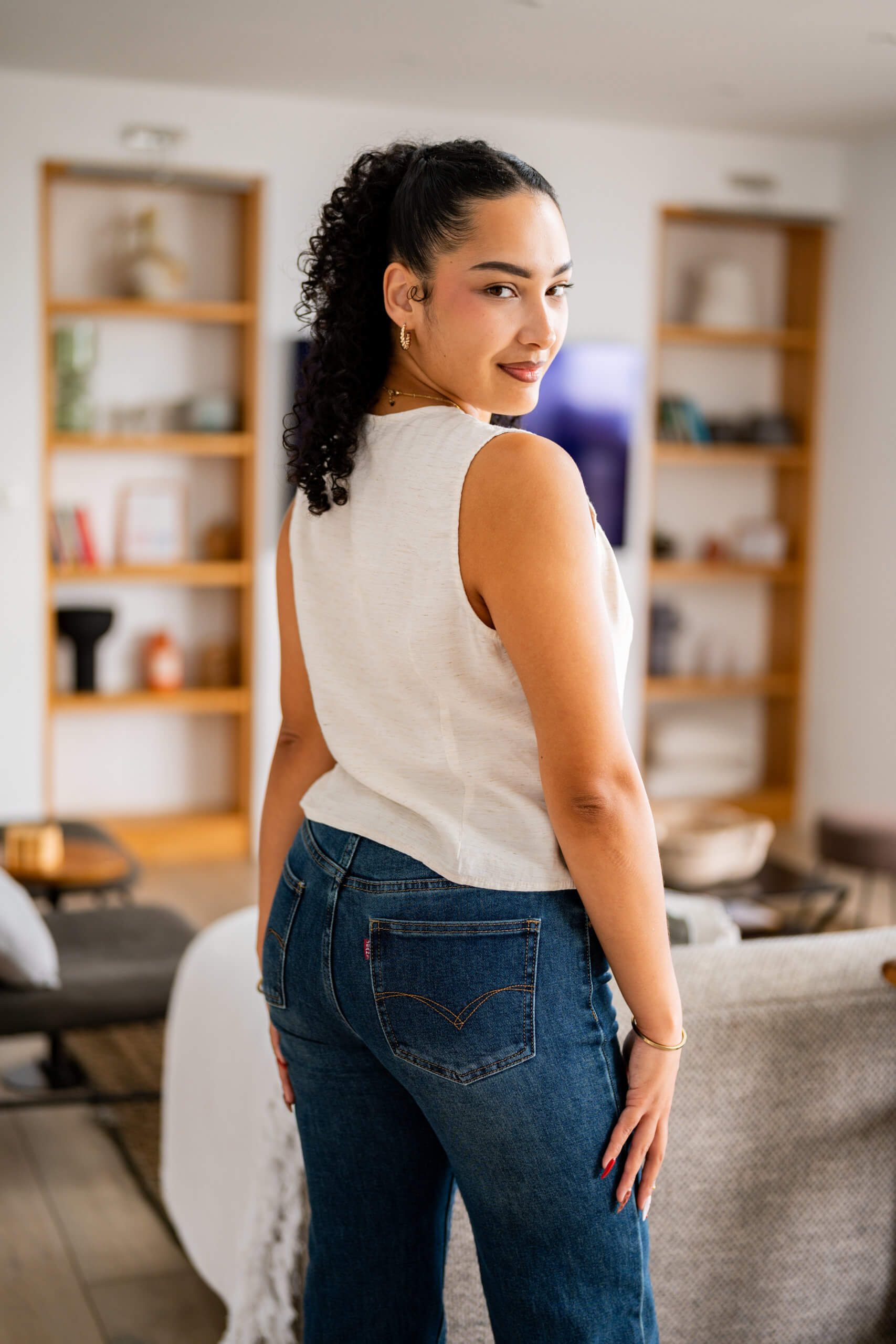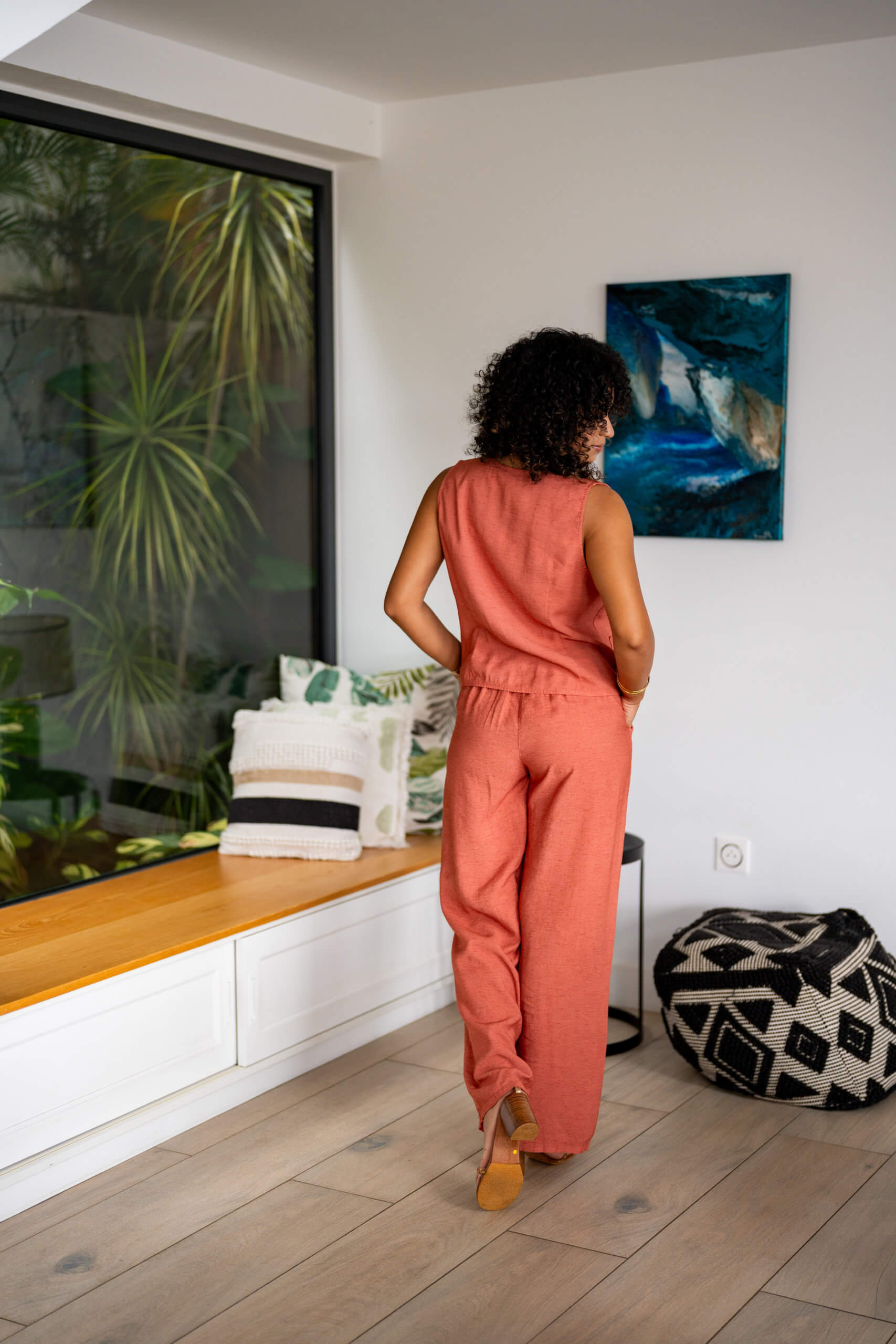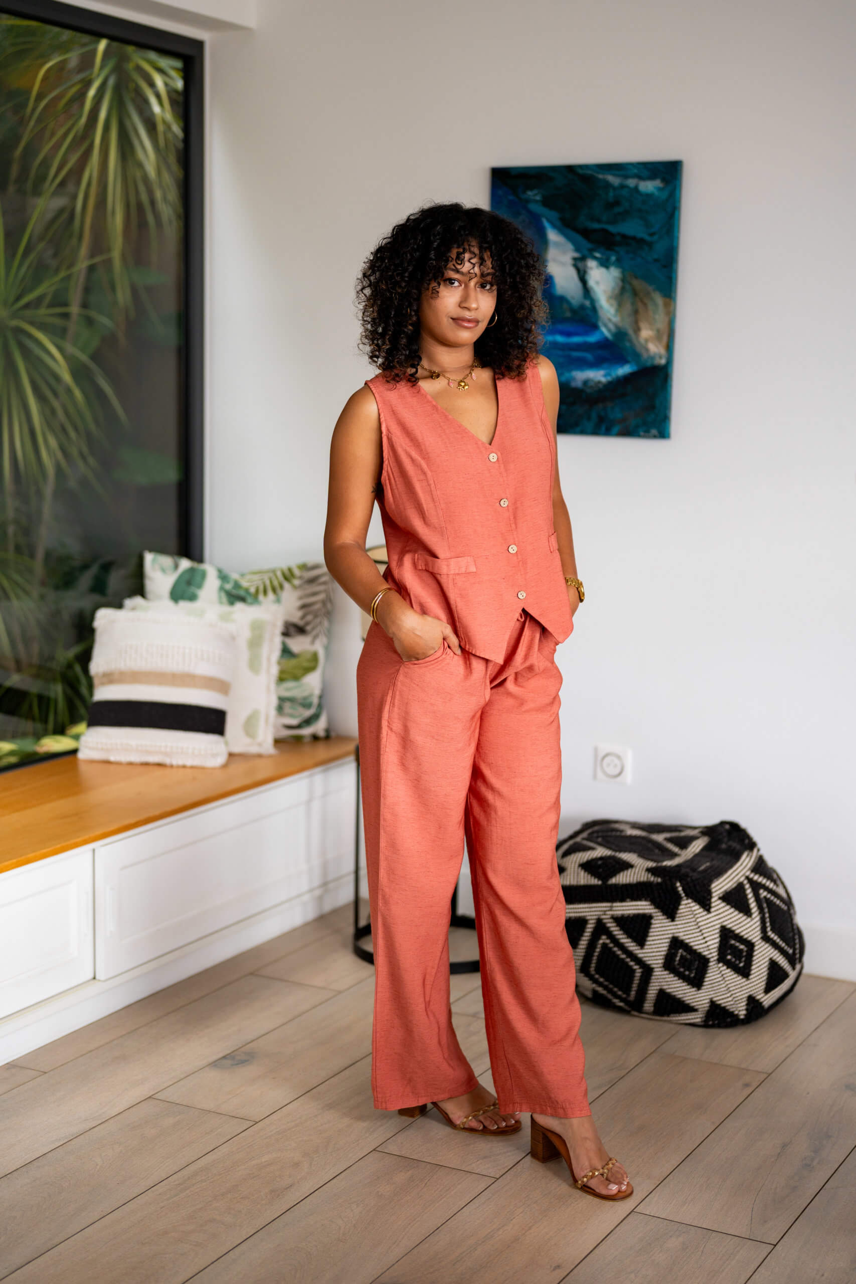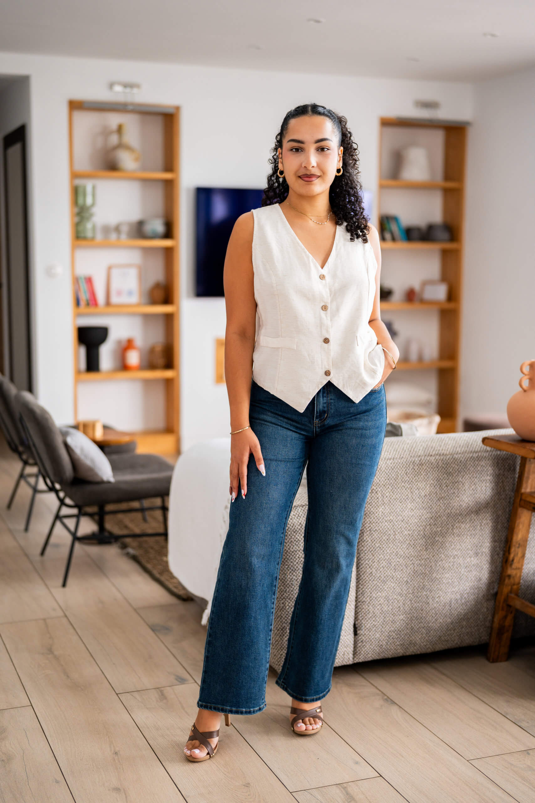 Gilet sans manches uni avec ses boutons à l’avant, dans une matière habillée semi lin.