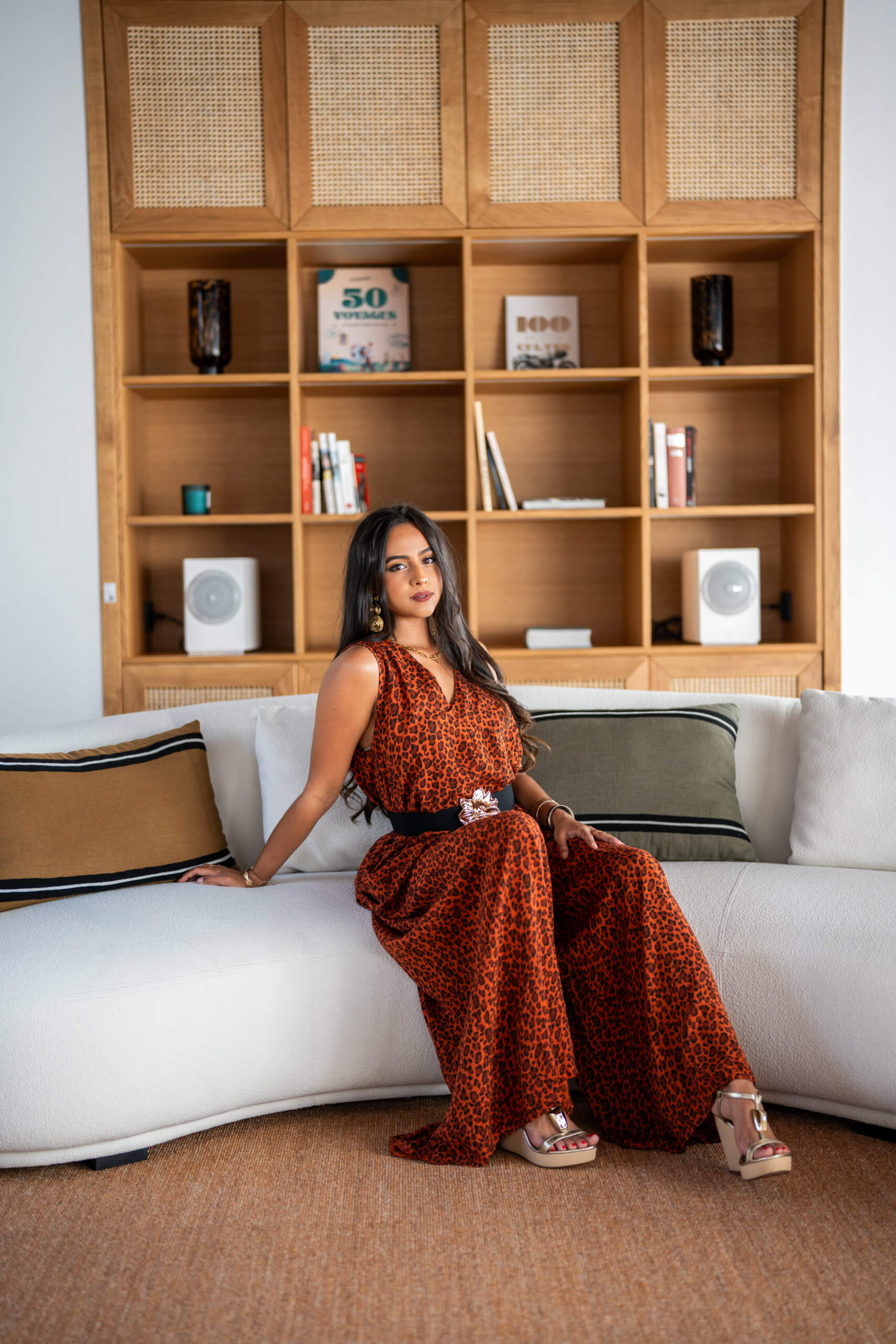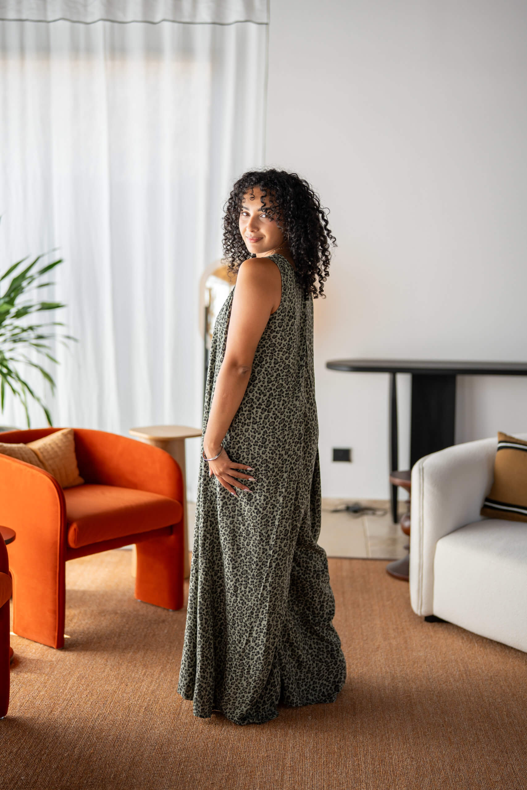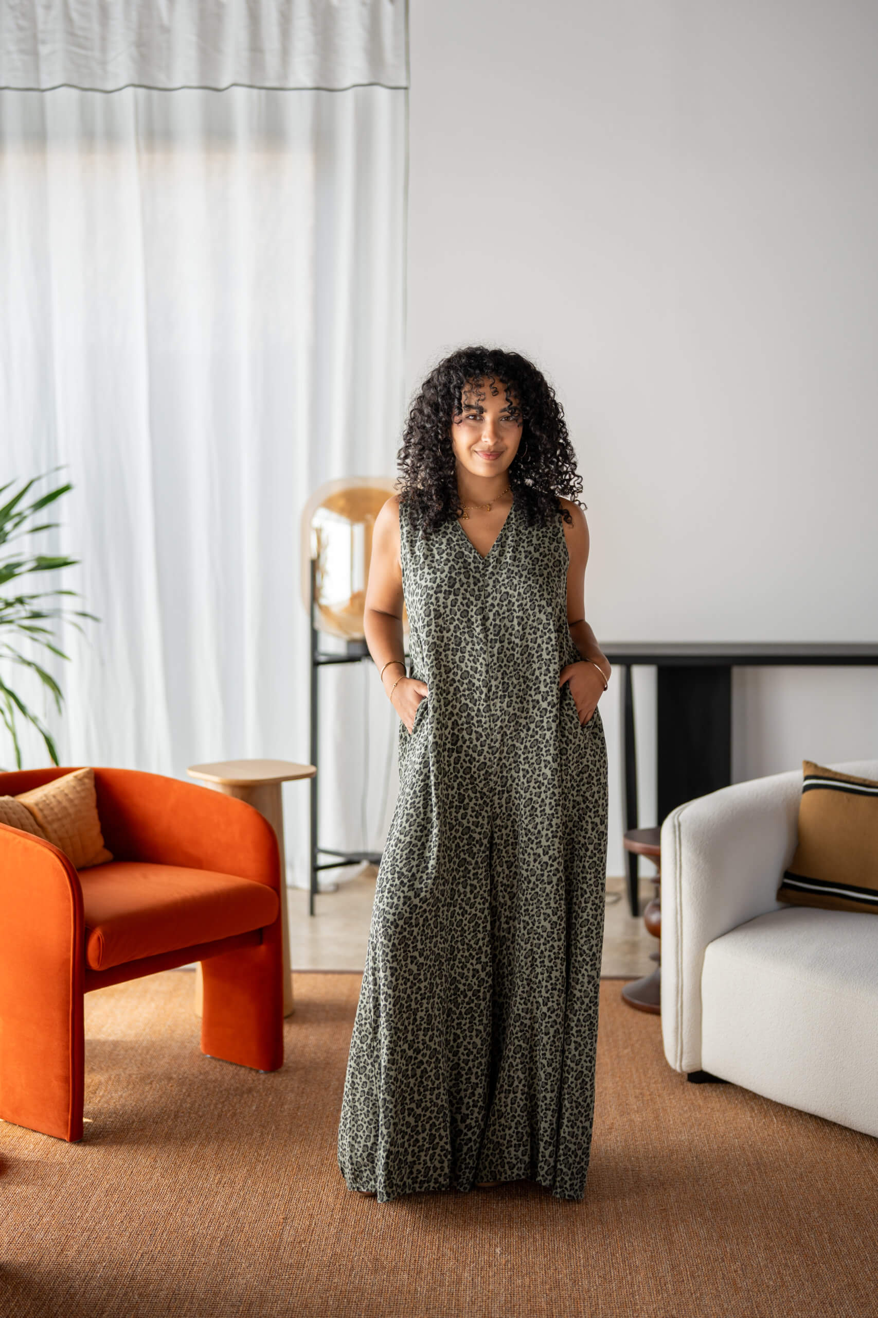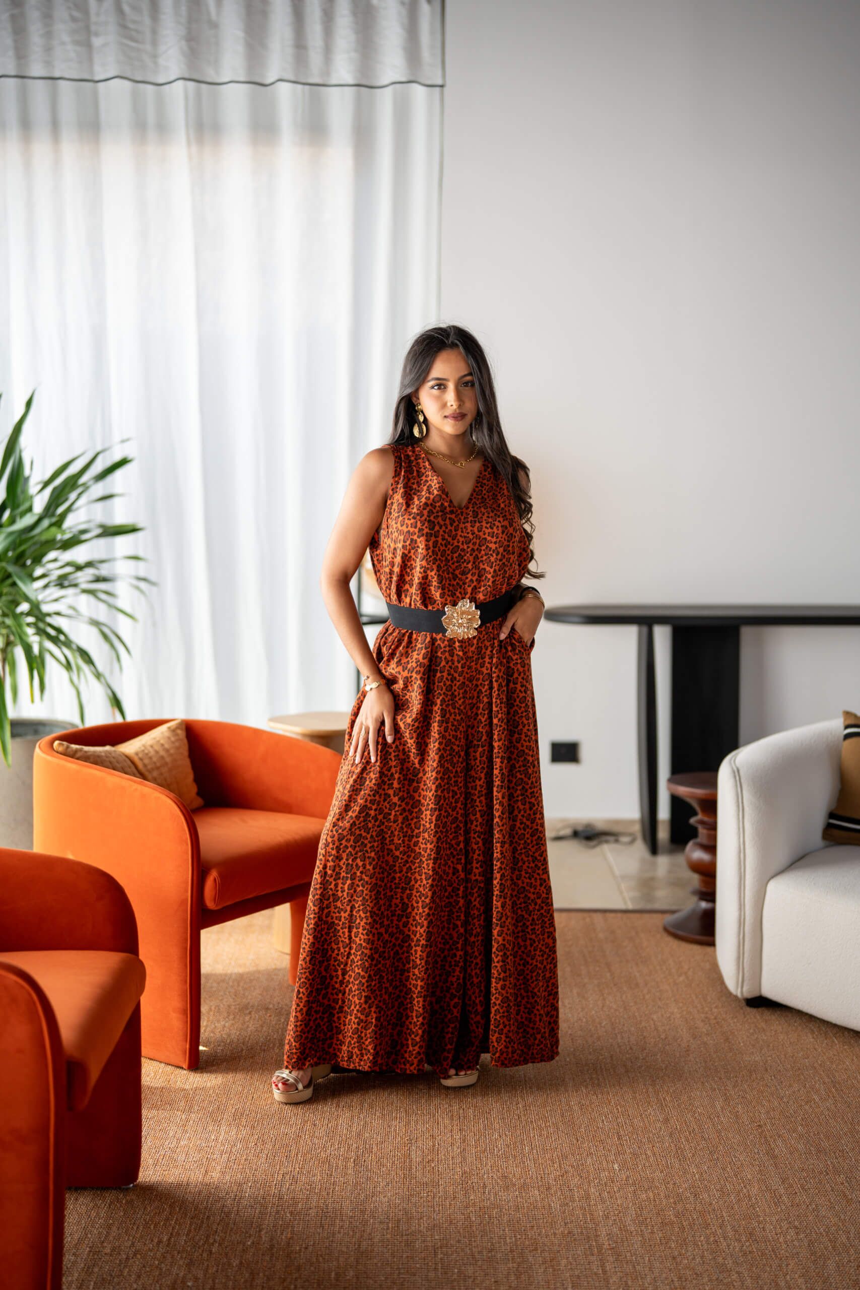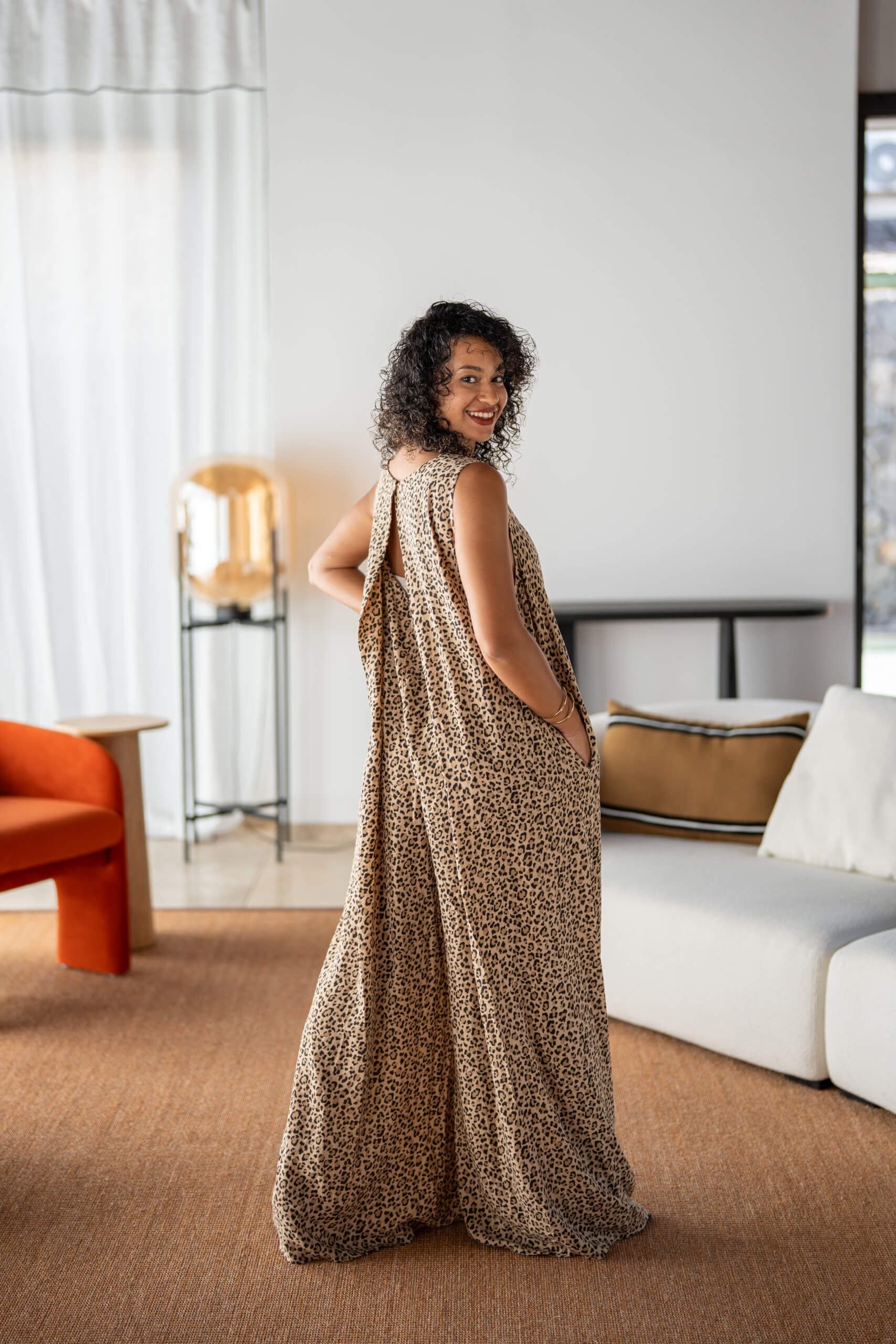 Maxi combinaison pantalon imprimée léopard, sans manches avec son col en V, ses poches, et son ouverture en V au dos.
