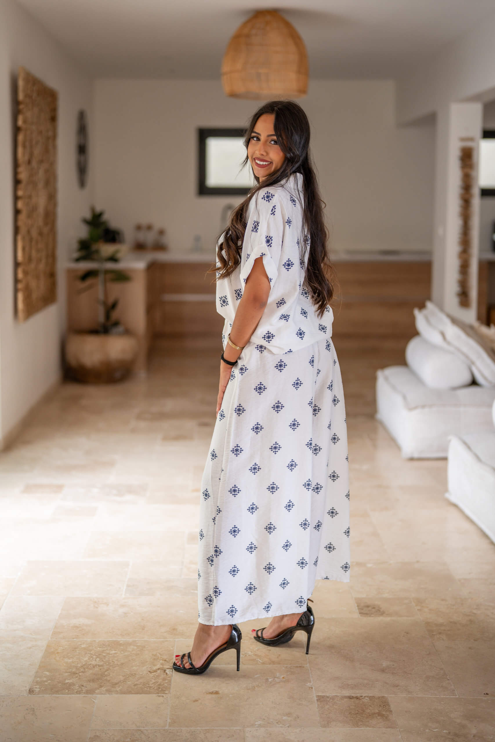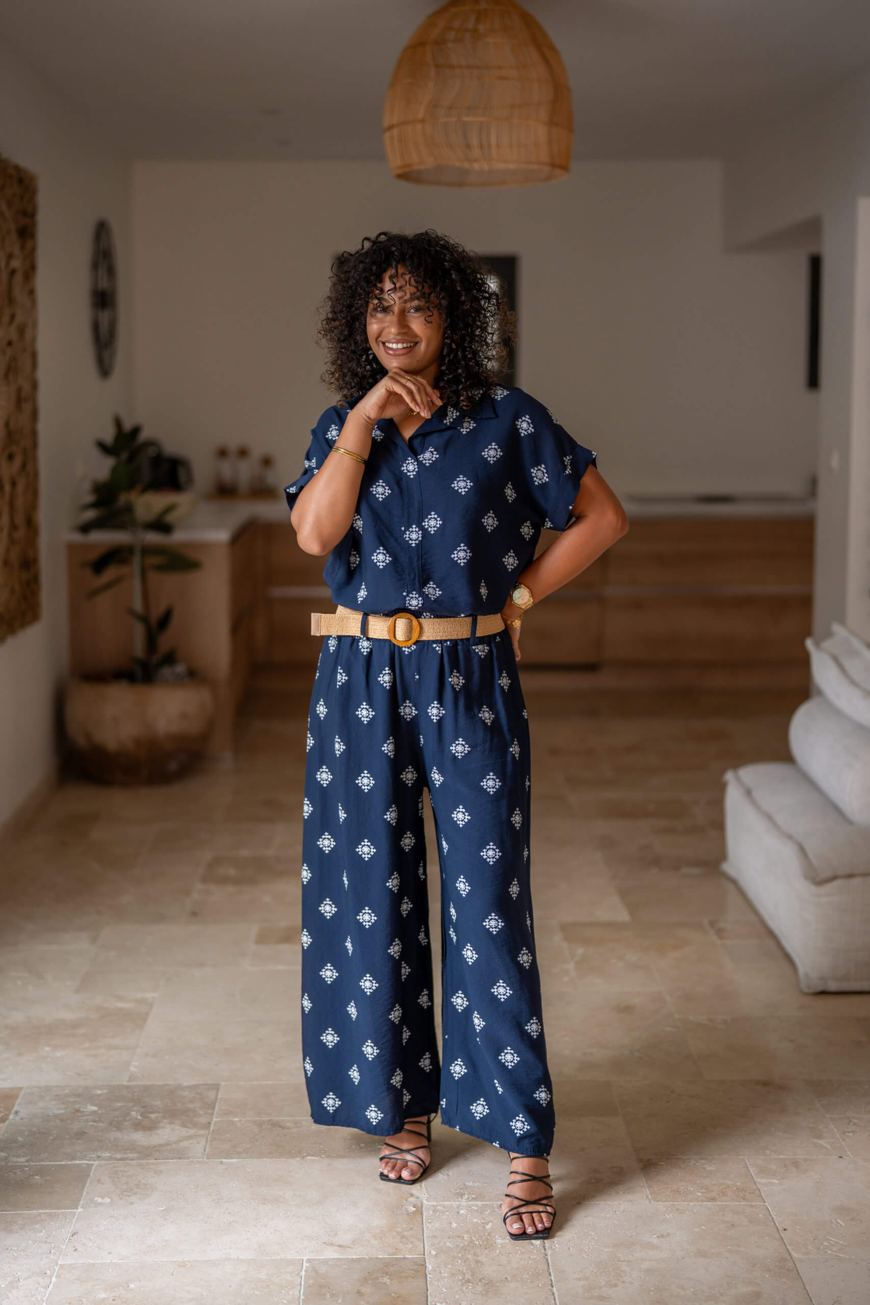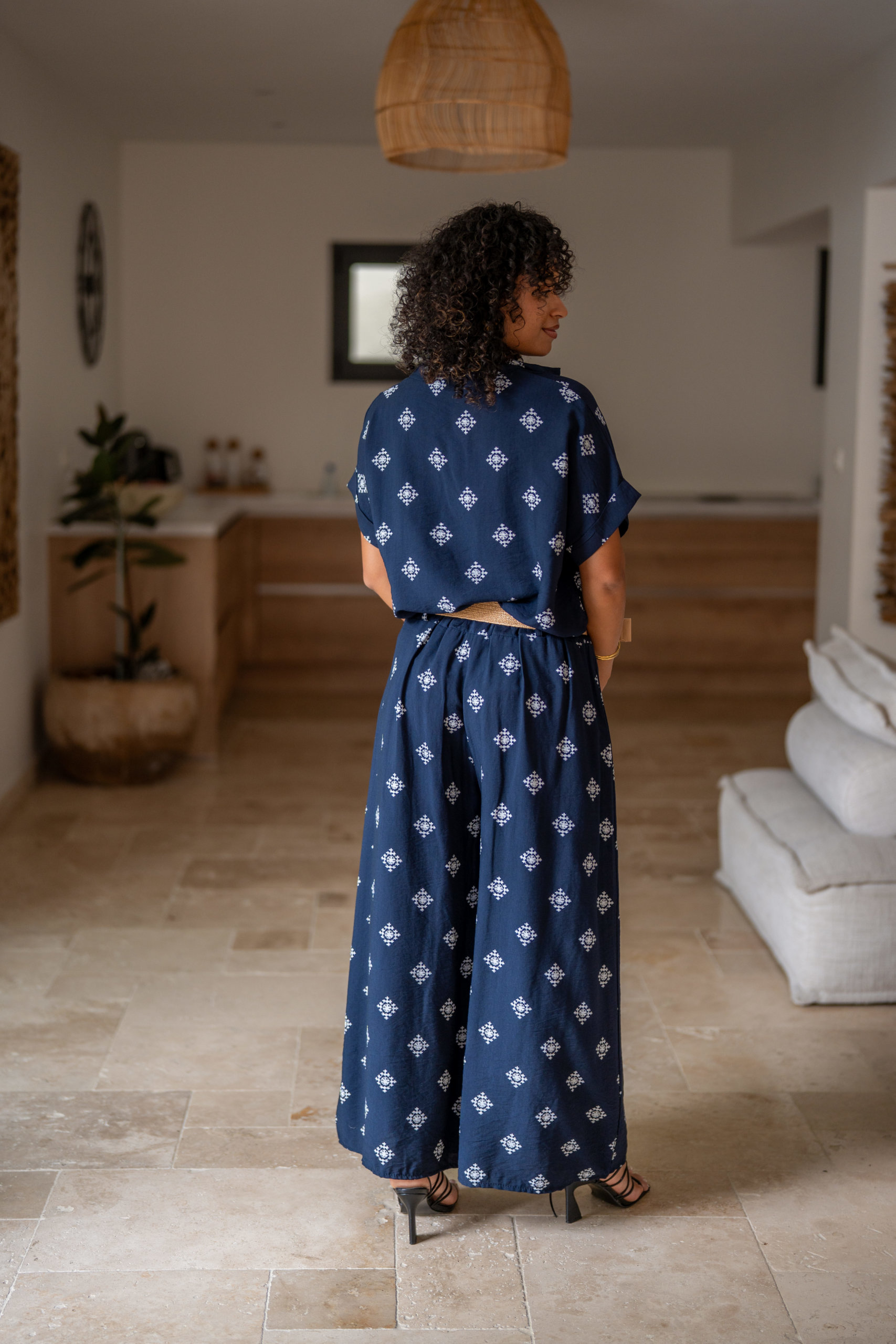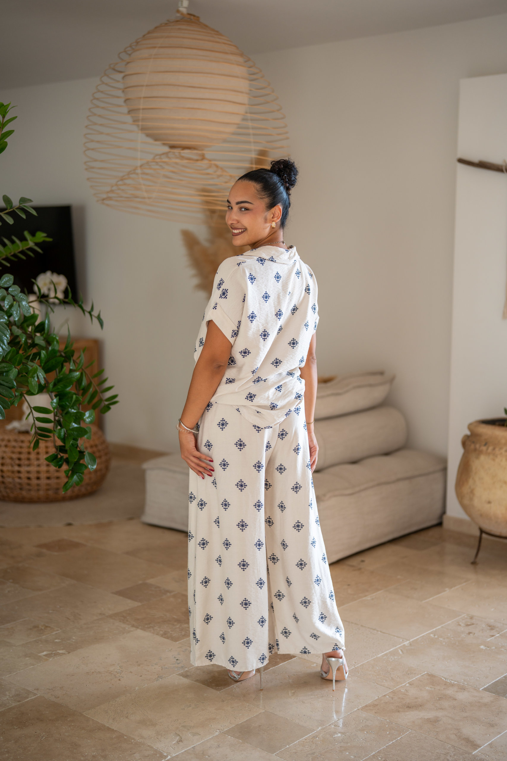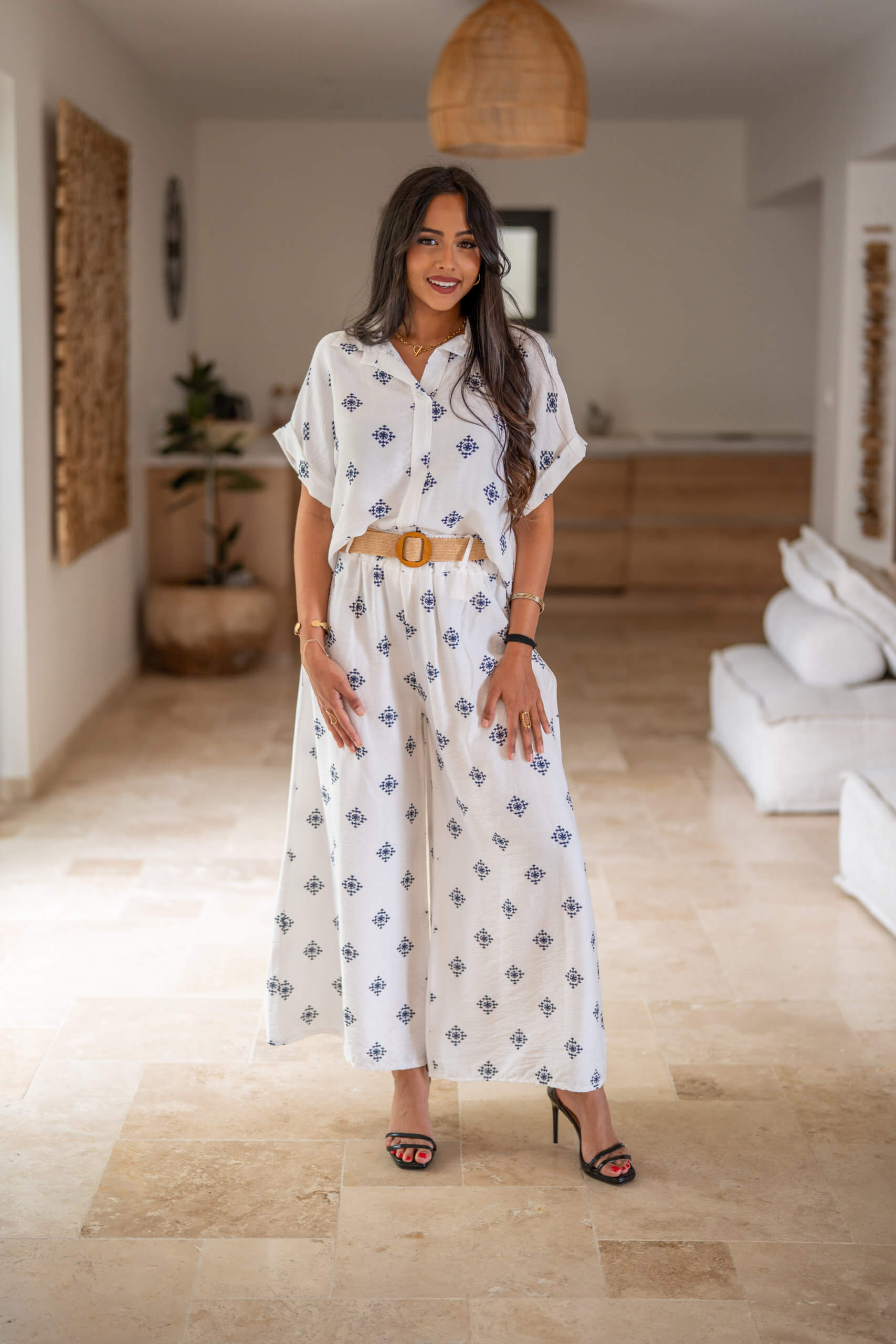 Pantalon imprimé avec un style bas large, fournit avec sa ceinture.