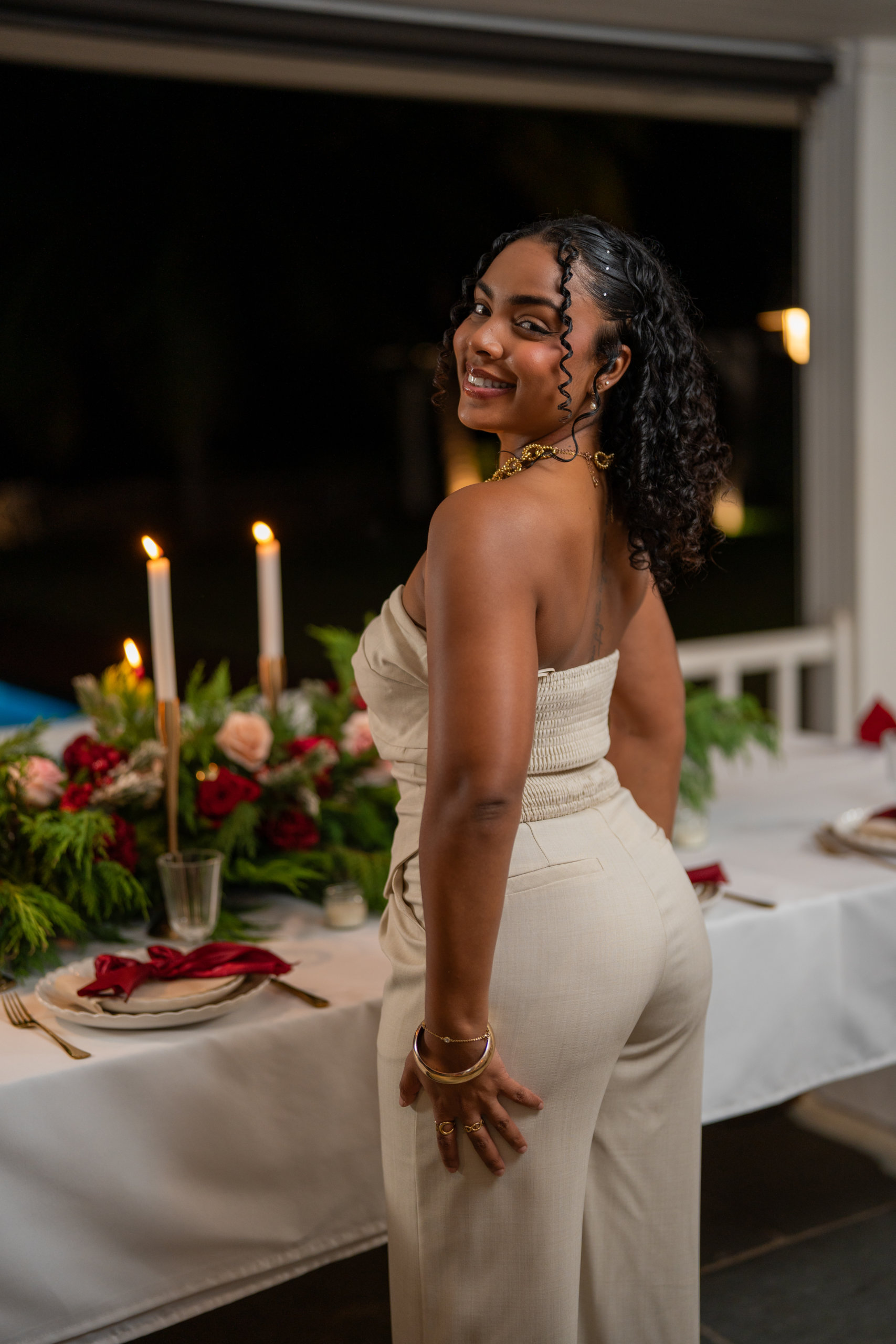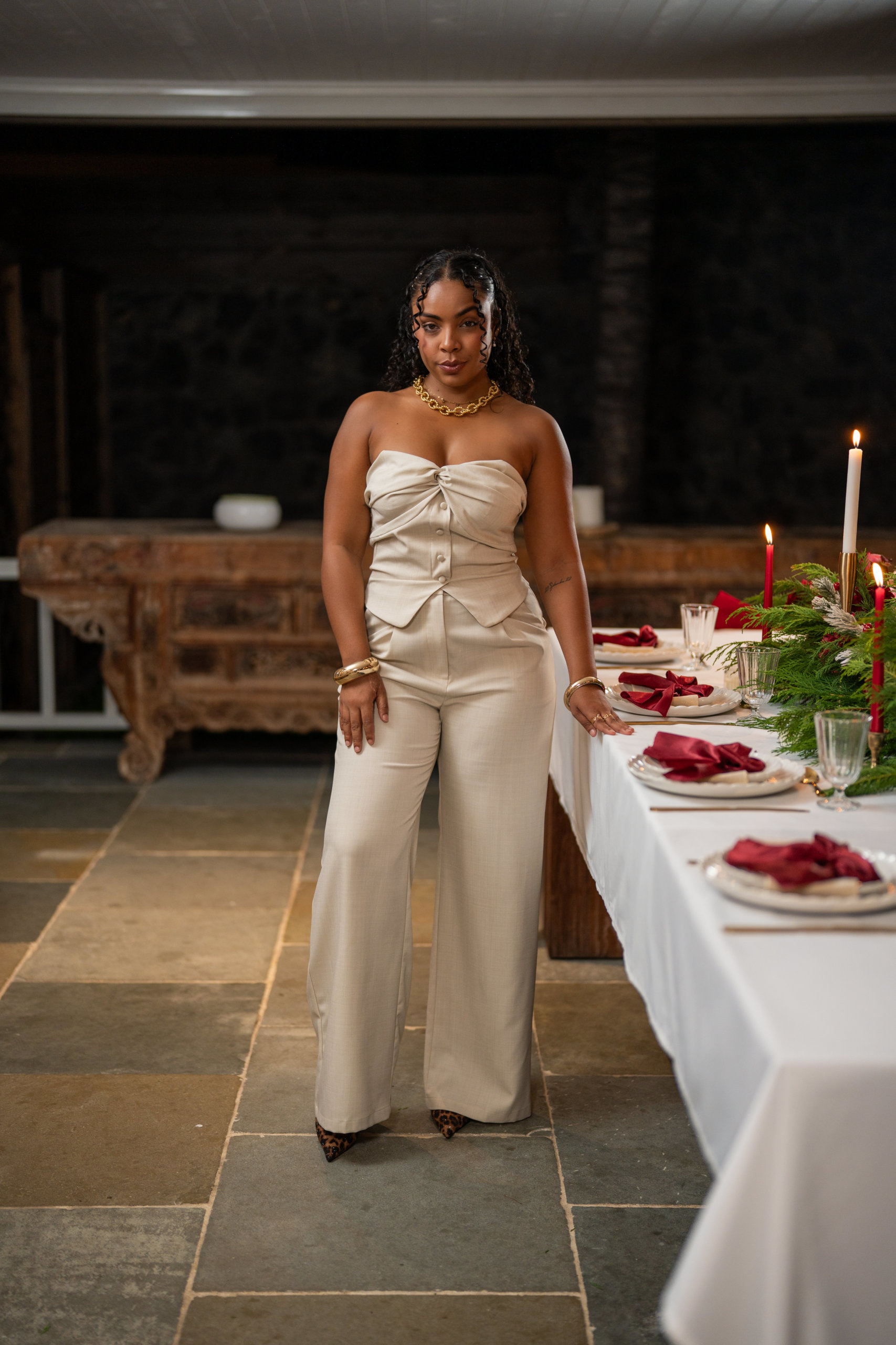 Pantalon classique à boutons, il est pincé au niveau des poches, avec un style bas large.