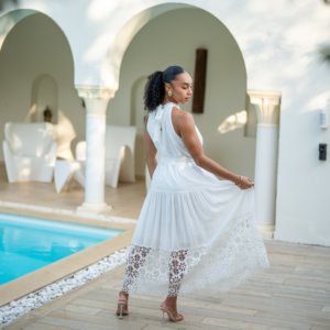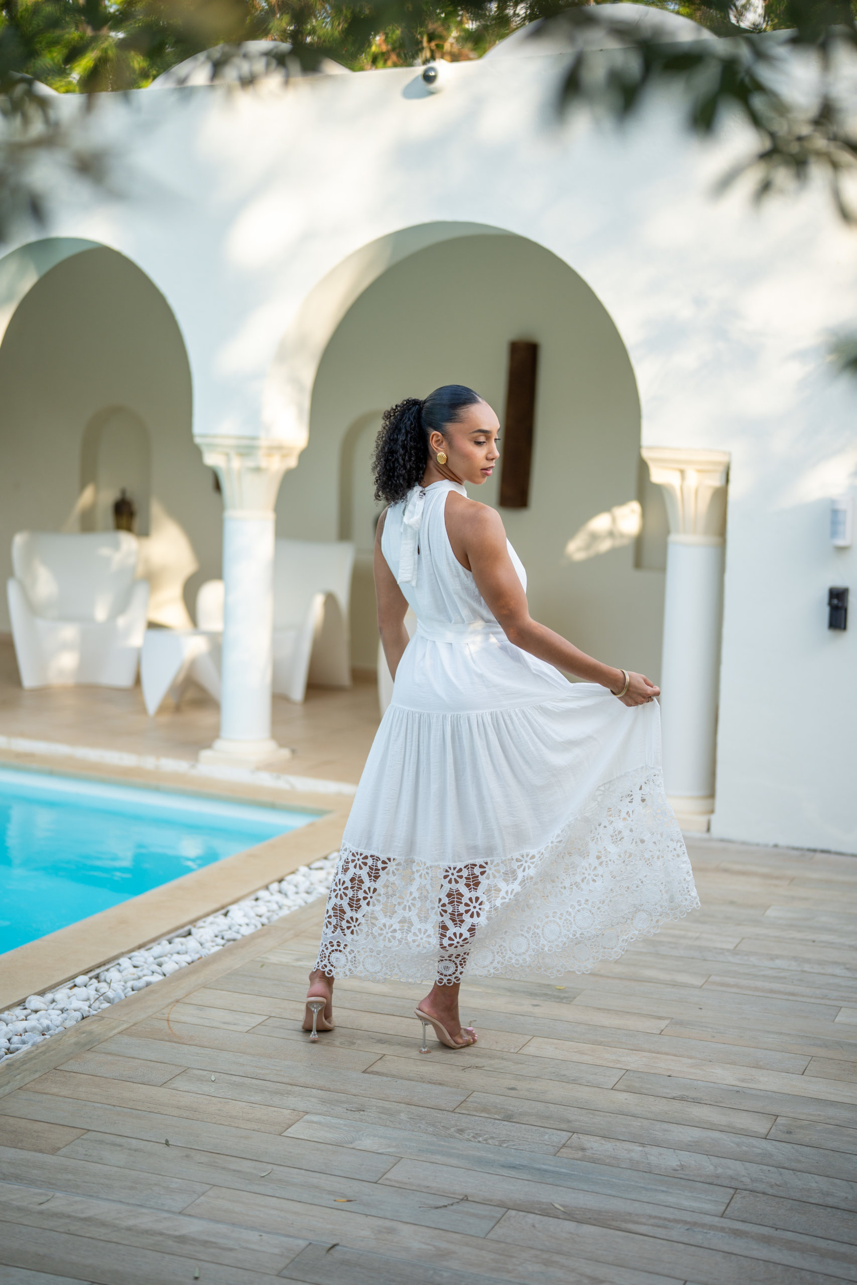 Robe longue sans manches, brodée dans le bas avec sa ceinture. Elle est doublée.