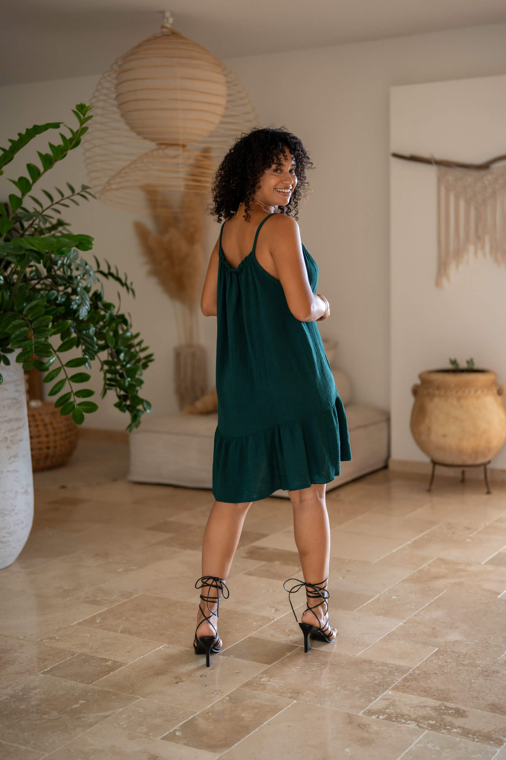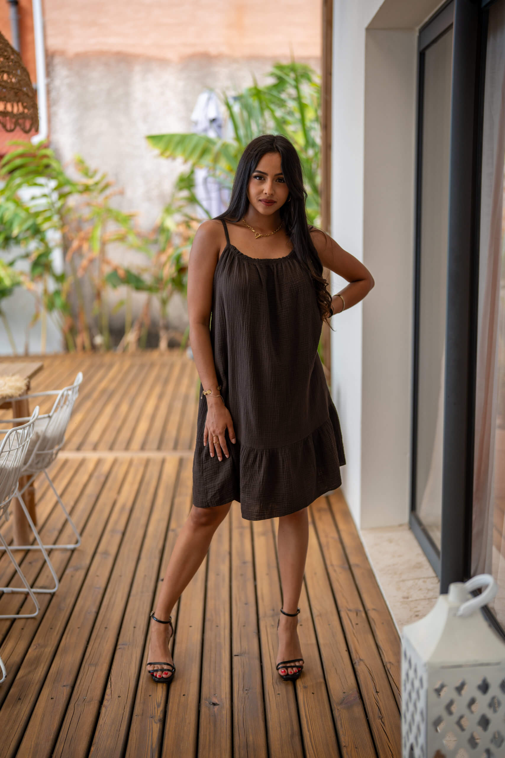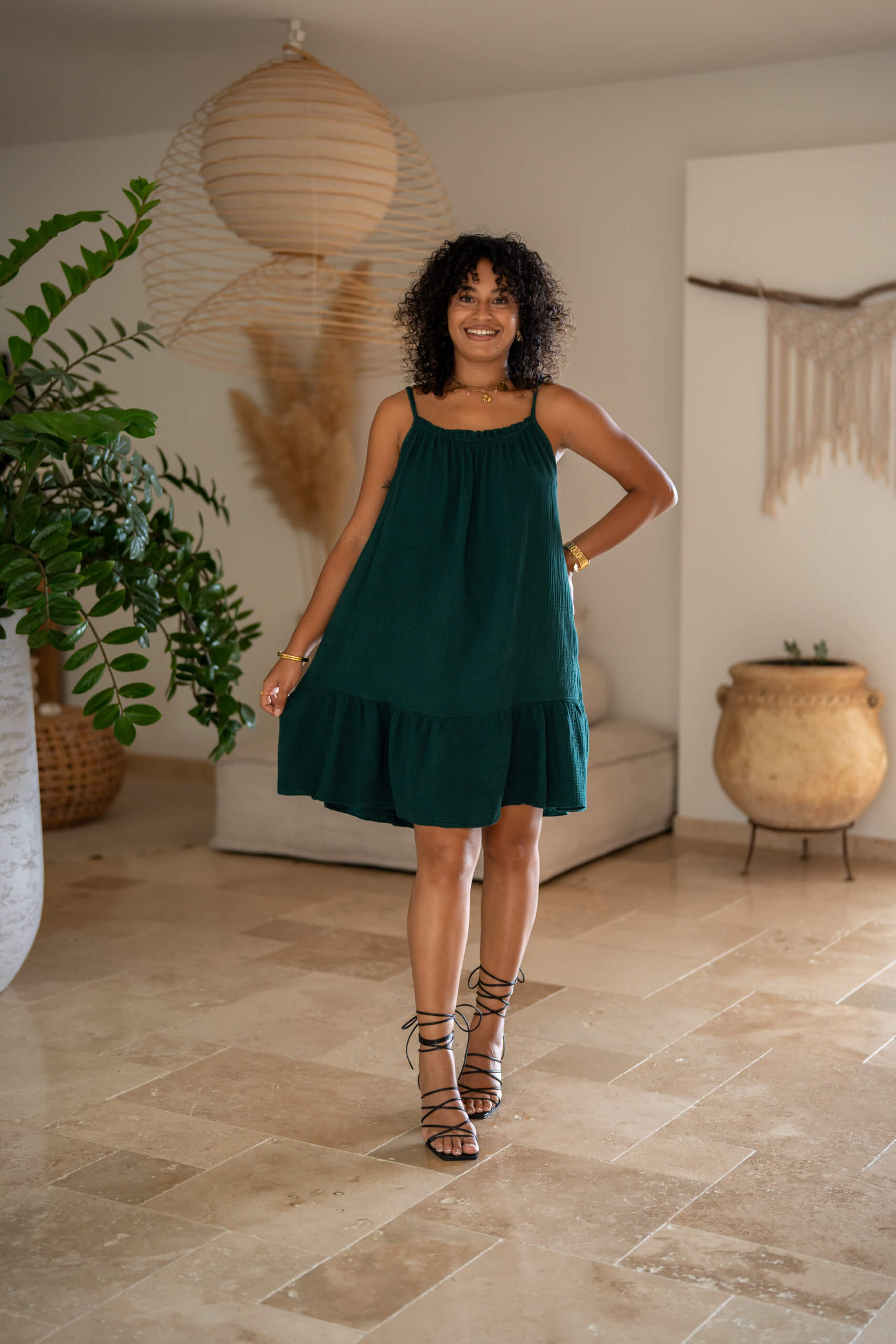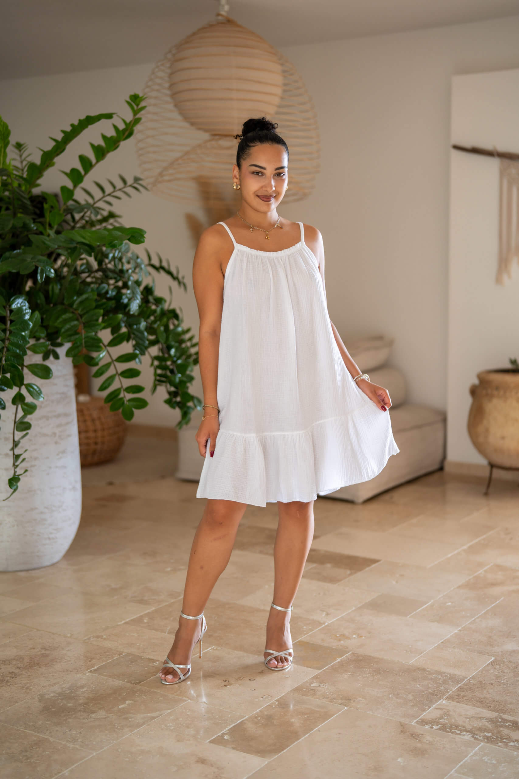 Robe courte à bretelles dans une matière en gaze de coton, agréable et très légère à porter.