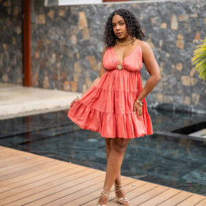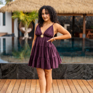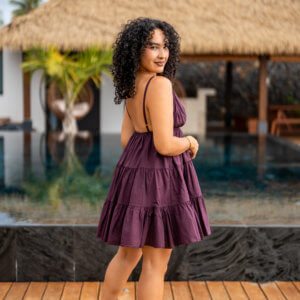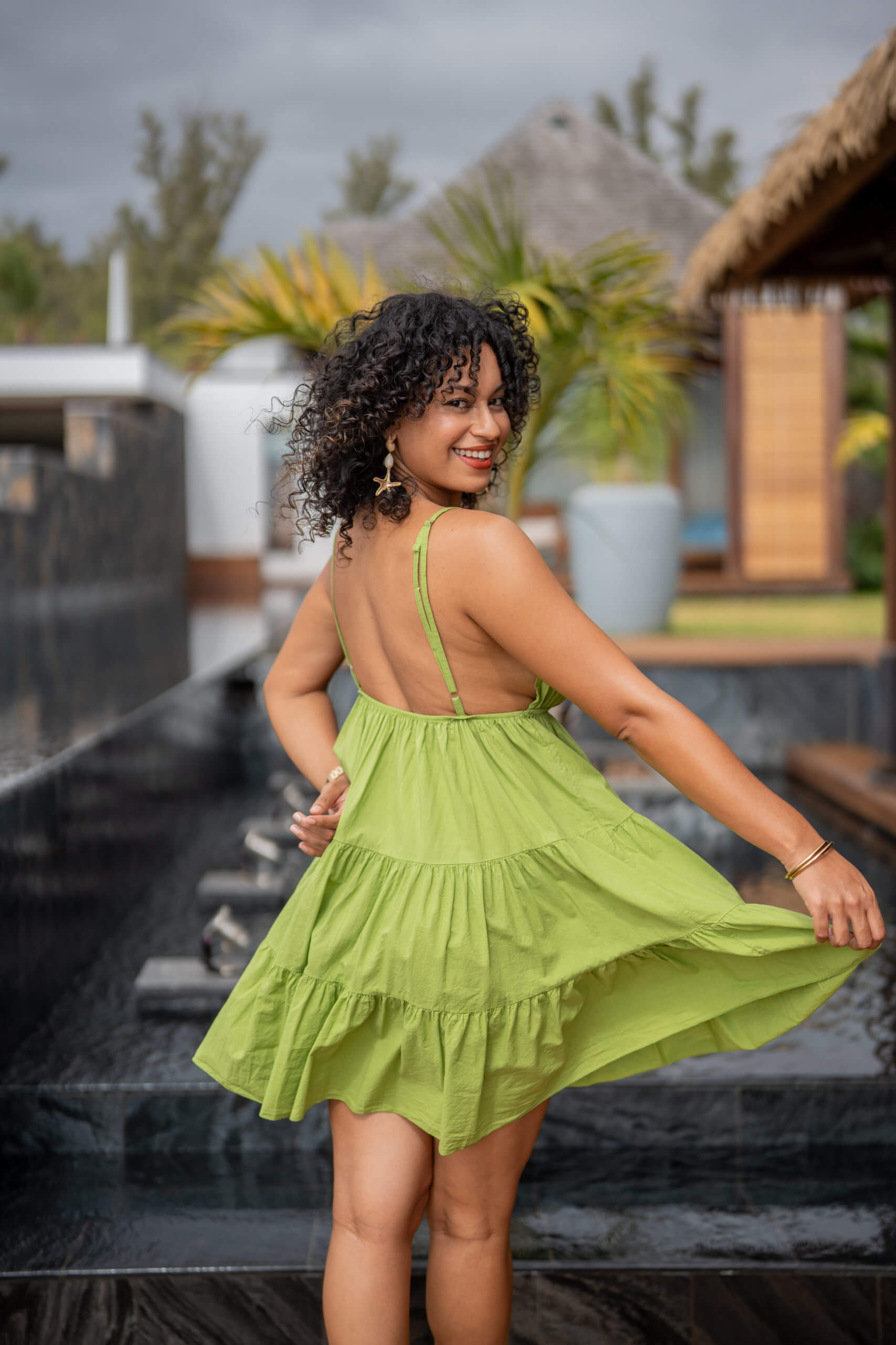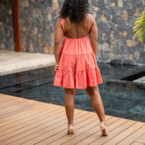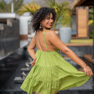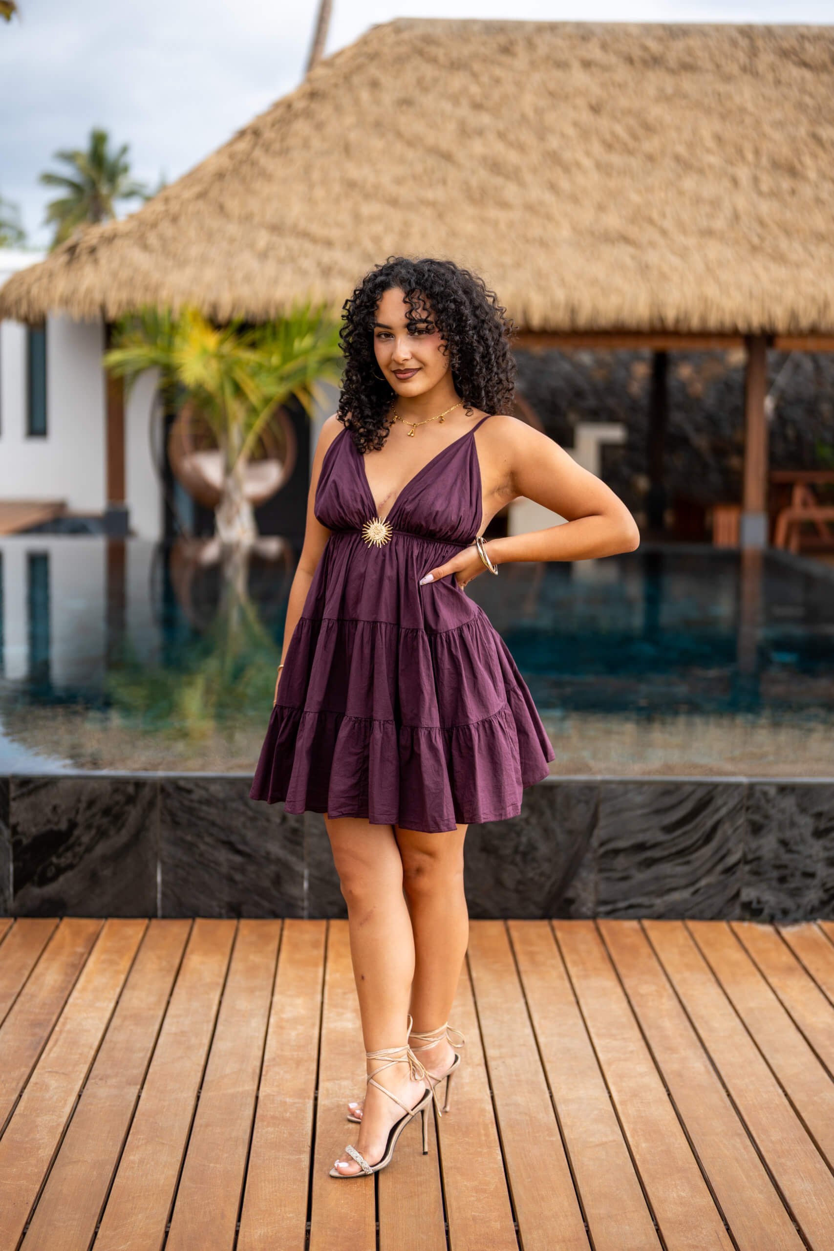 Robe courte dos nu à bretelles réglables. Un broche en forme de soleil est fournit avec la robe.
