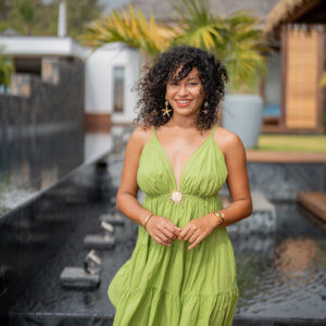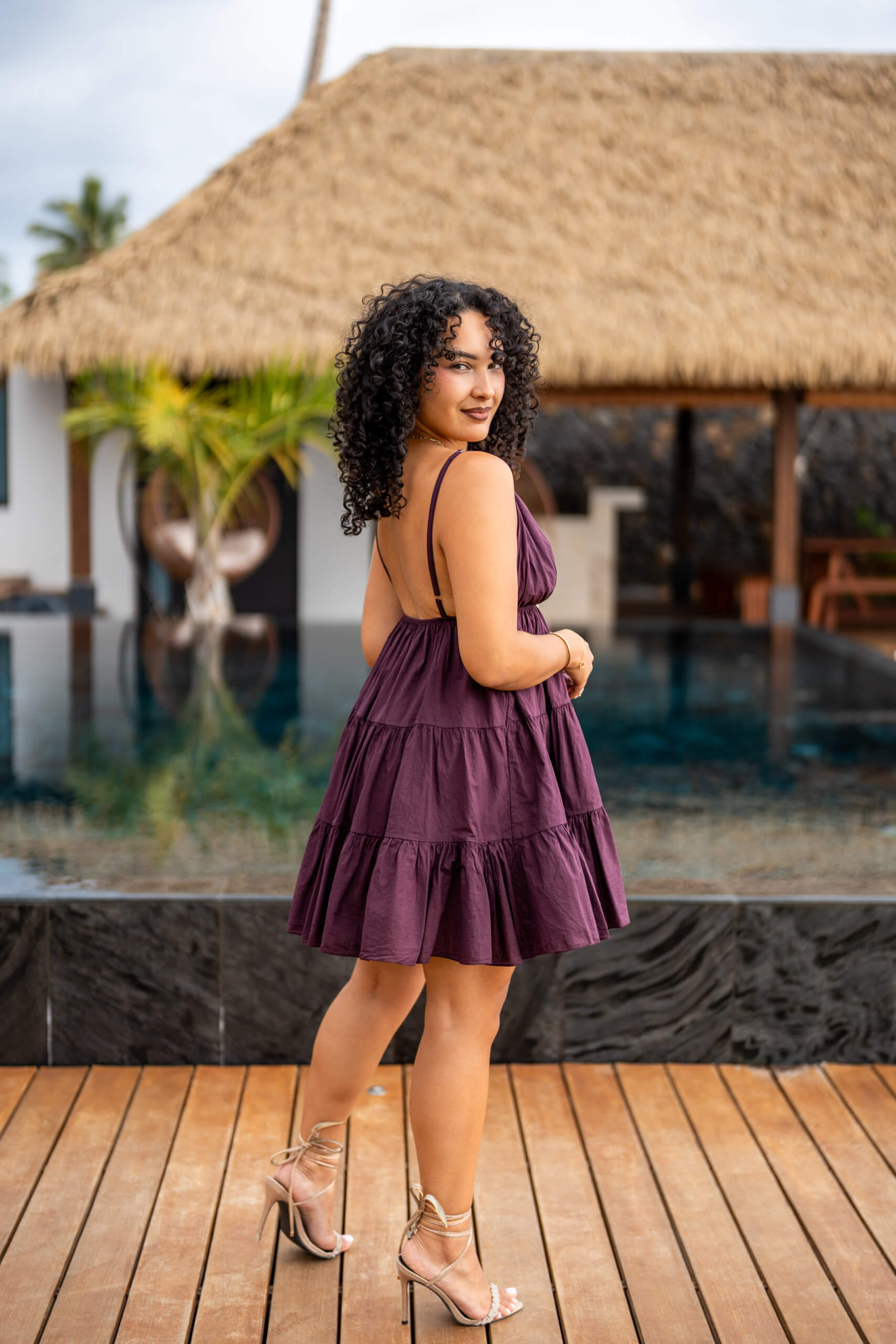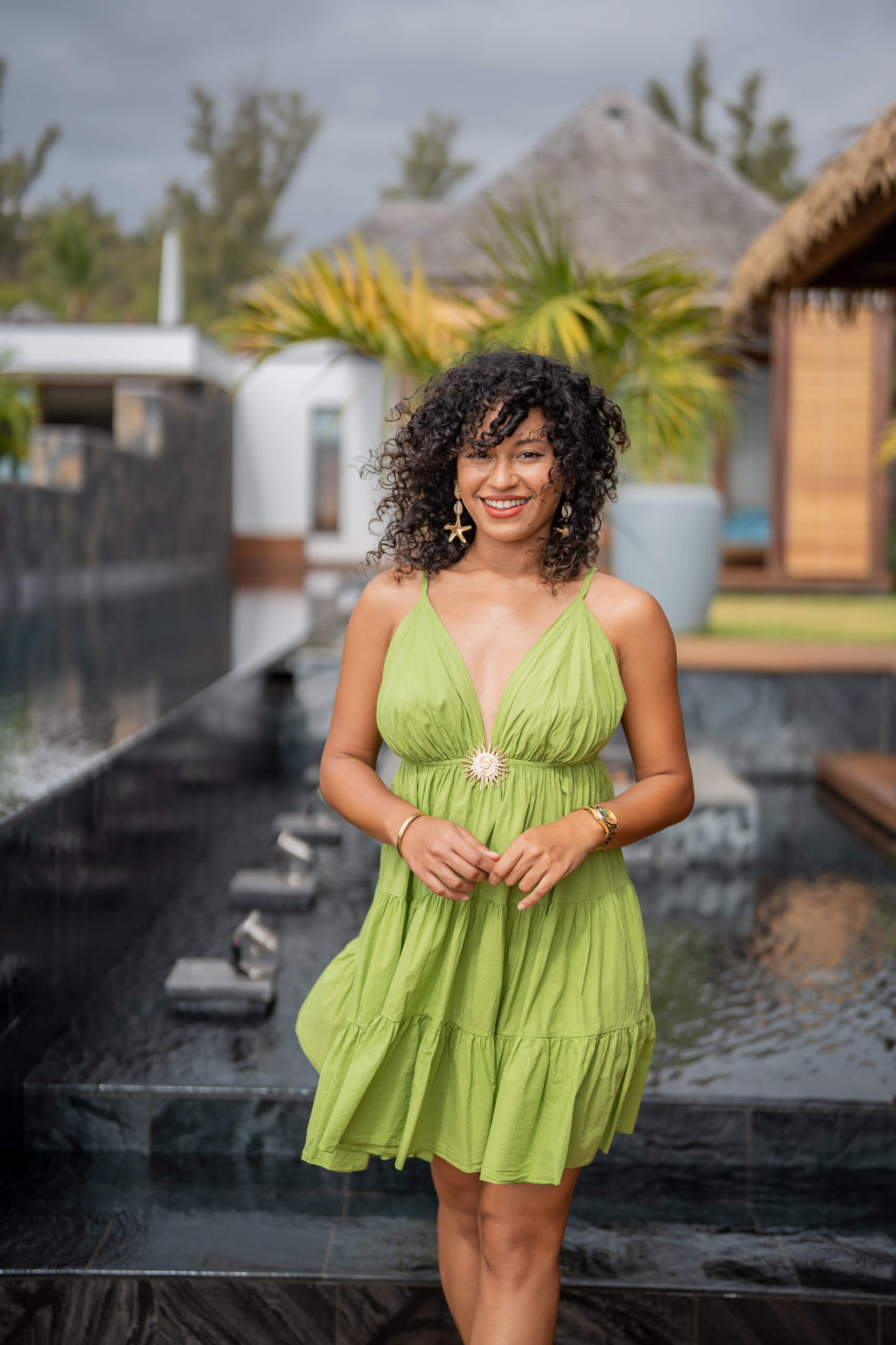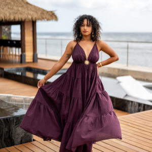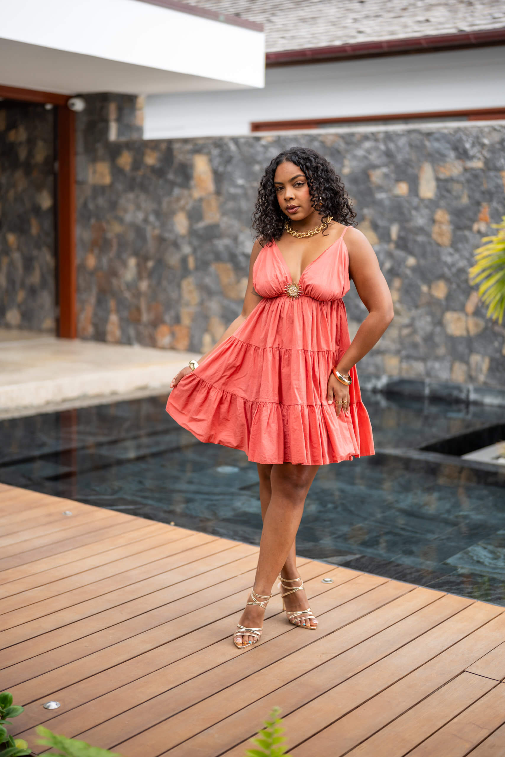 Robe courte dos nu à bretelles réglables. Un broche en forme de soleil est fournit avec la robe.