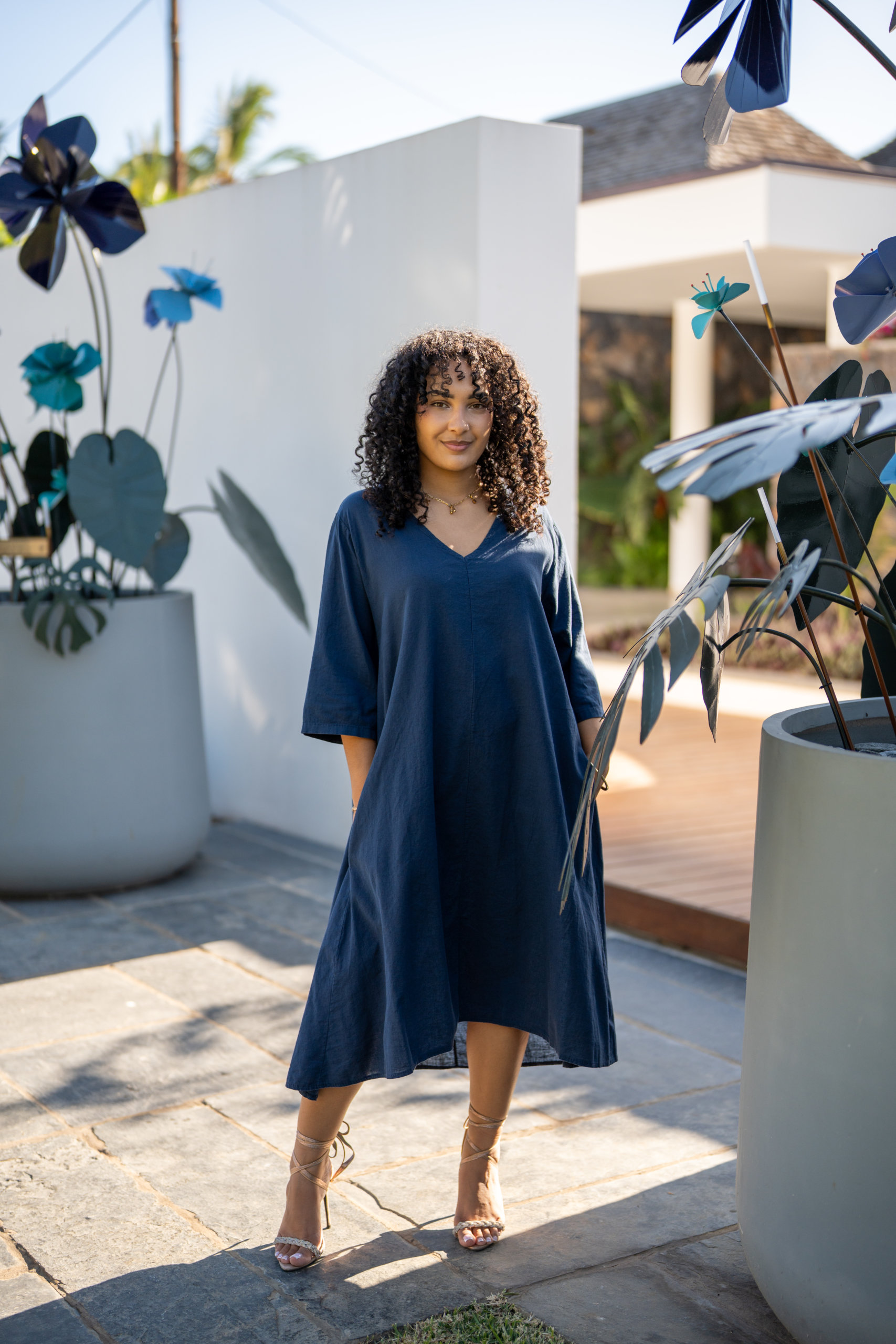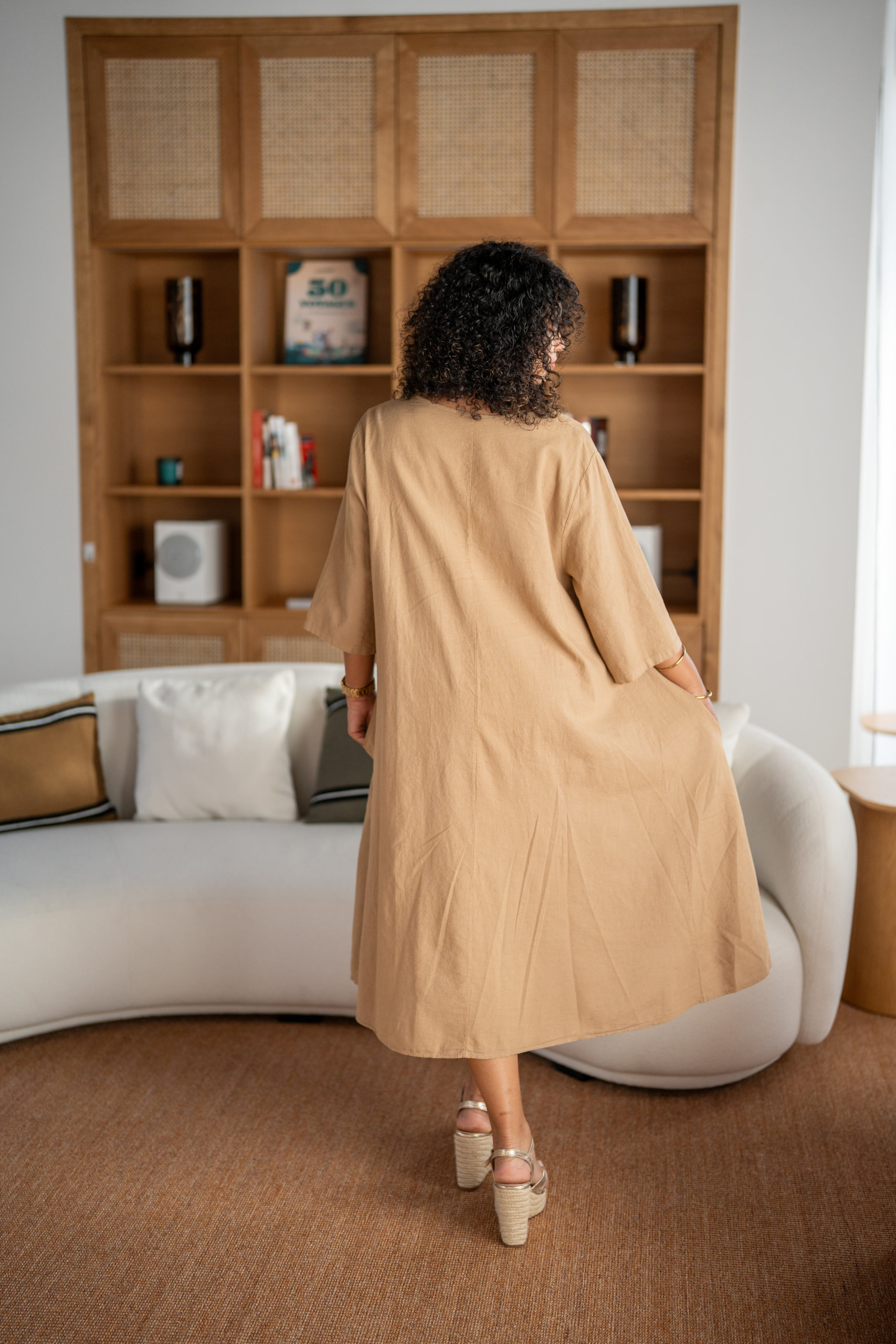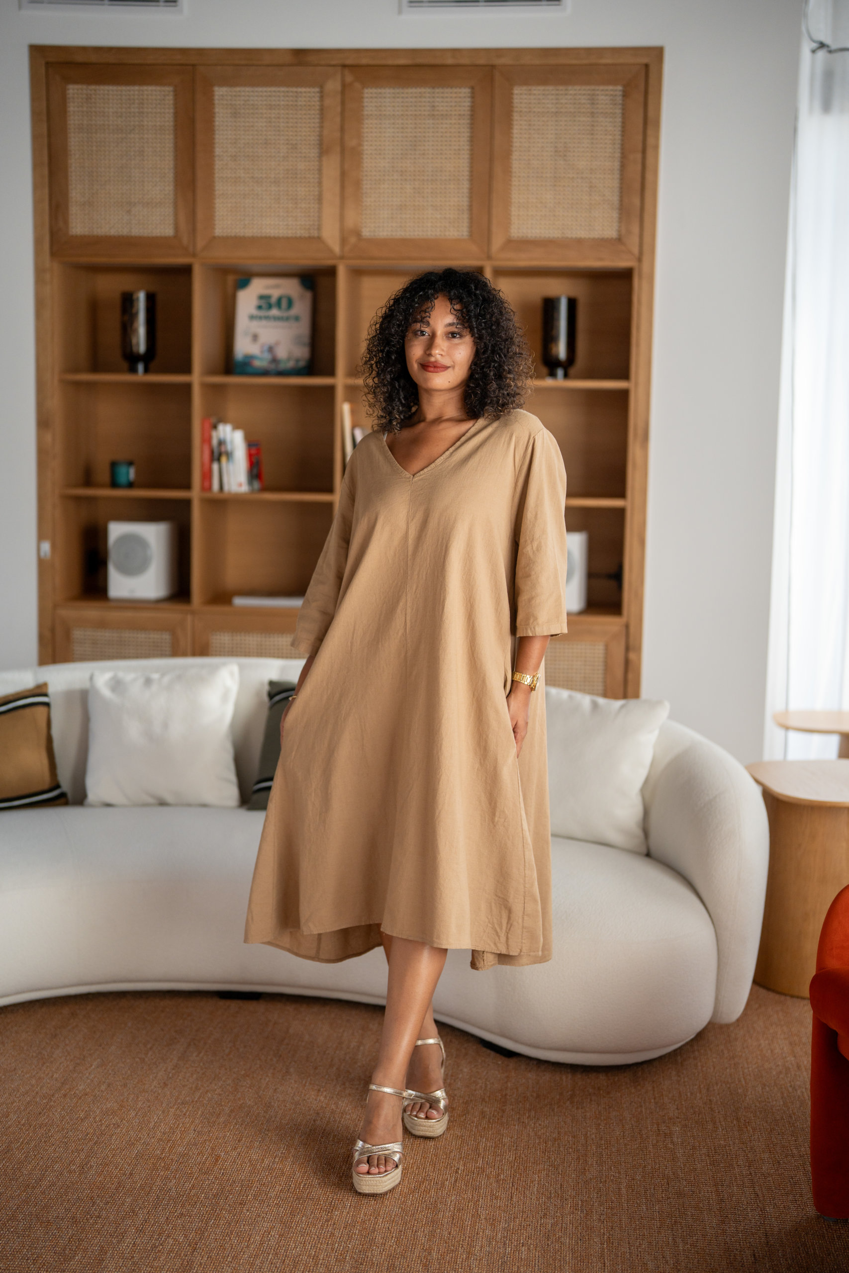 Robe mi longue à manches 3/4 dans une coupe droite, légère et agréable à porter dans sa matière en coton et en lin.
