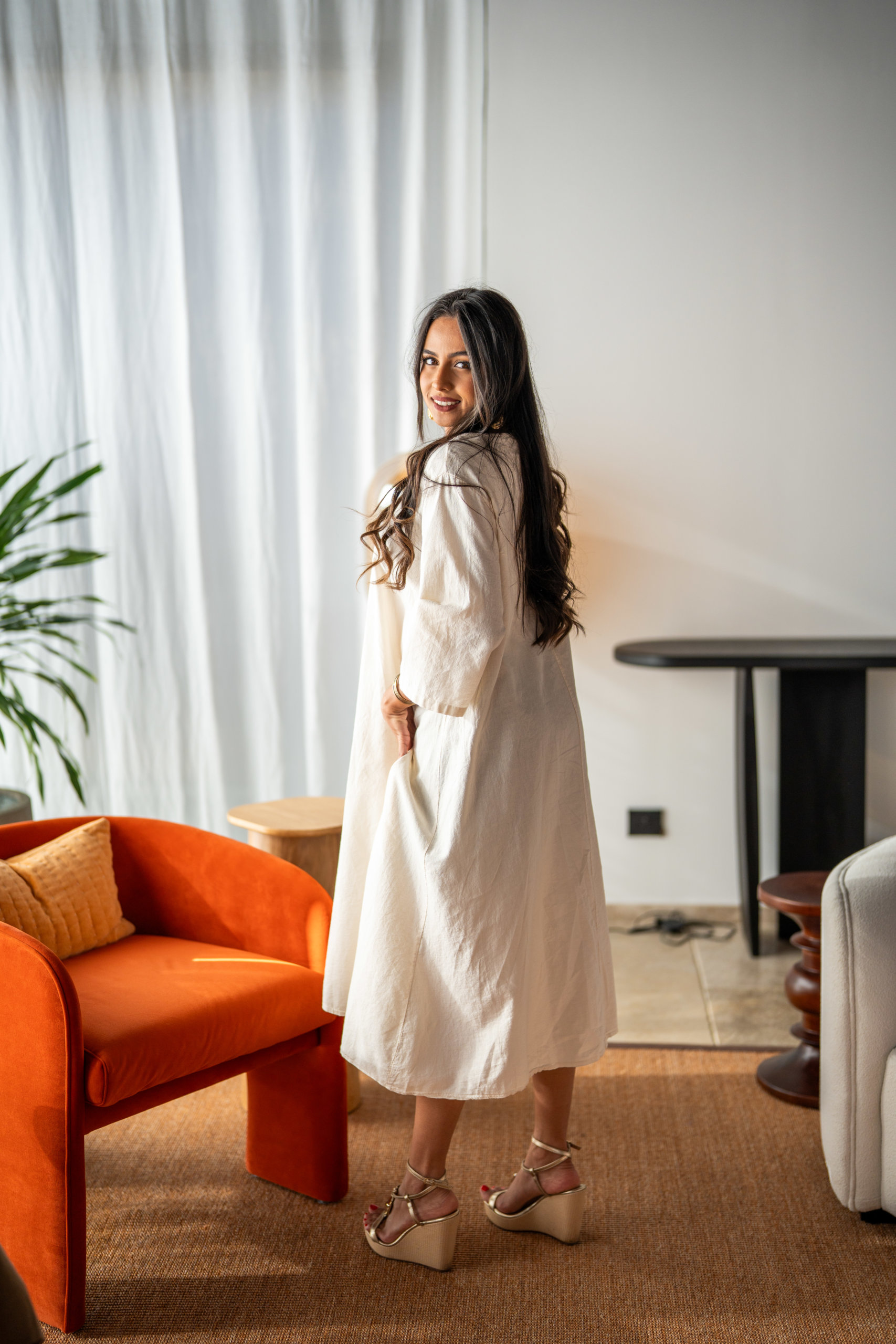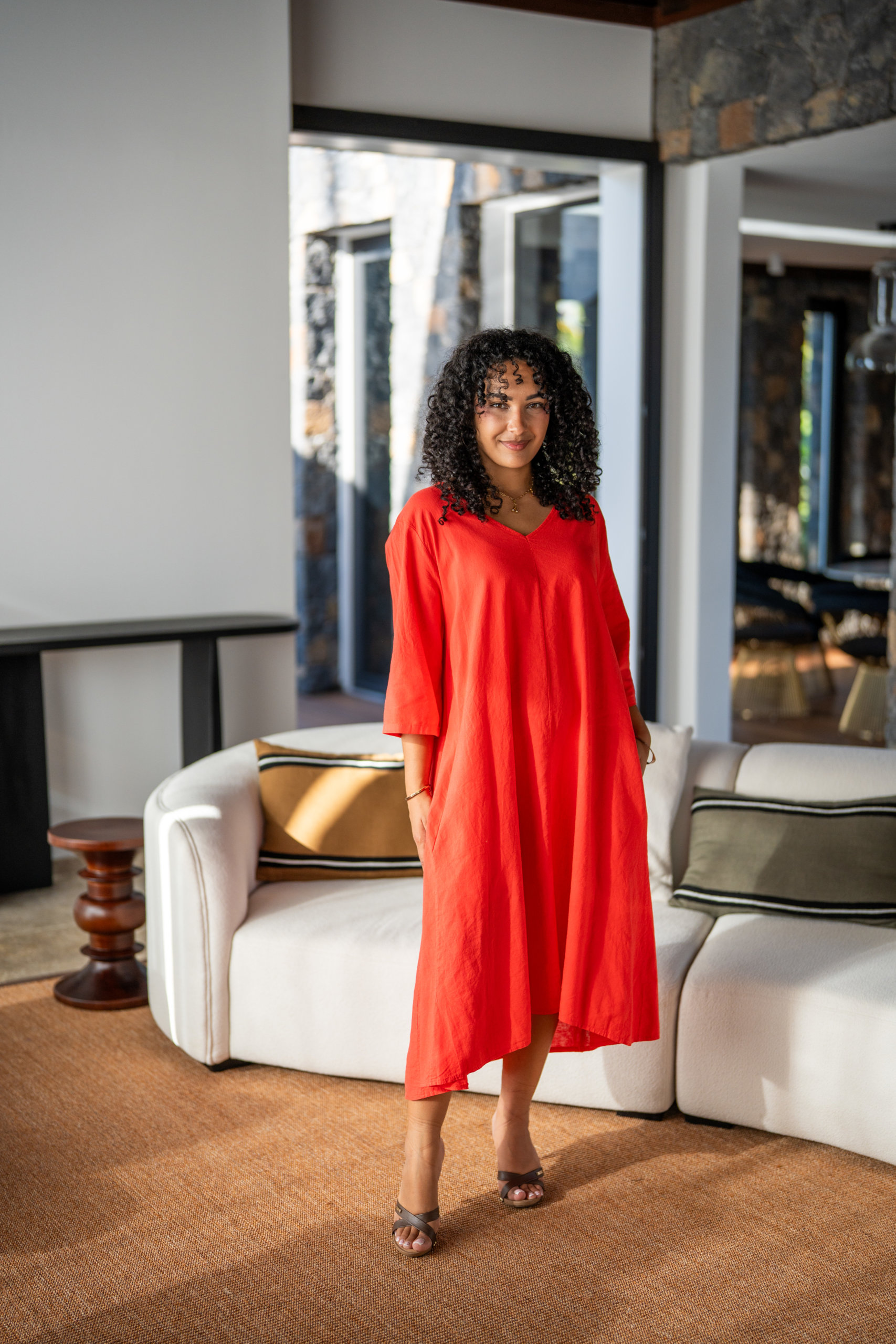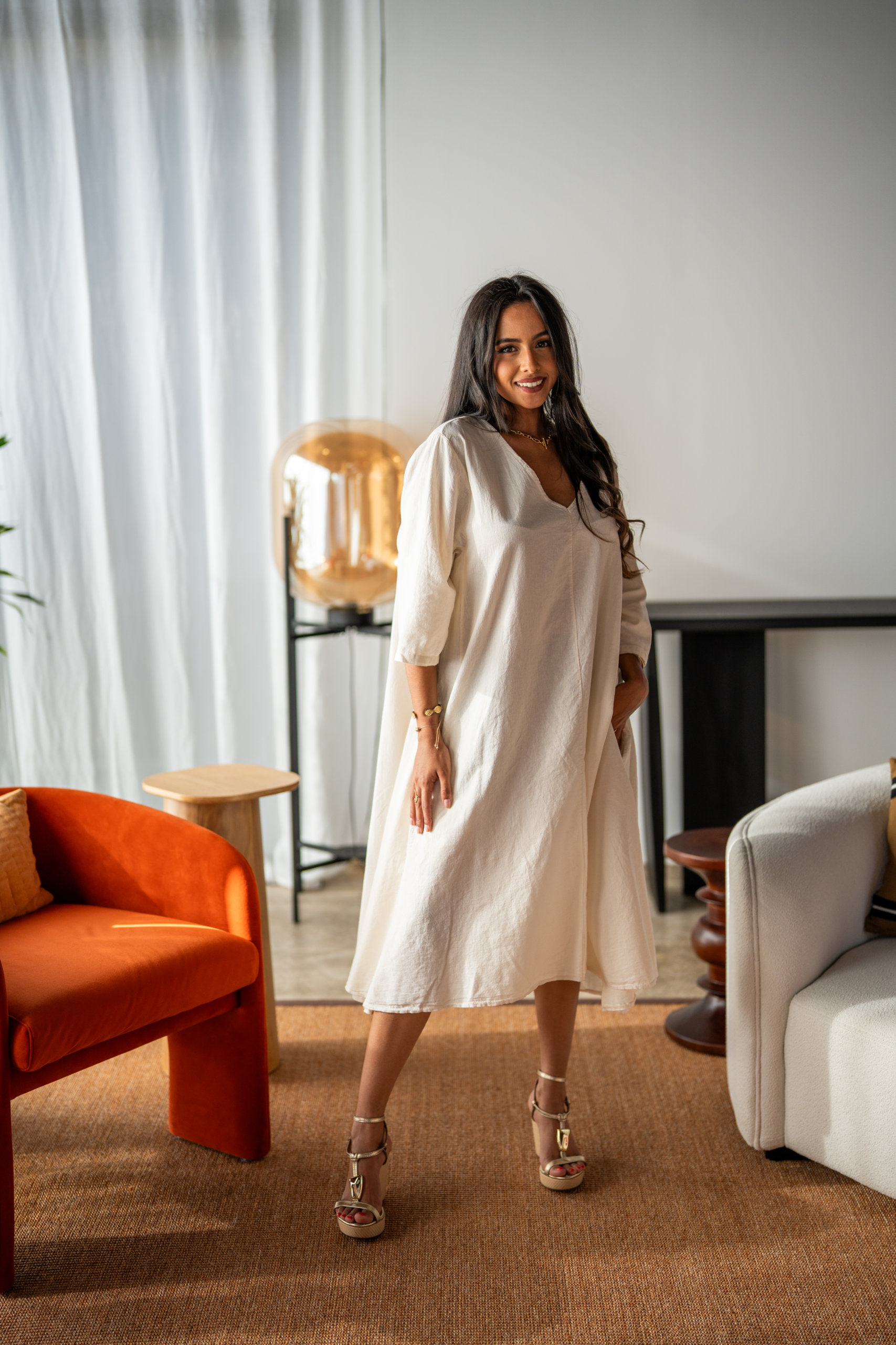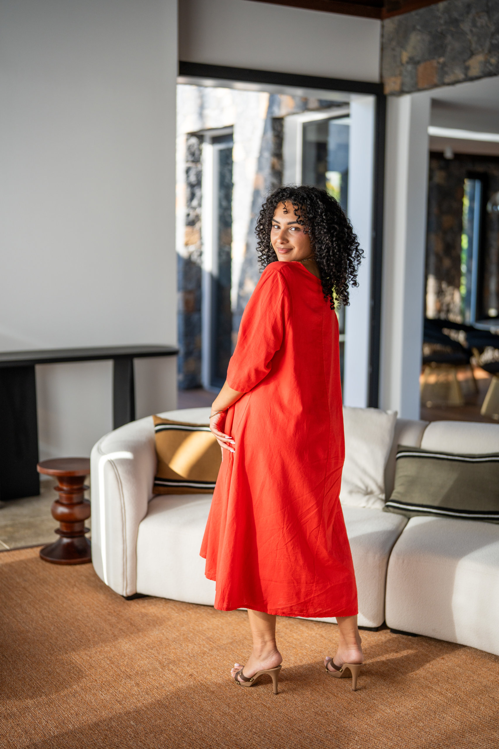 Robe mi longue à manches 3/4 dans une coupe droite, légère et agréable à porter dans sa matière en coton et en lin.