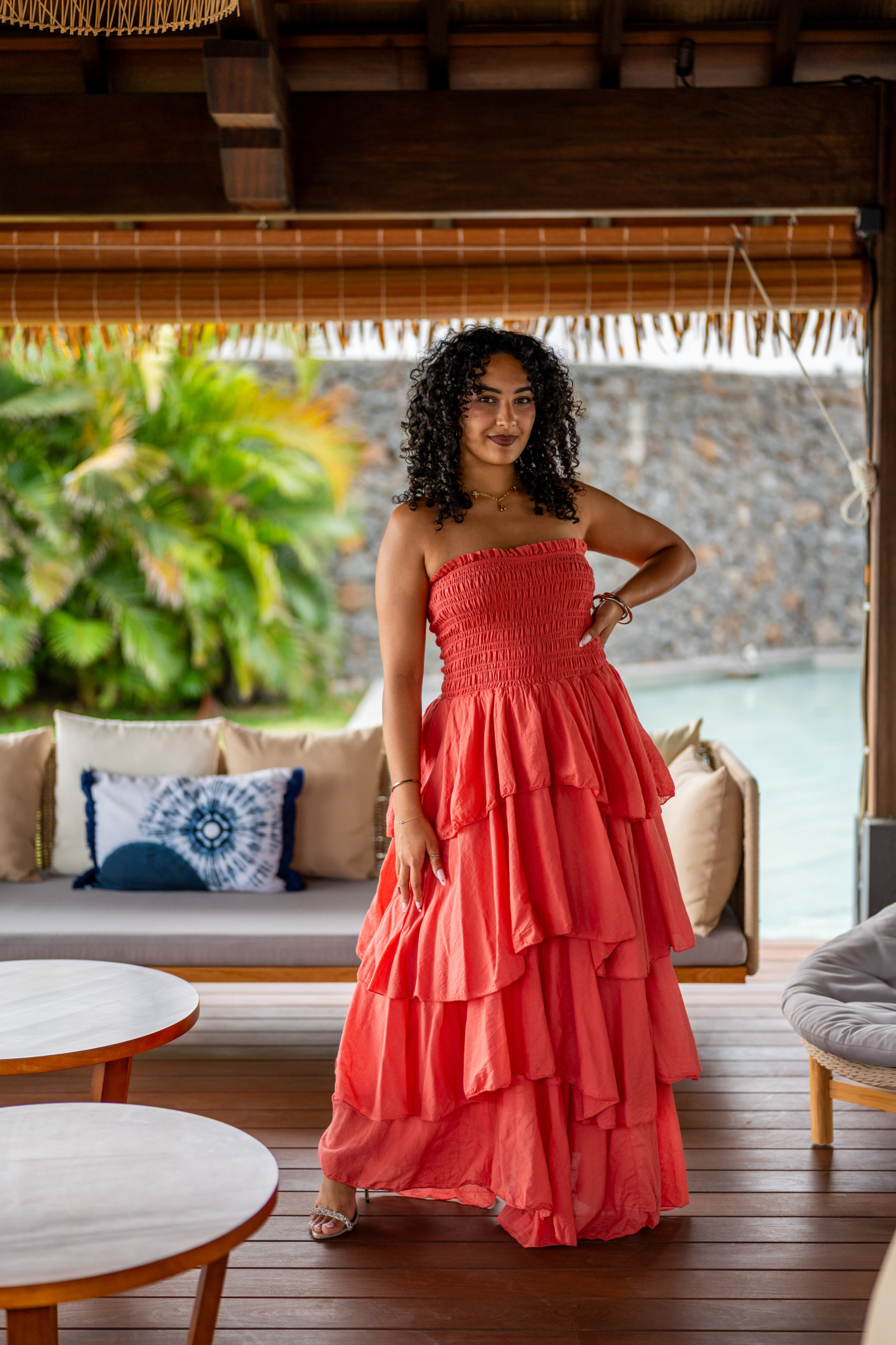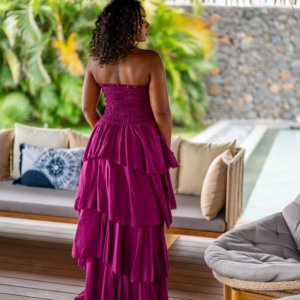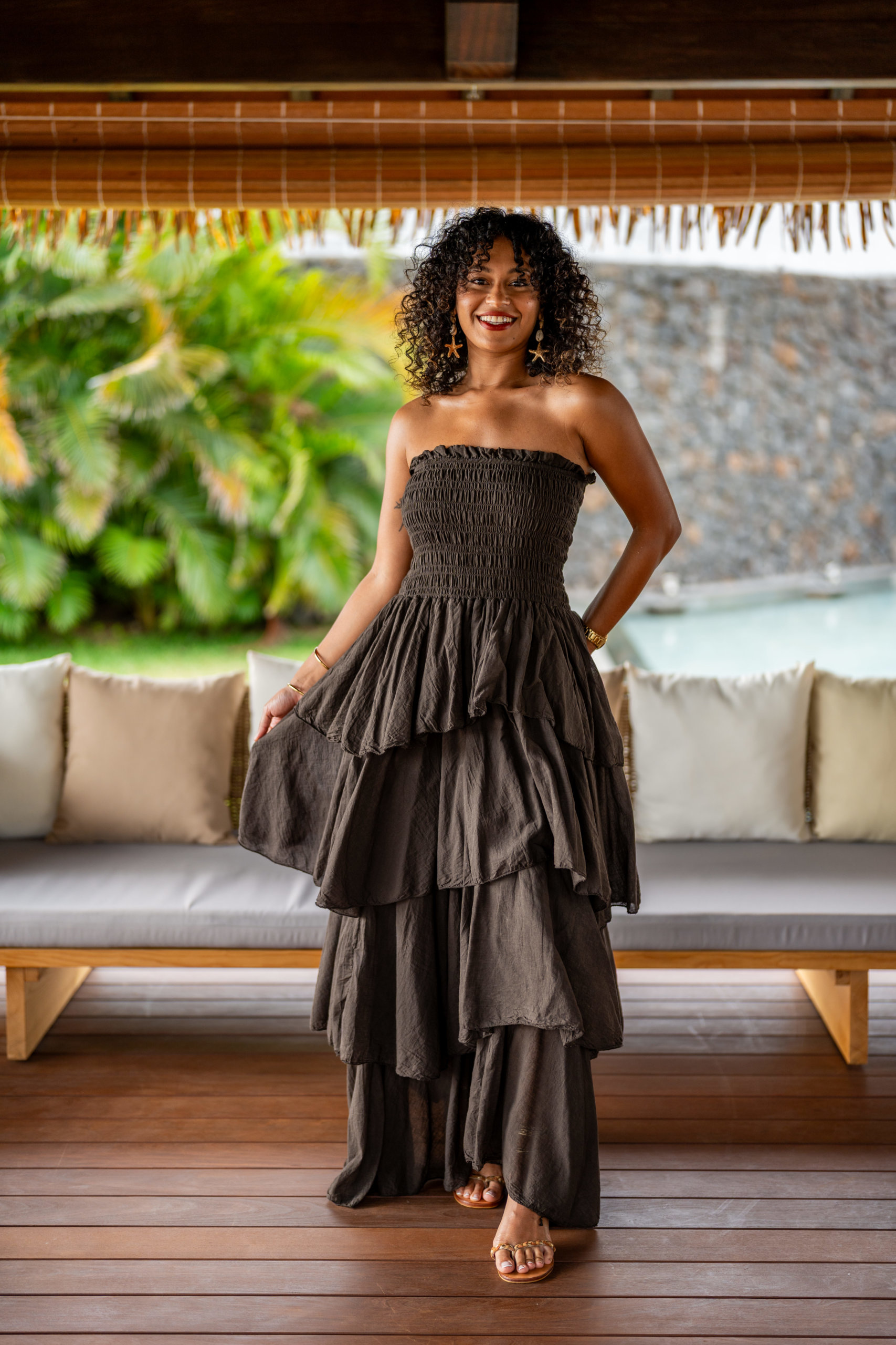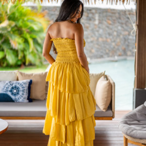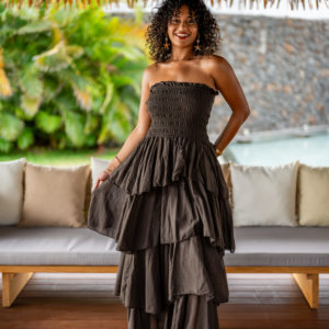 Robe longue effet volante avec son bustier élasthanne. La robe est en gaz de coton.