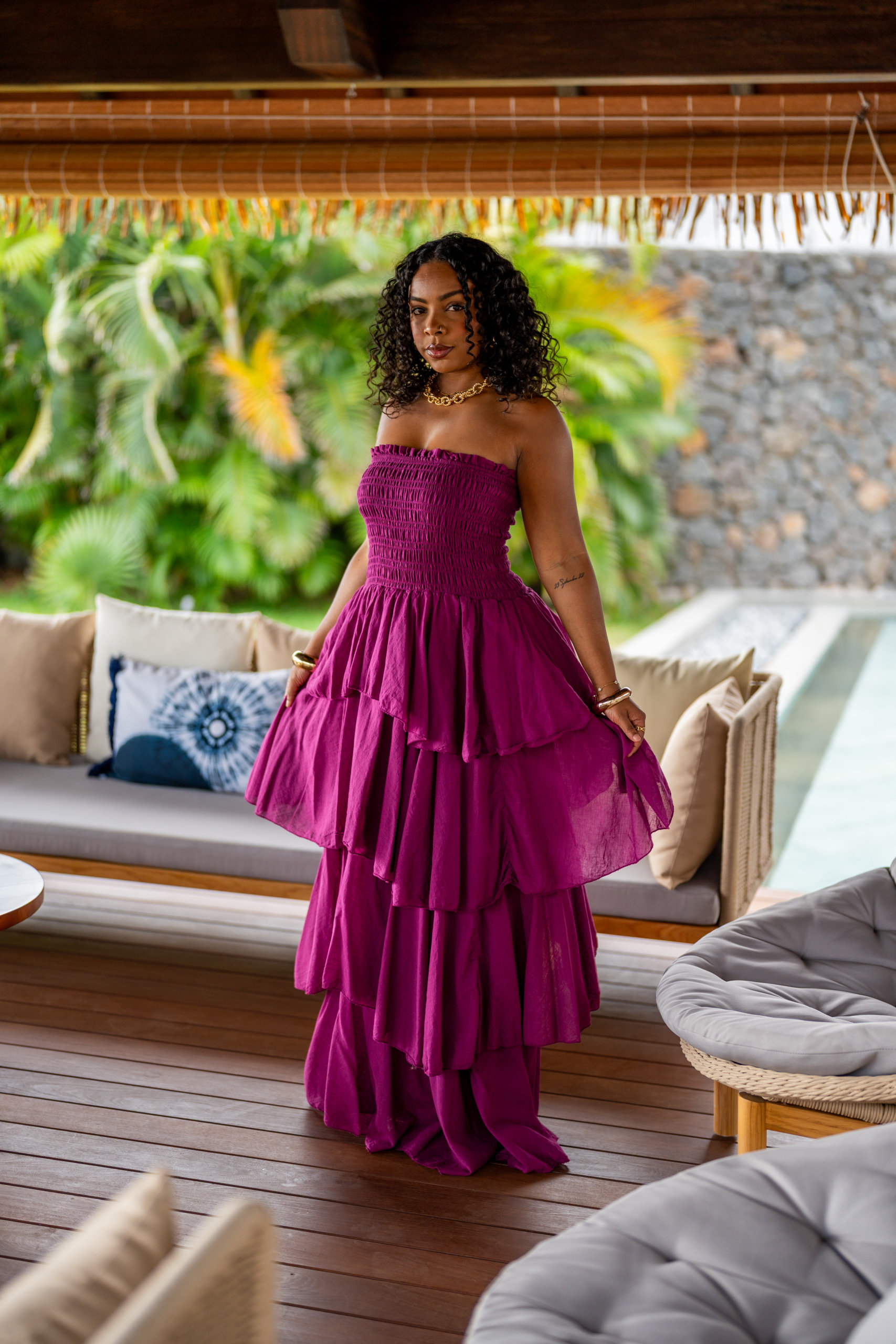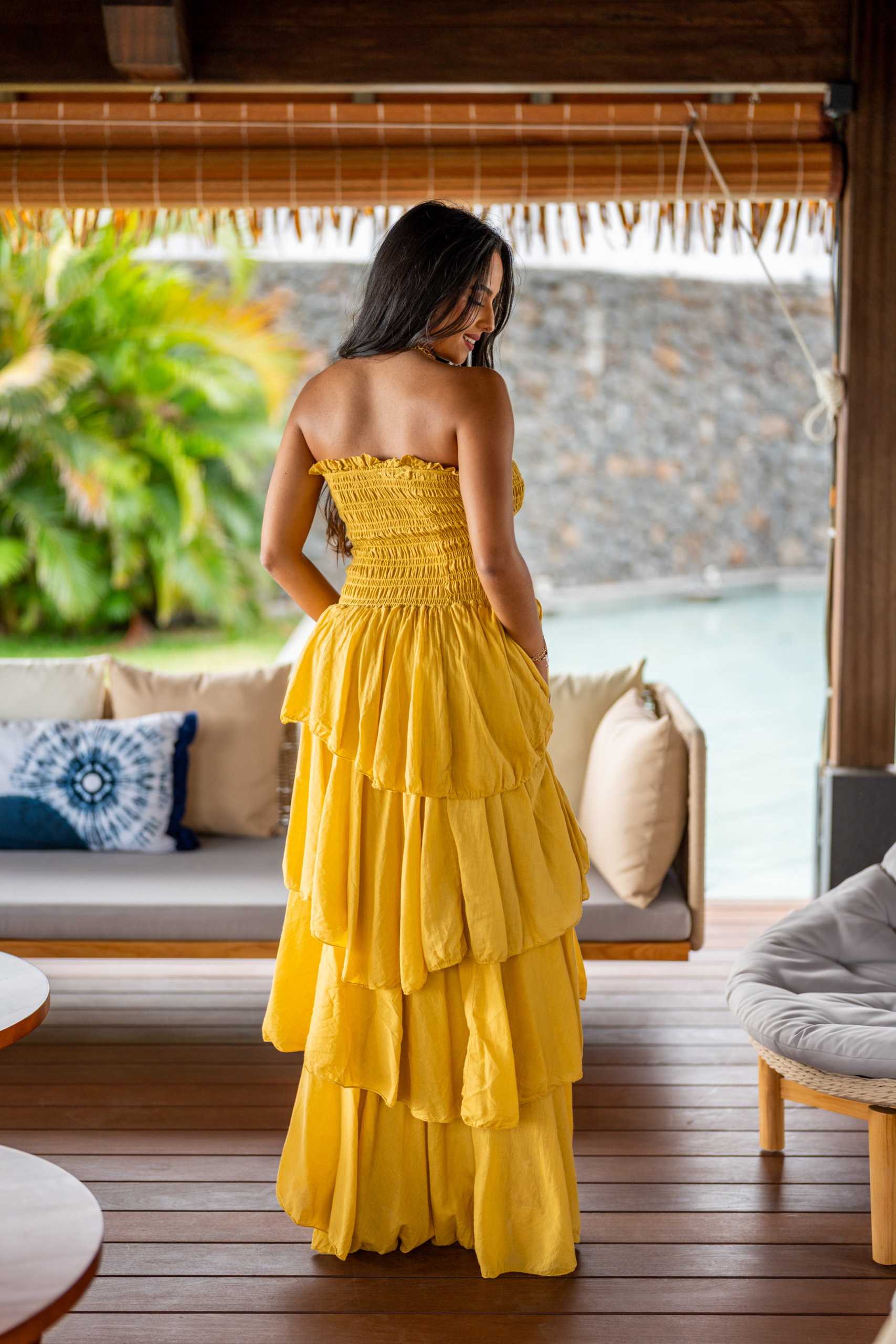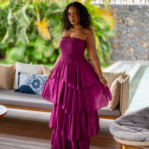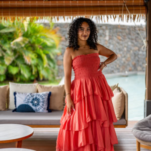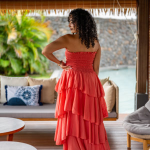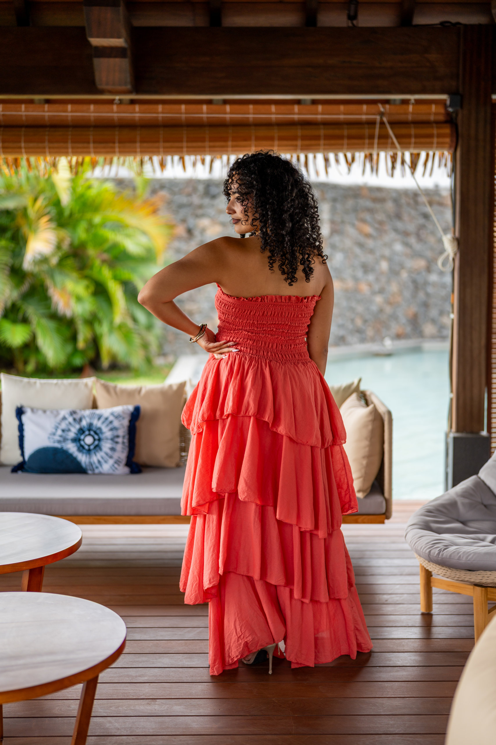 Robe longue effet volante avec son bustier élasthanne. La robe est en gaz de coton.