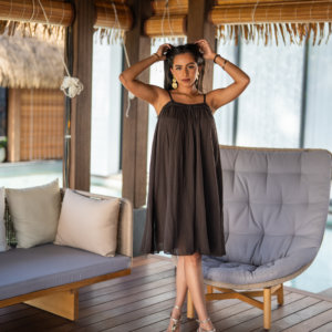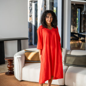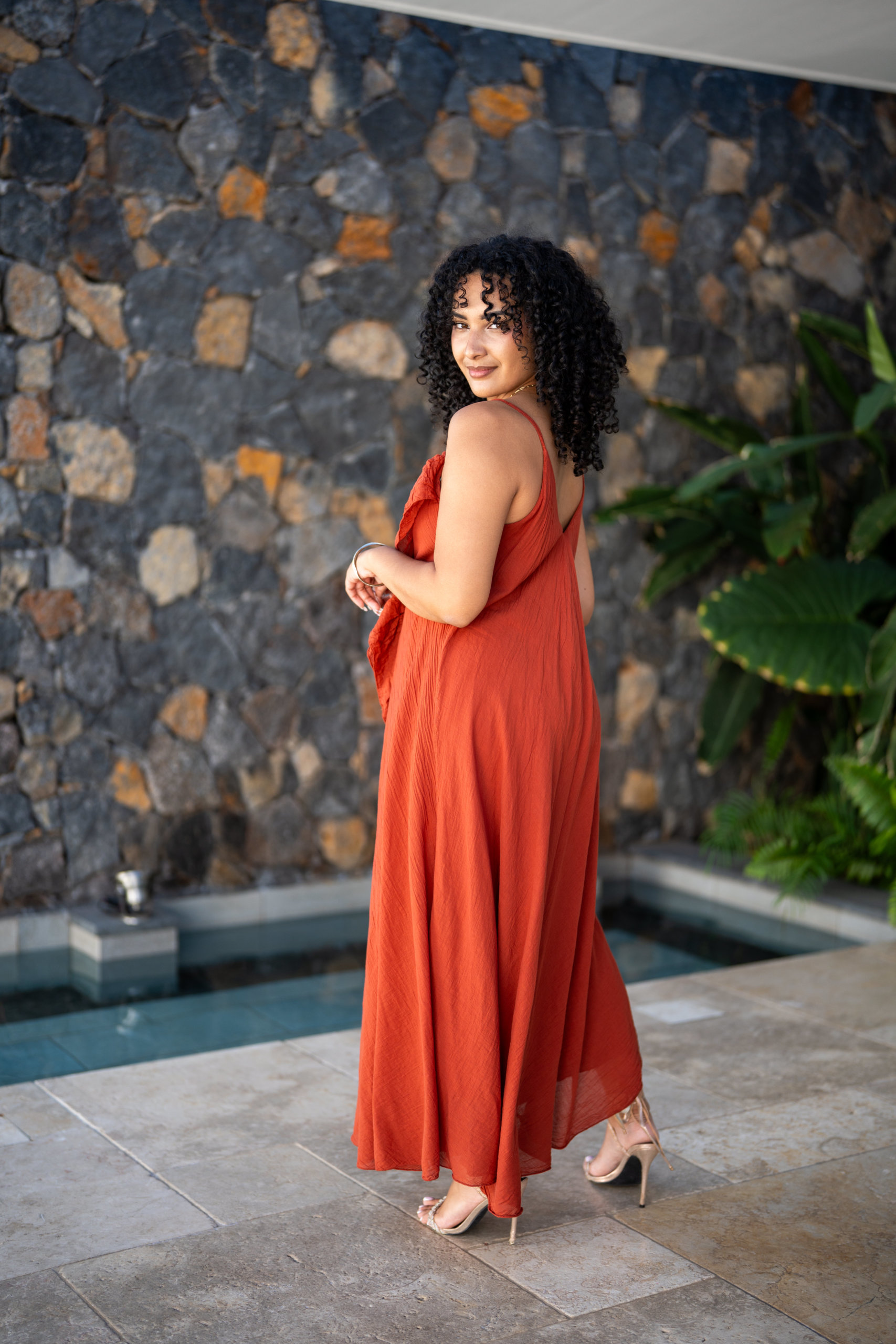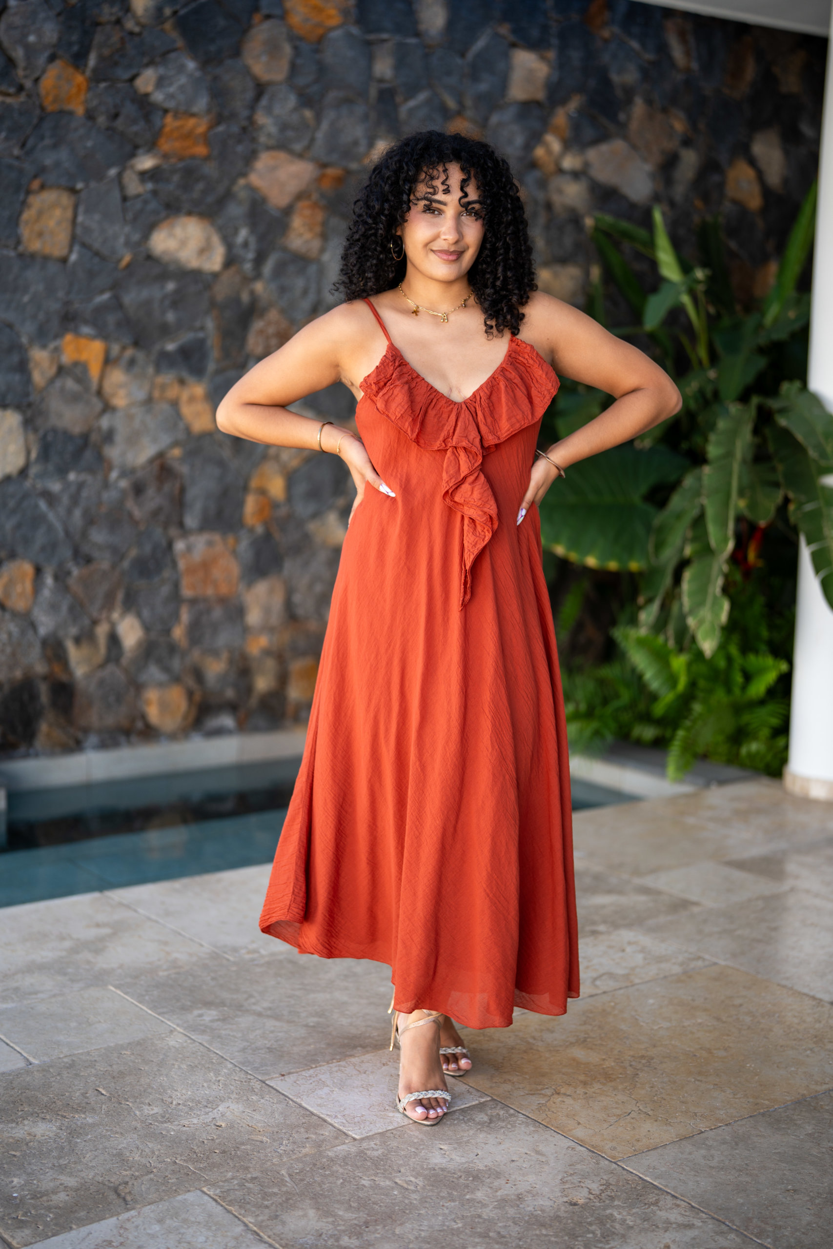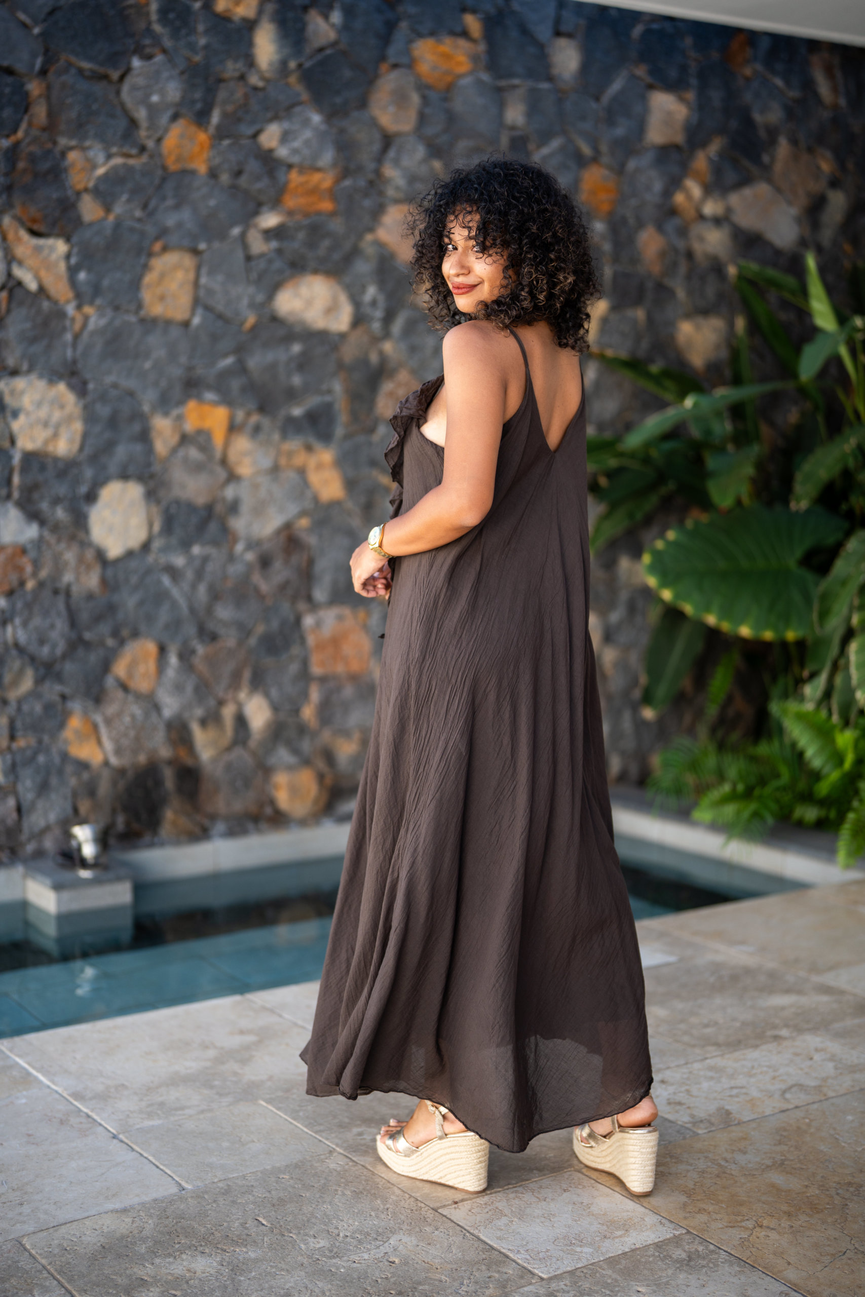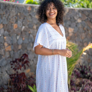 Robe longue à bretelles, légère et agréable à porter en été dans une matière en voile de coton; Elle est doublée.