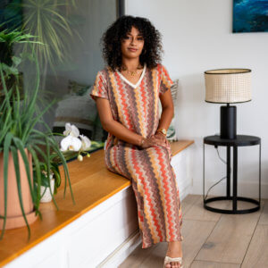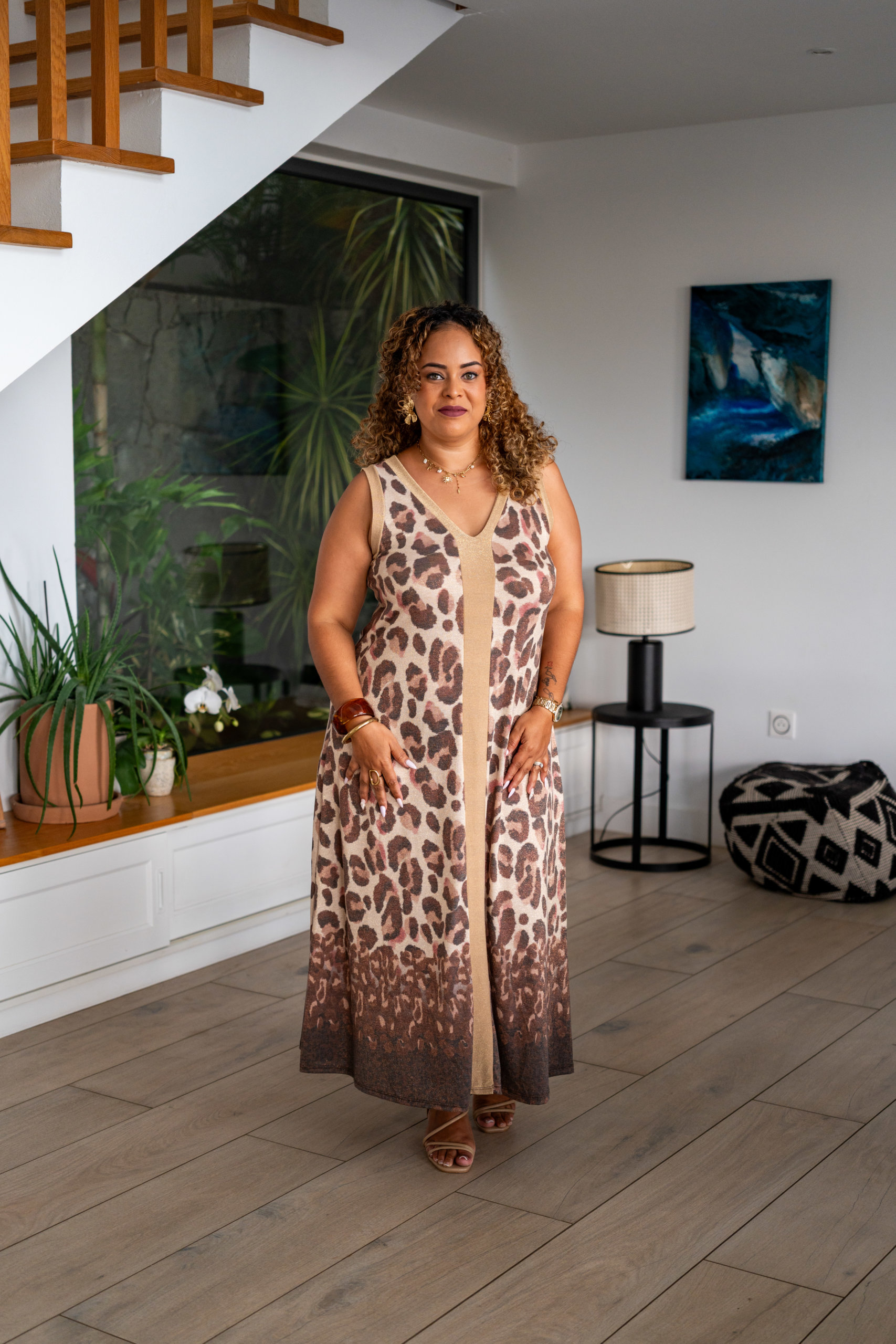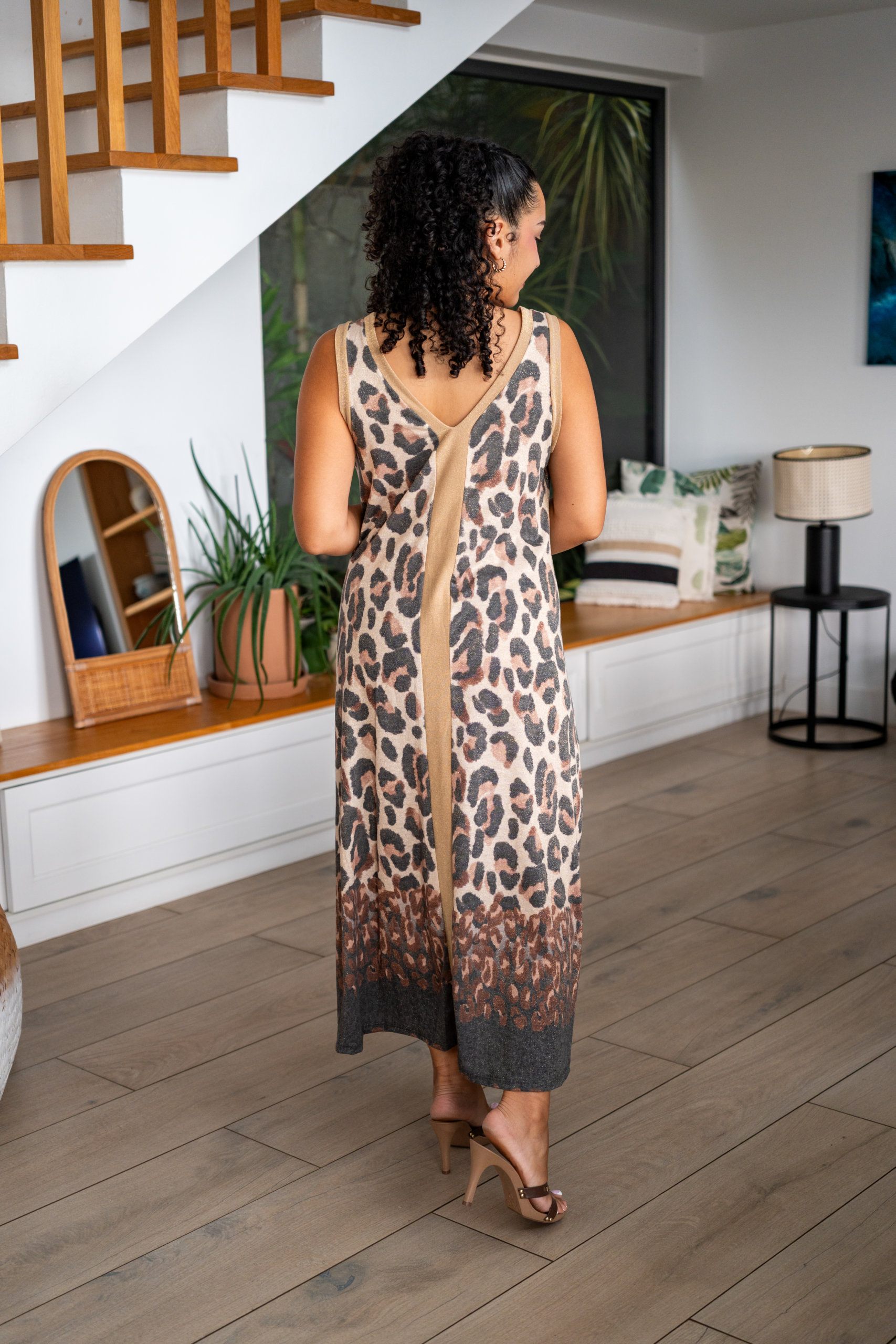 Robe longue, dans une coupe droite sans manches, avec son imprimé brillant léopard et son liserai au niveau de son col en V jusqu’à dans le bas.