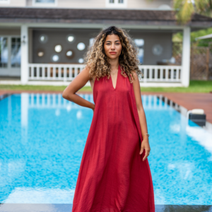 Robe longue, dans une coupe droite à manches courtes, avec son imprimé brillant léopard et son liserai au niveau de son col en V.