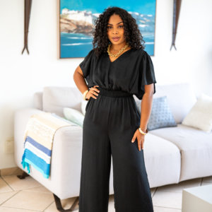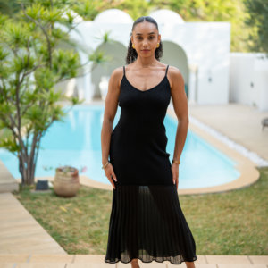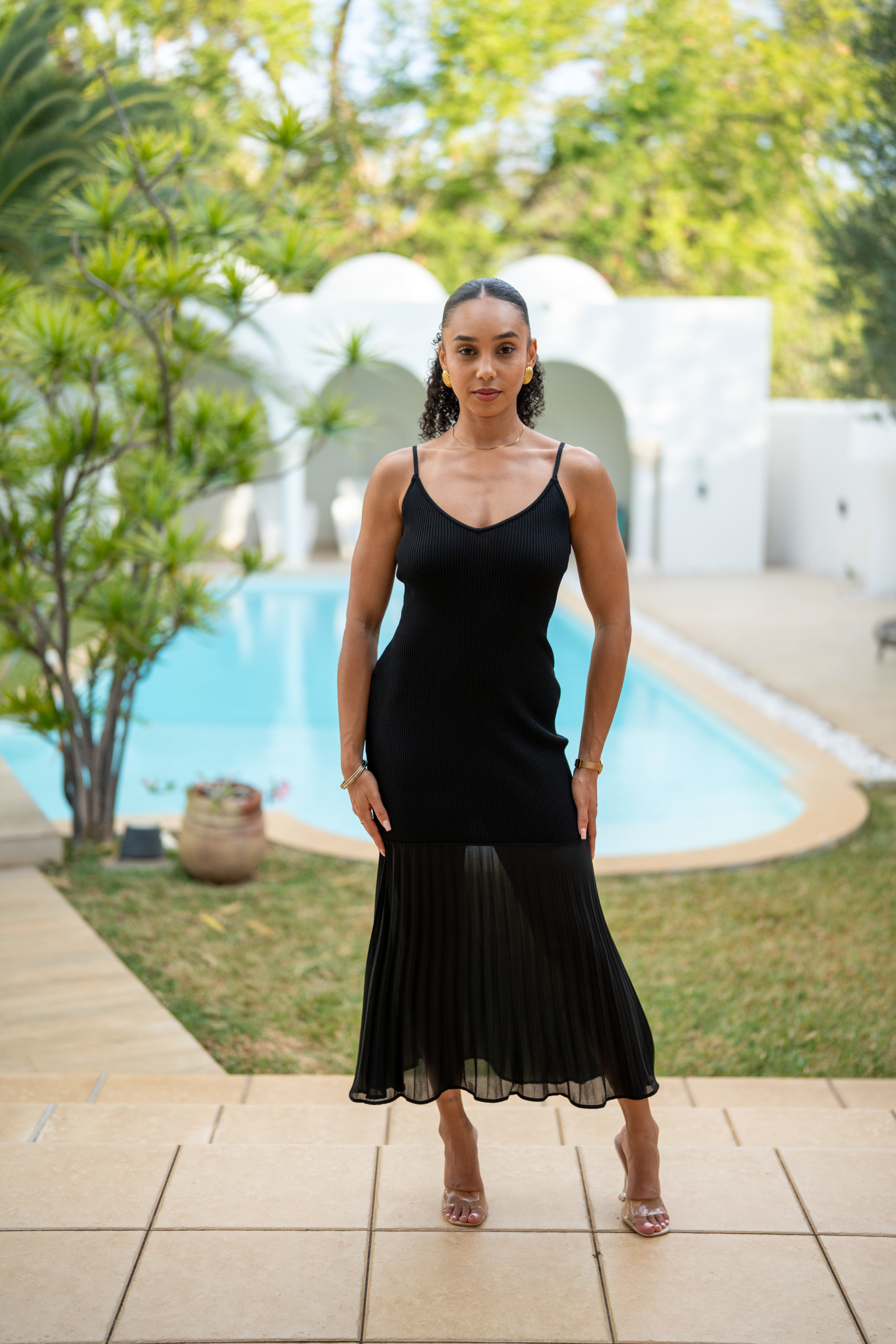 Robe longue à bretelles avec dans son bas, un voilage plissée. Elle est doublée.