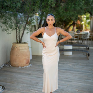 Robe longue à bretelles dans une bi matière légère avec sa coupe originale dans son haut.