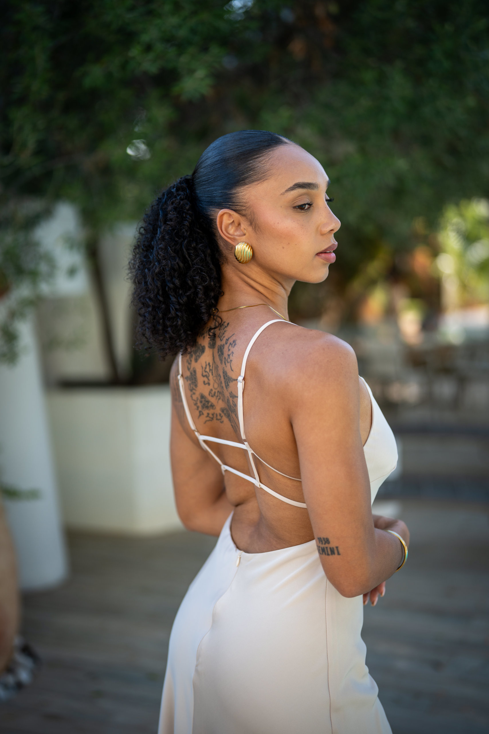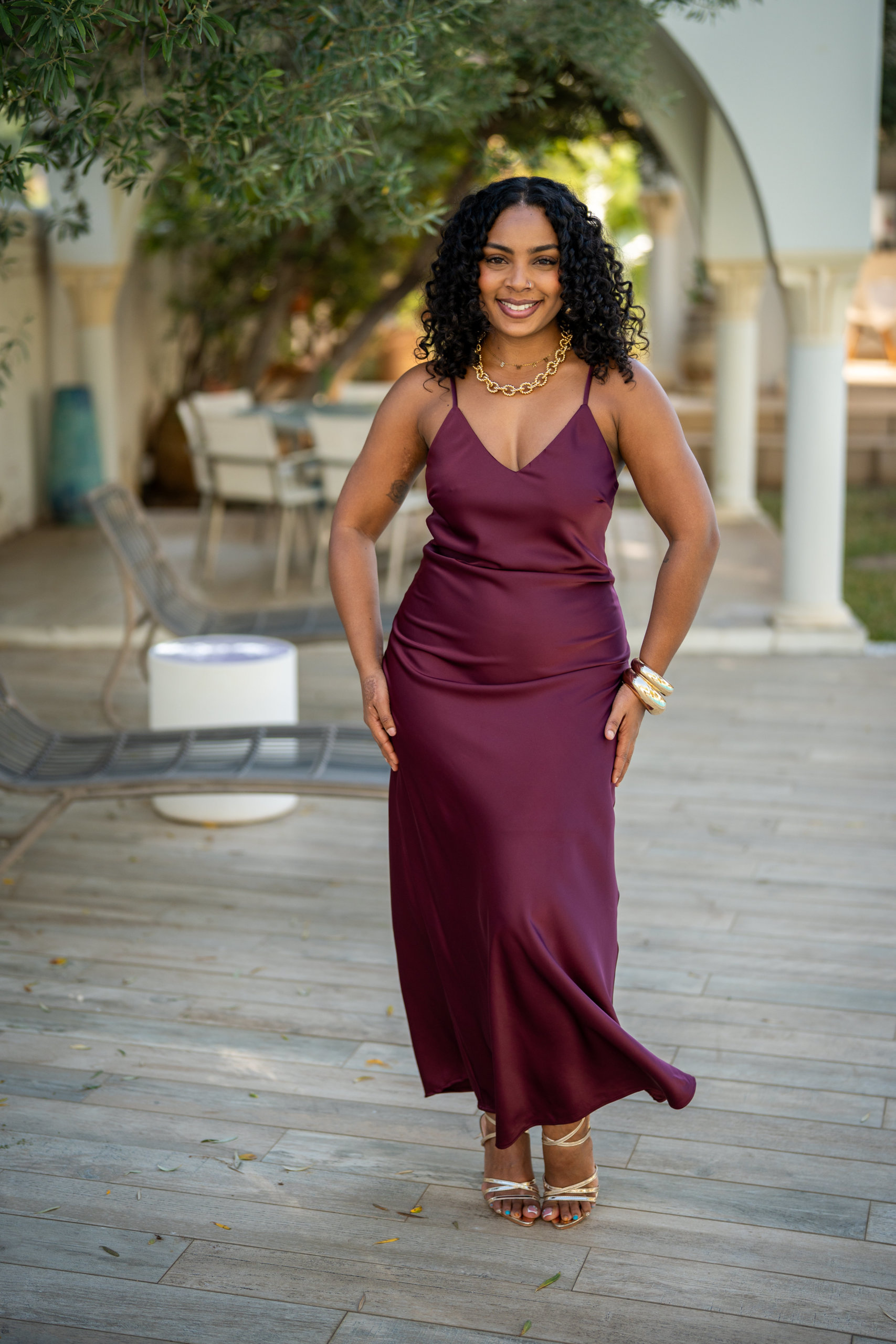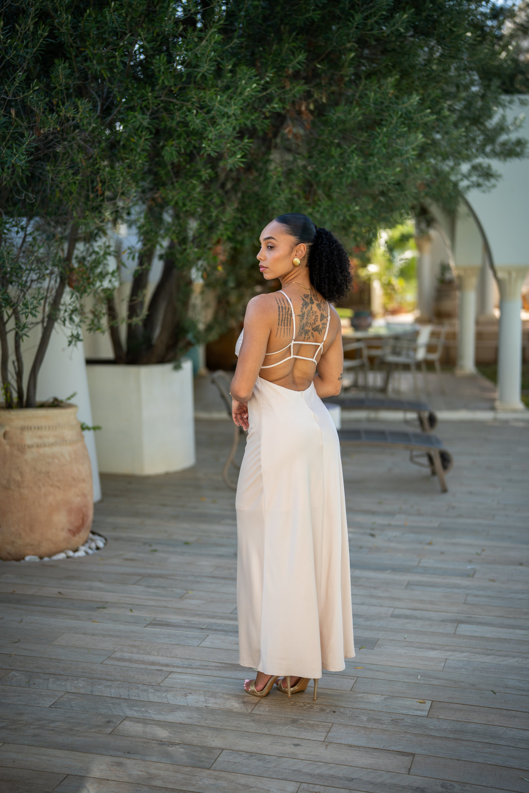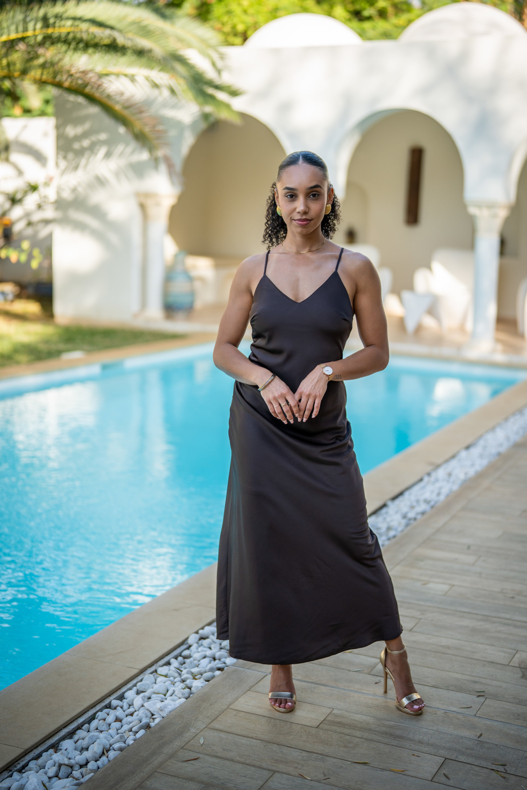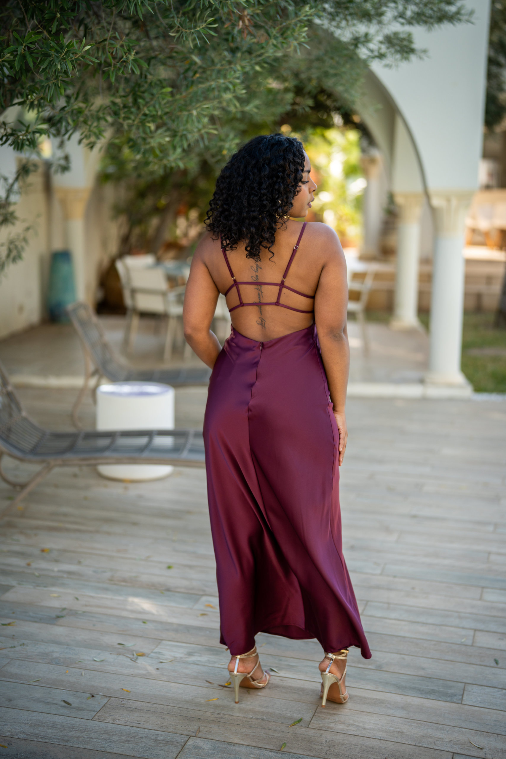 Robe moulante longue à bretelles unie satinée ouverte dans le dos. Elle est doublée.