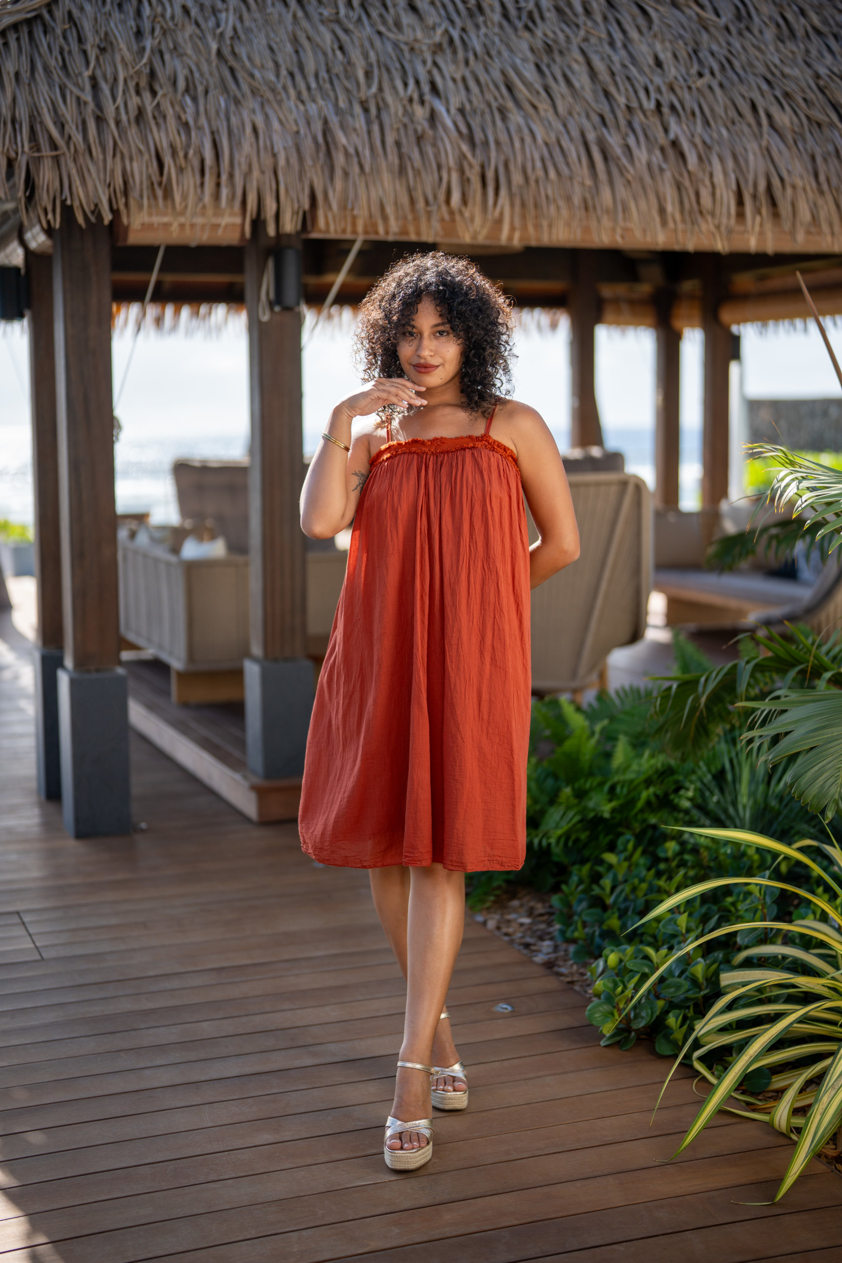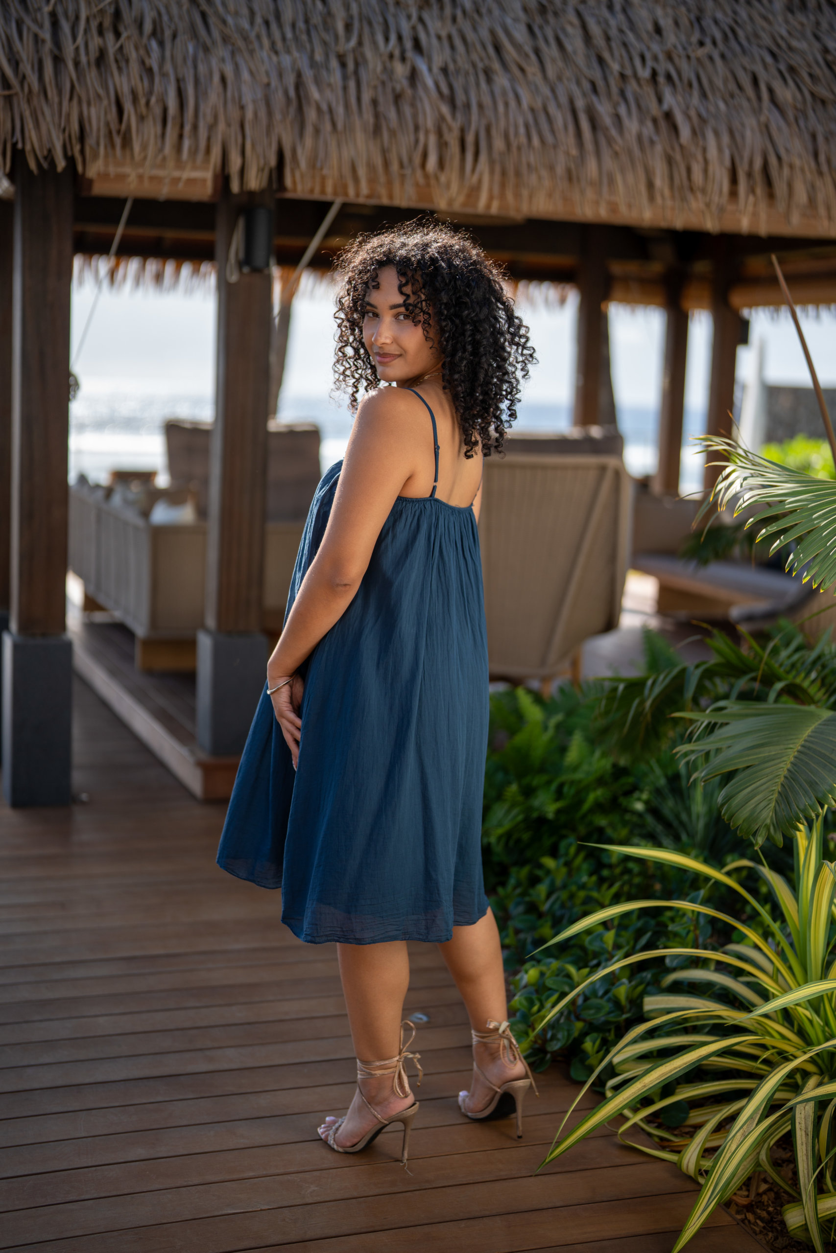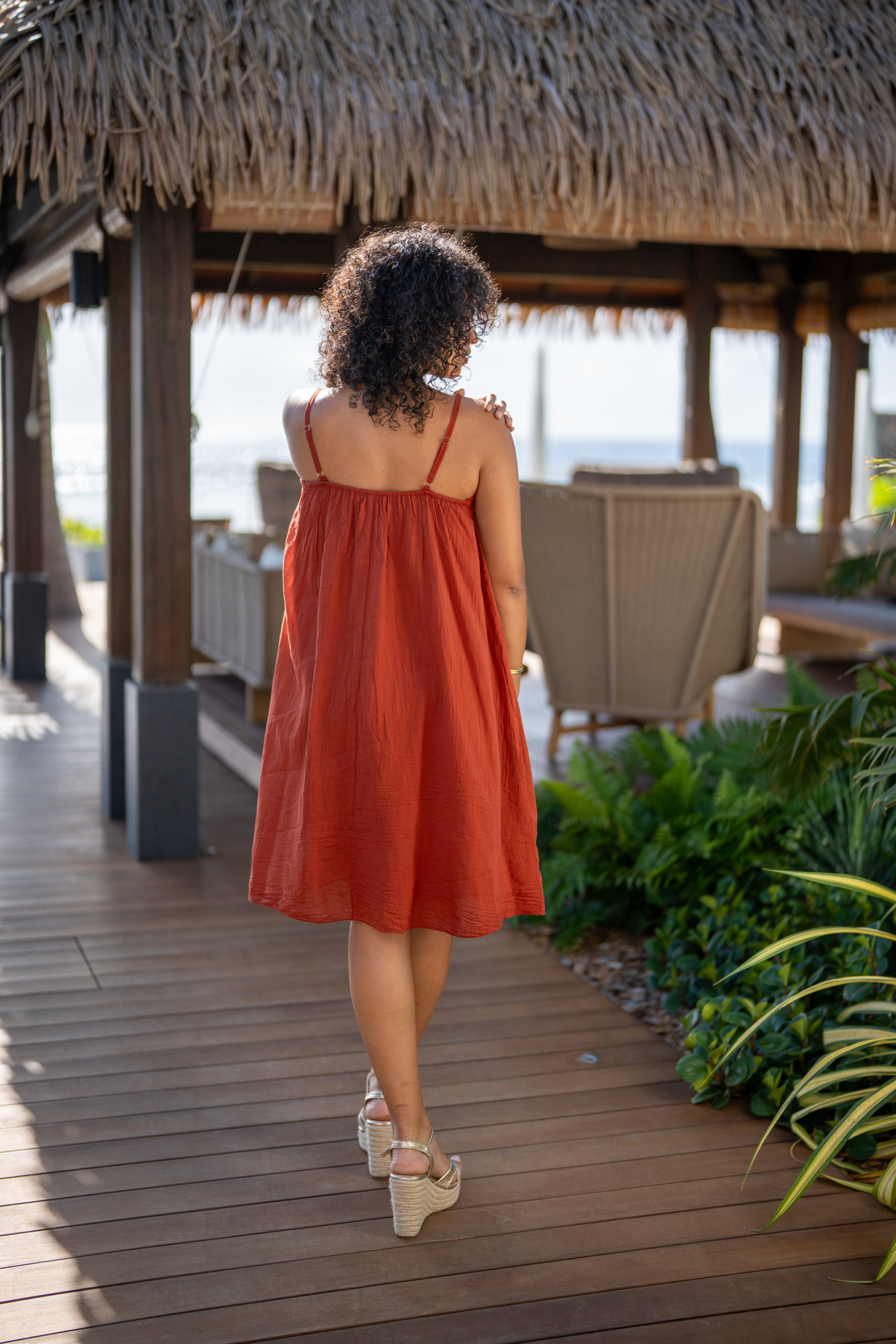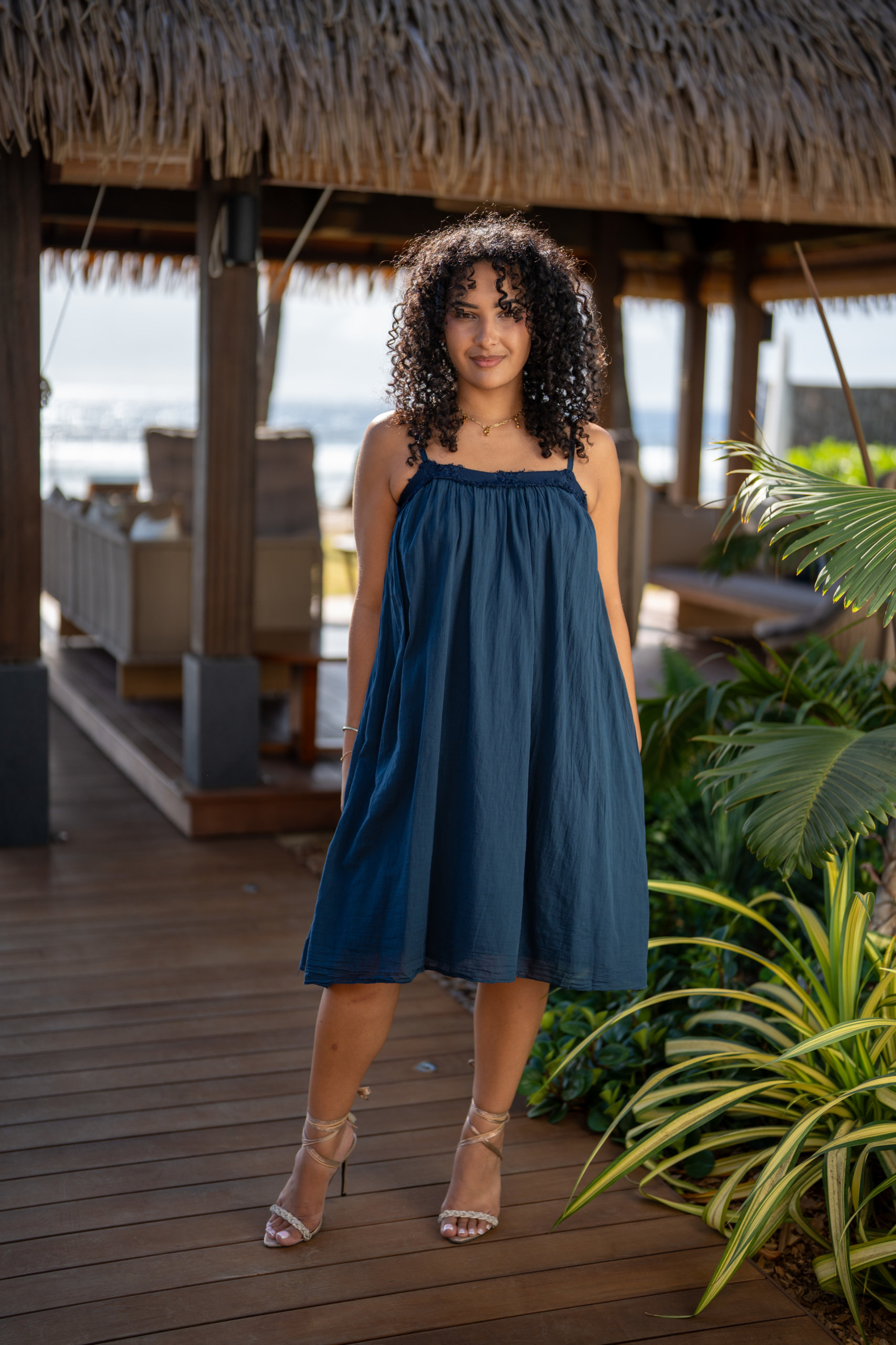 Robe courte à bretelles, légère et agréable à porter en été dans une matière en voile de coton; Elle est doublée.