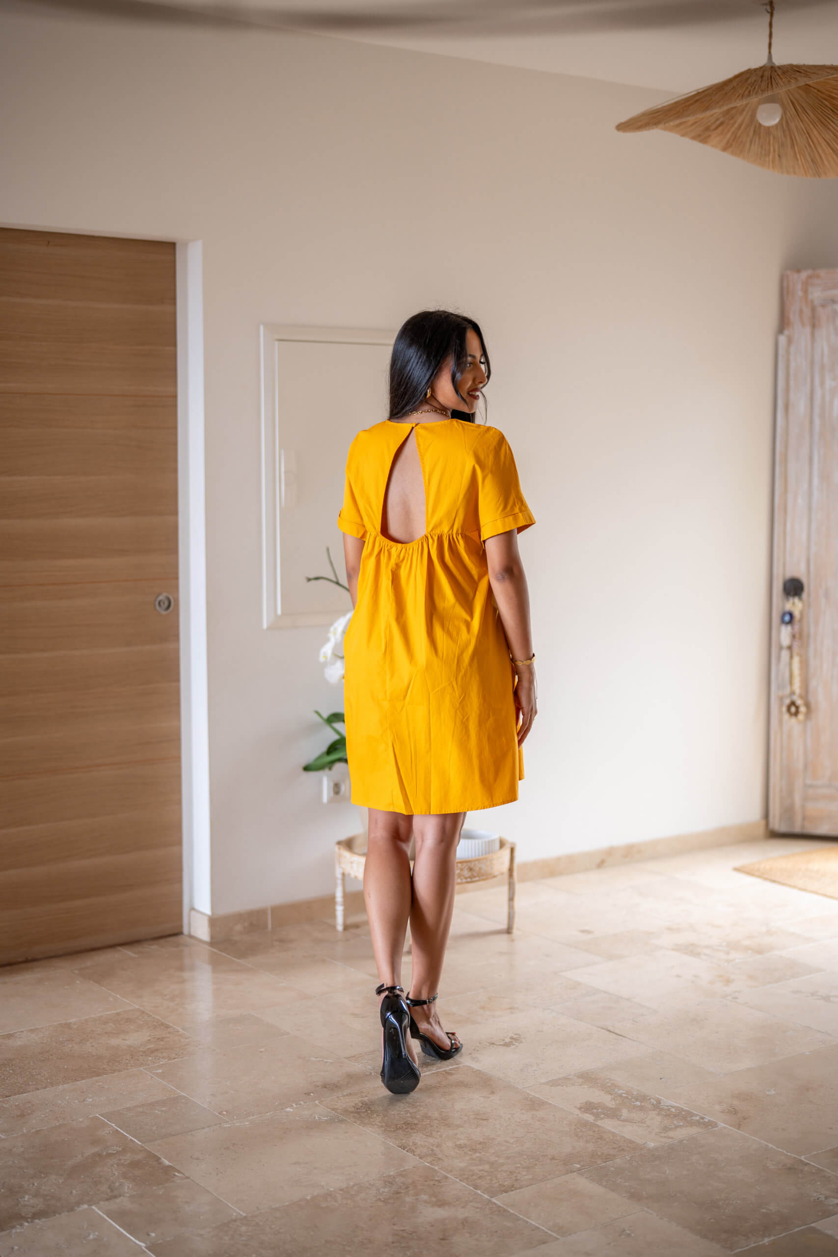 Robe courte coupe babydoll, Ã manches courtes avec une ouverture en V au dos.