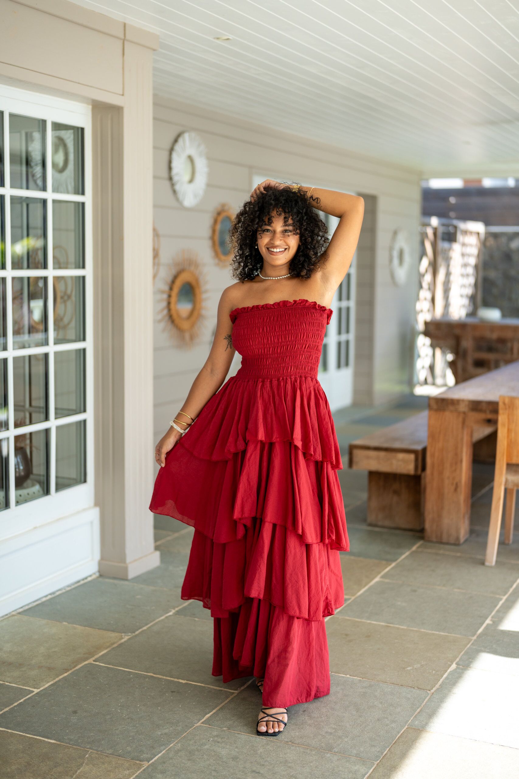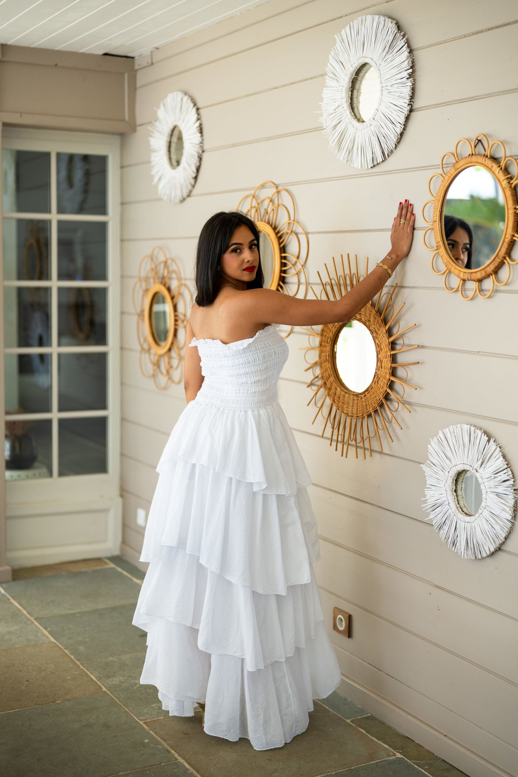 Robe longue bustier, avec ses volants dans le bas. Elle est légère et agréable à porter, dans une matière en voile de coton.