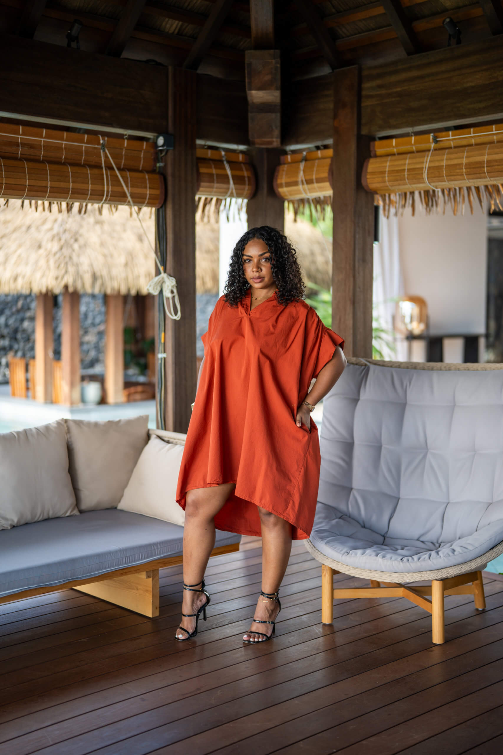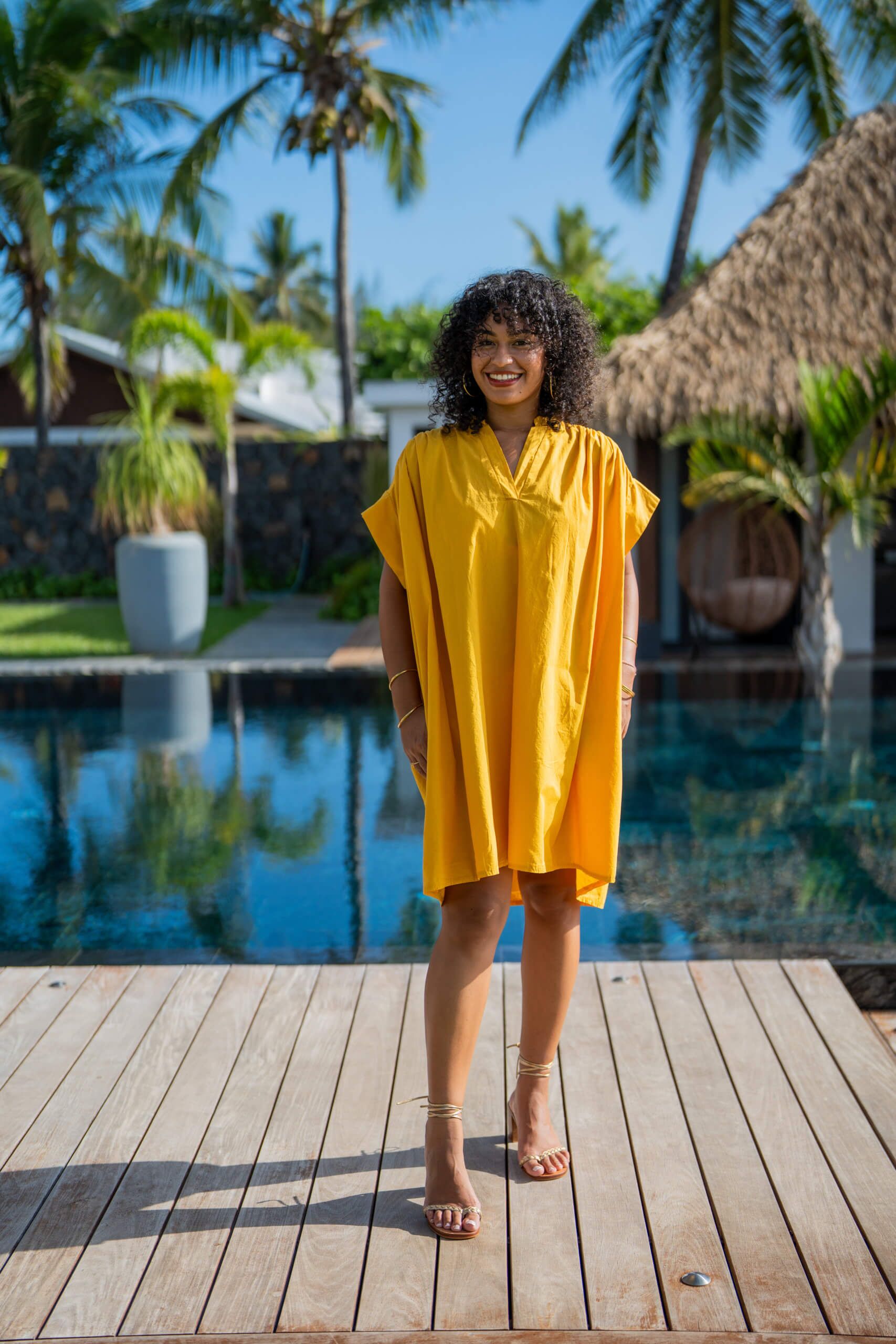 Robe courte unie à manches courtes avec son col V et ses plis dans le haut.