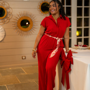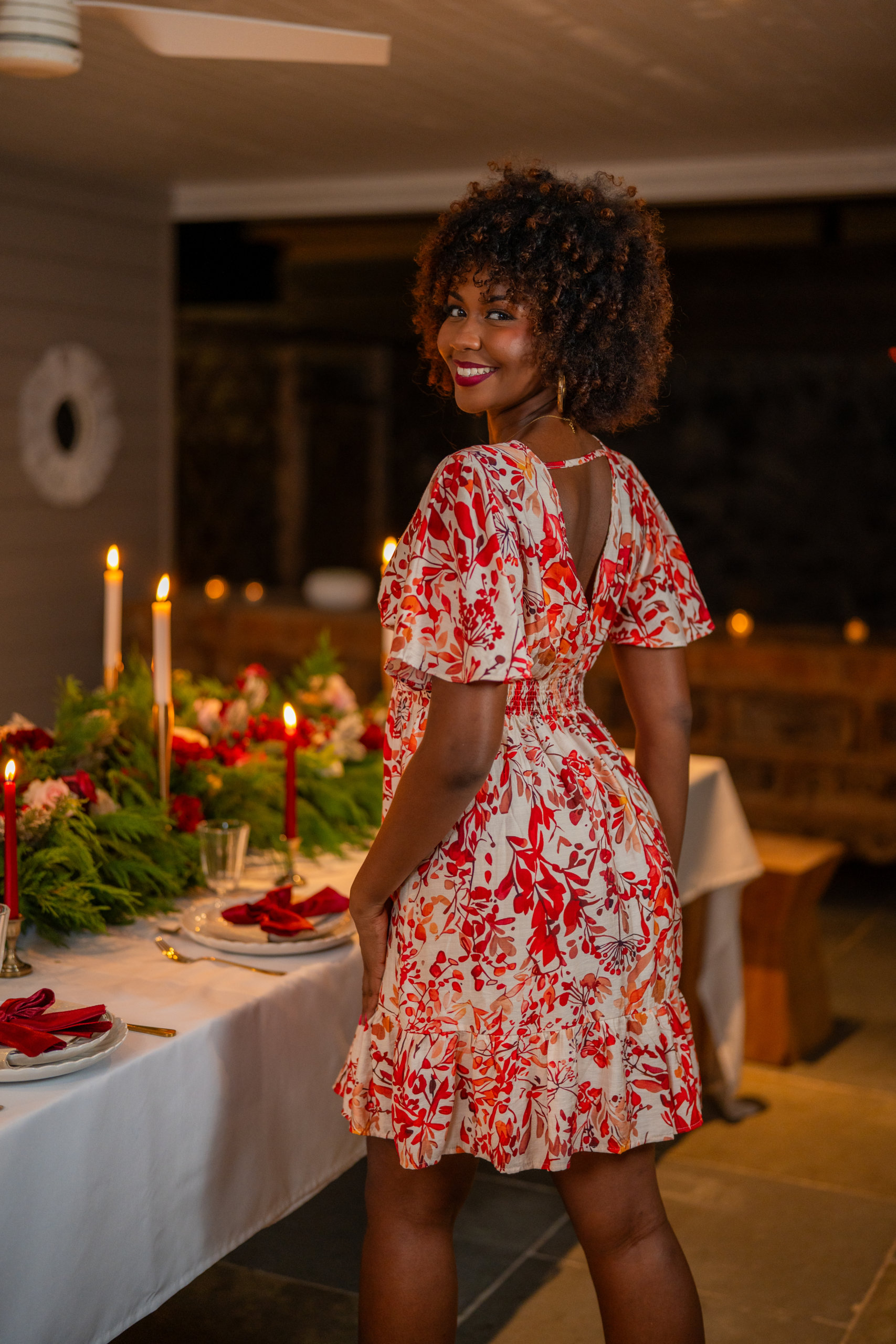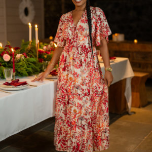 Robe longue imprimée à fleurs à manches courtes avec son attache dans le dos. Elle reste dans un esprit festif avec ses reflets brillants dorés dans ses motifs.