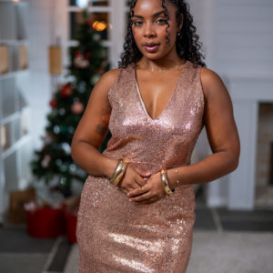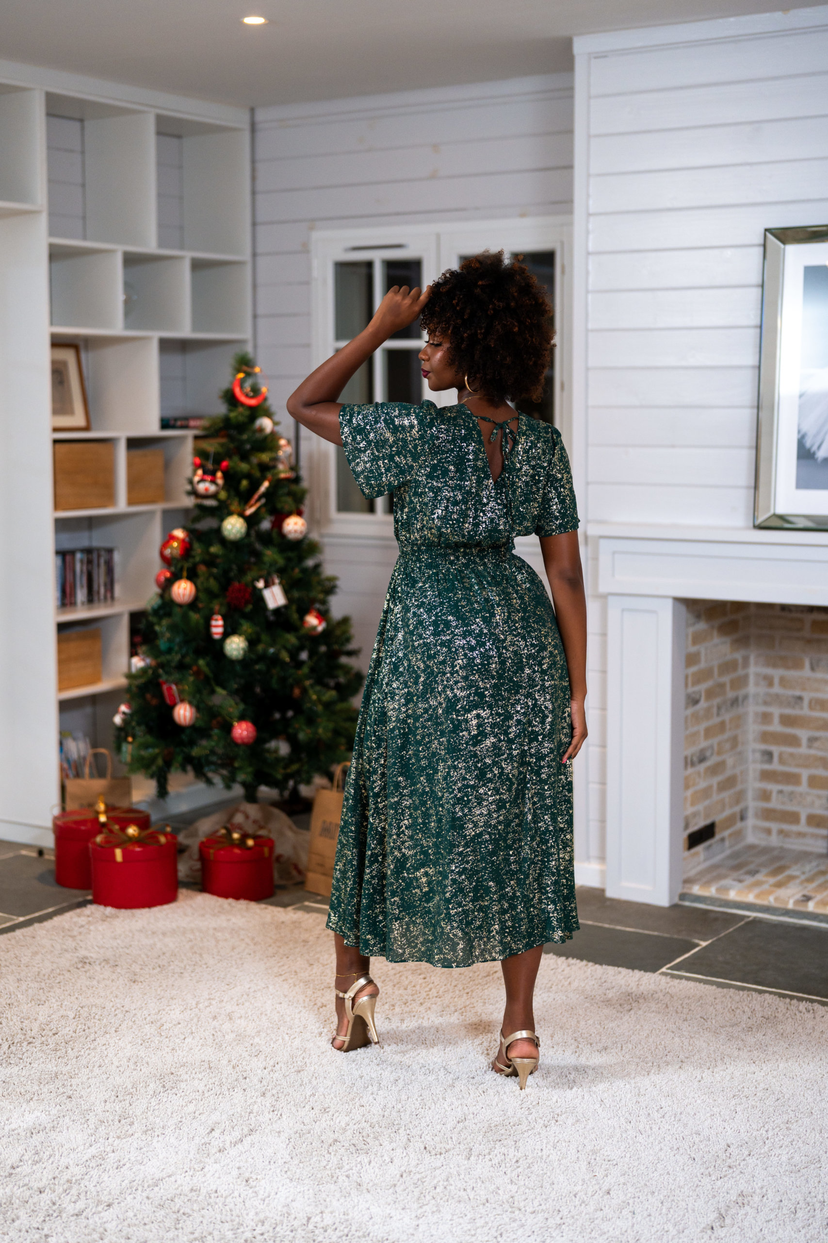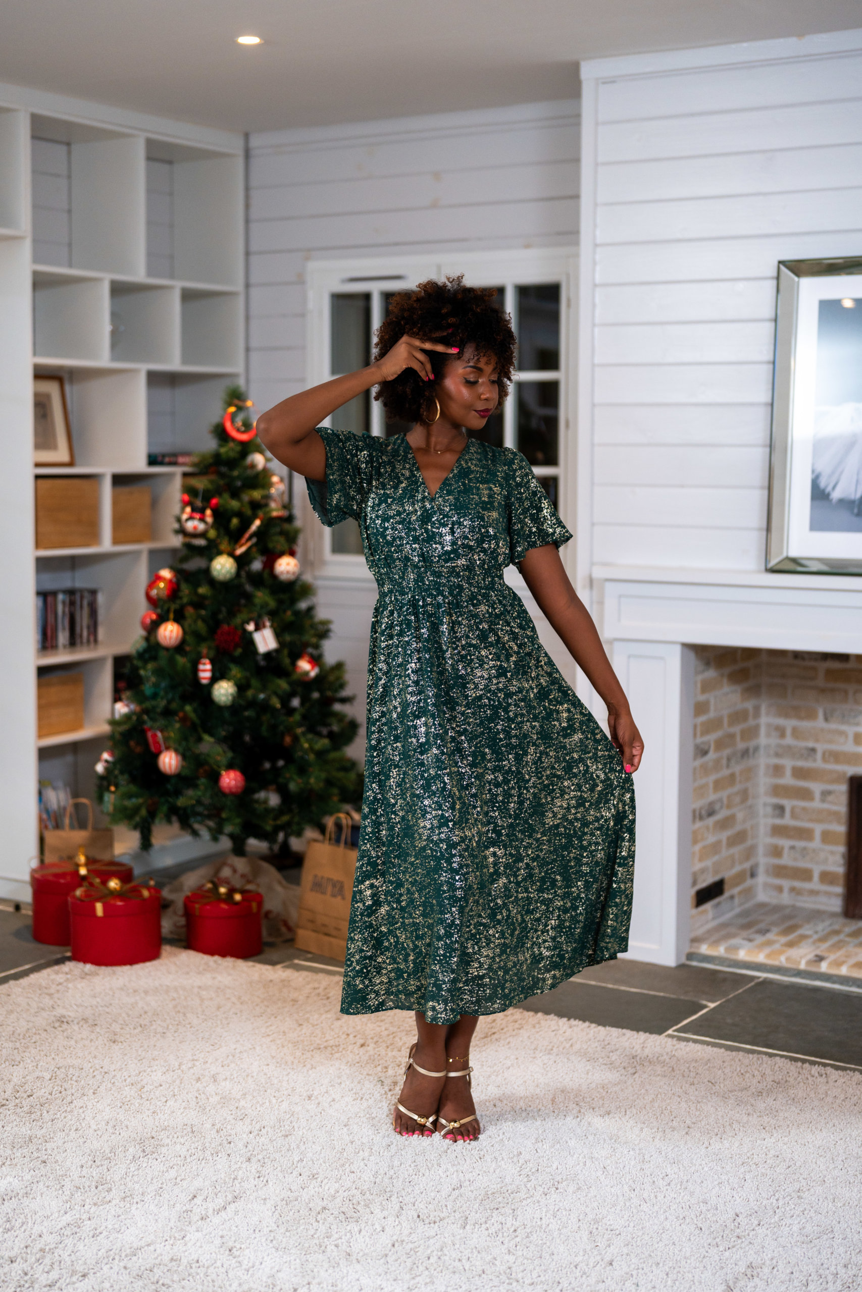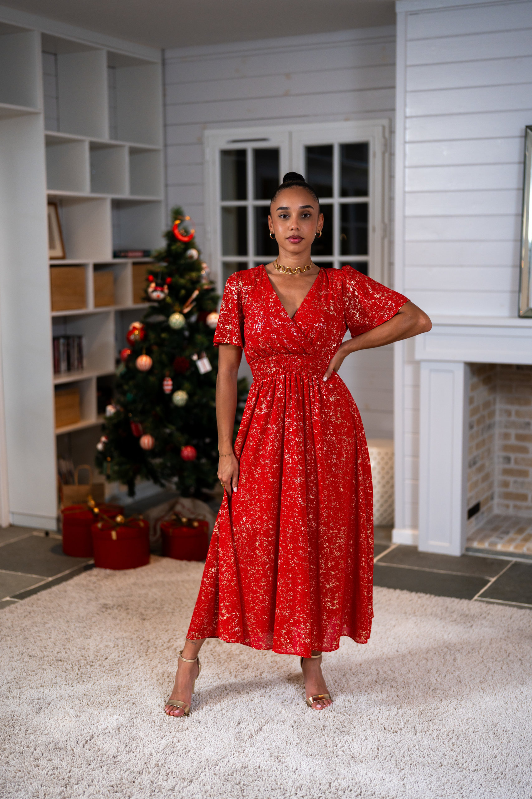 Robe longue imprimée à tâches dorées brillantes avec son attache au dos; Elle est doublée.