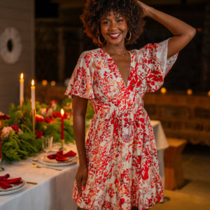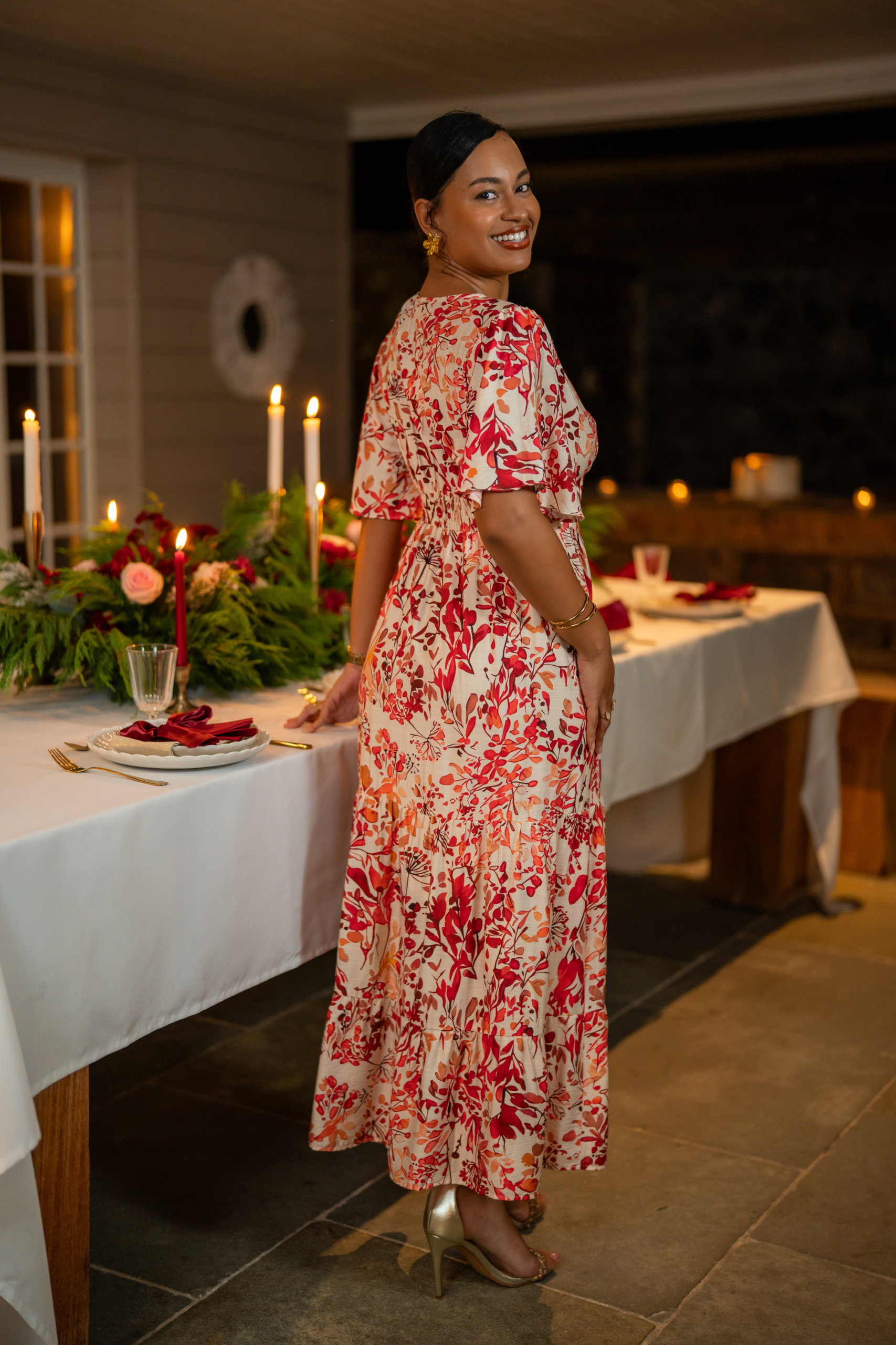 Robe longue imprimée à fleurs à manches courtes avec son attache au niveau de la poitrine. Elle reste dans un esprit festif avec ses reflets brillants dorés dans ses motifs.