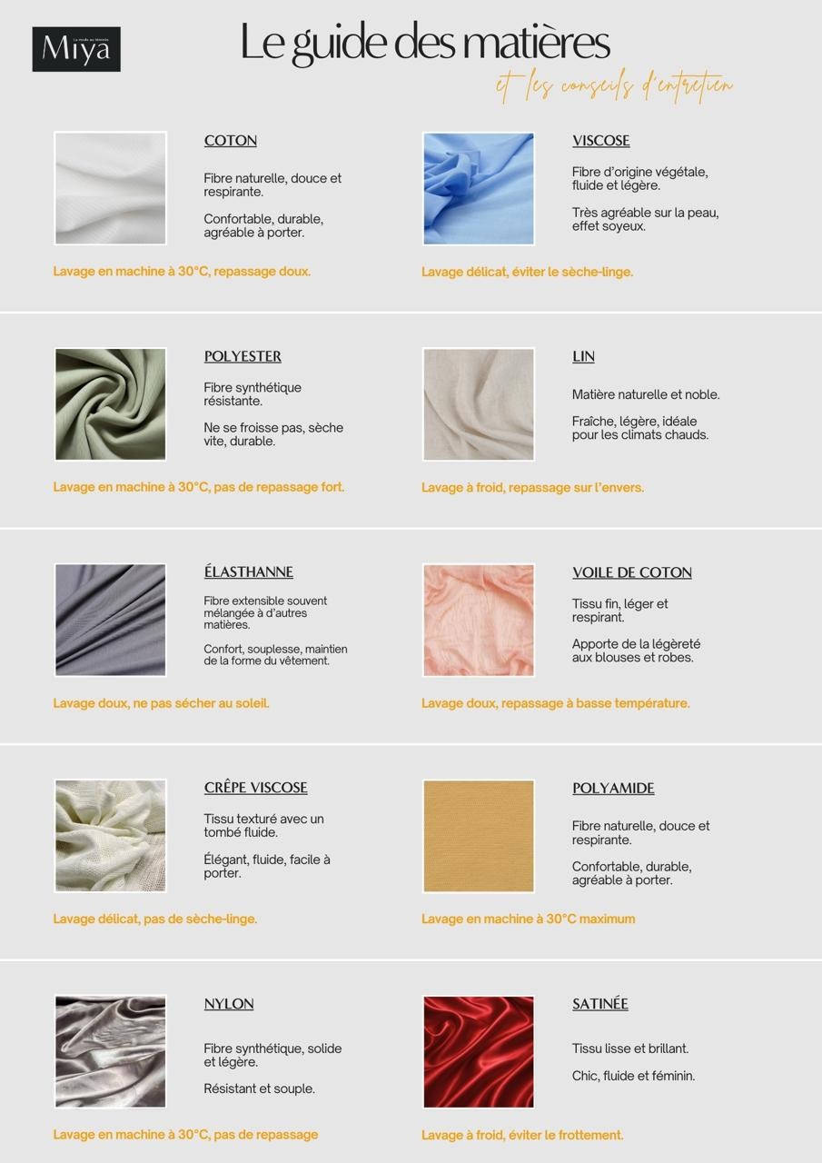 - Le Lin : Demande un lavage à froid et un repassage sur l'envers pour conserver son aspect noble.