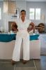 Pantalon fluide uni dans une matière chic et habillée. C'est un pantalon pincé au niveau des poches, avec son bas large.